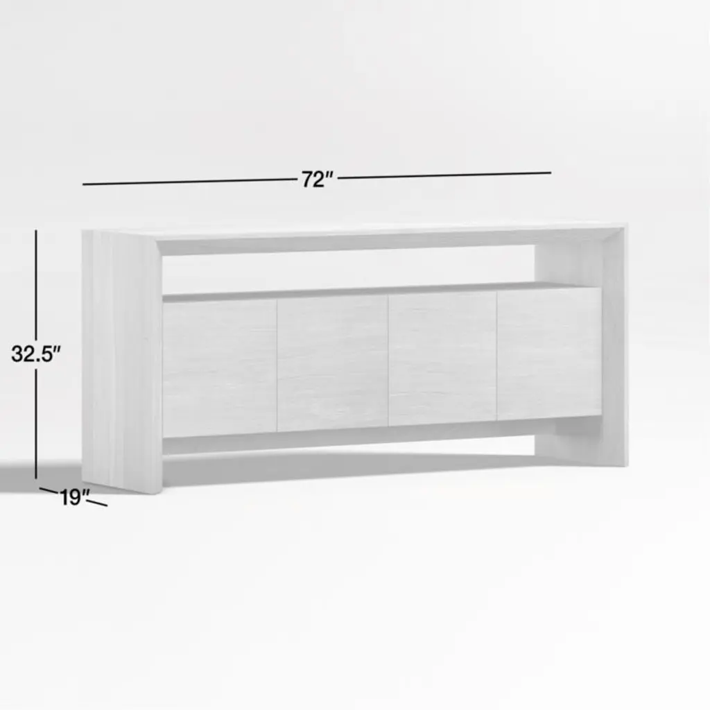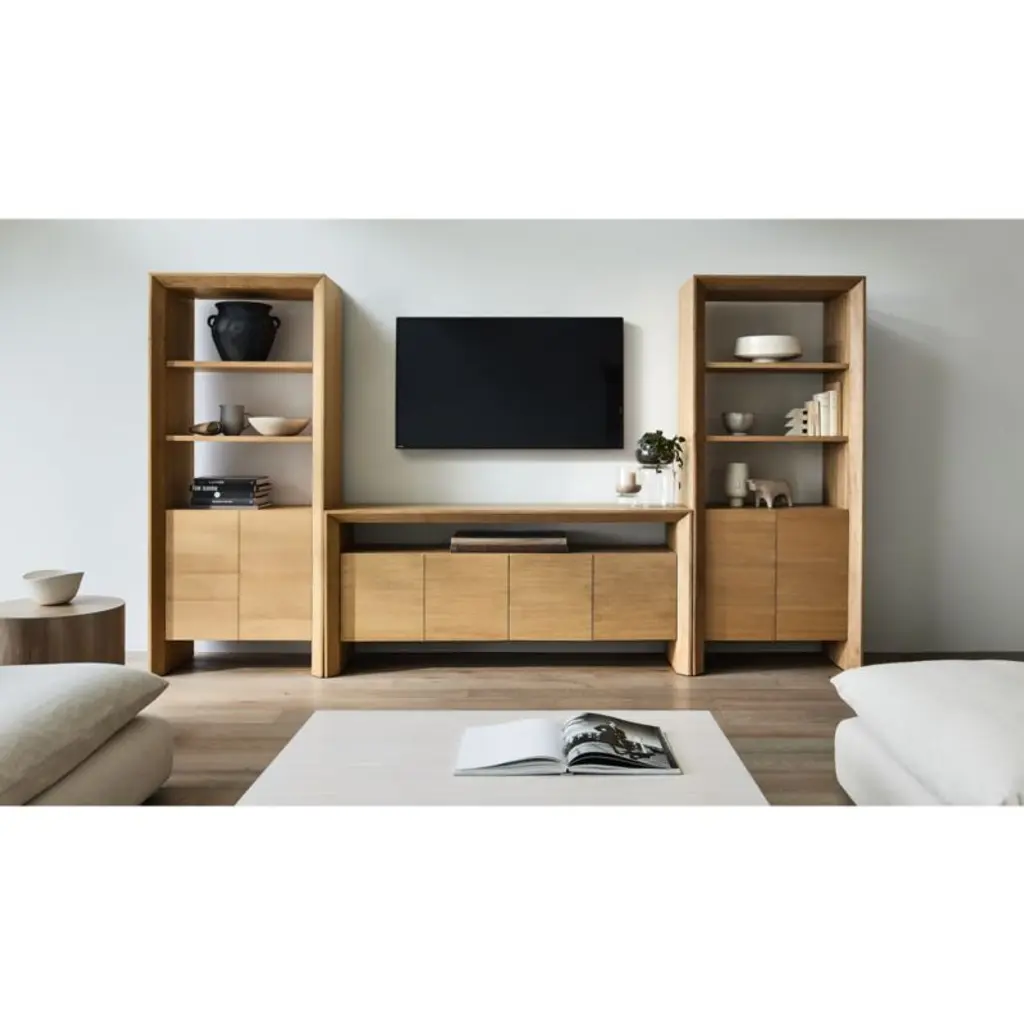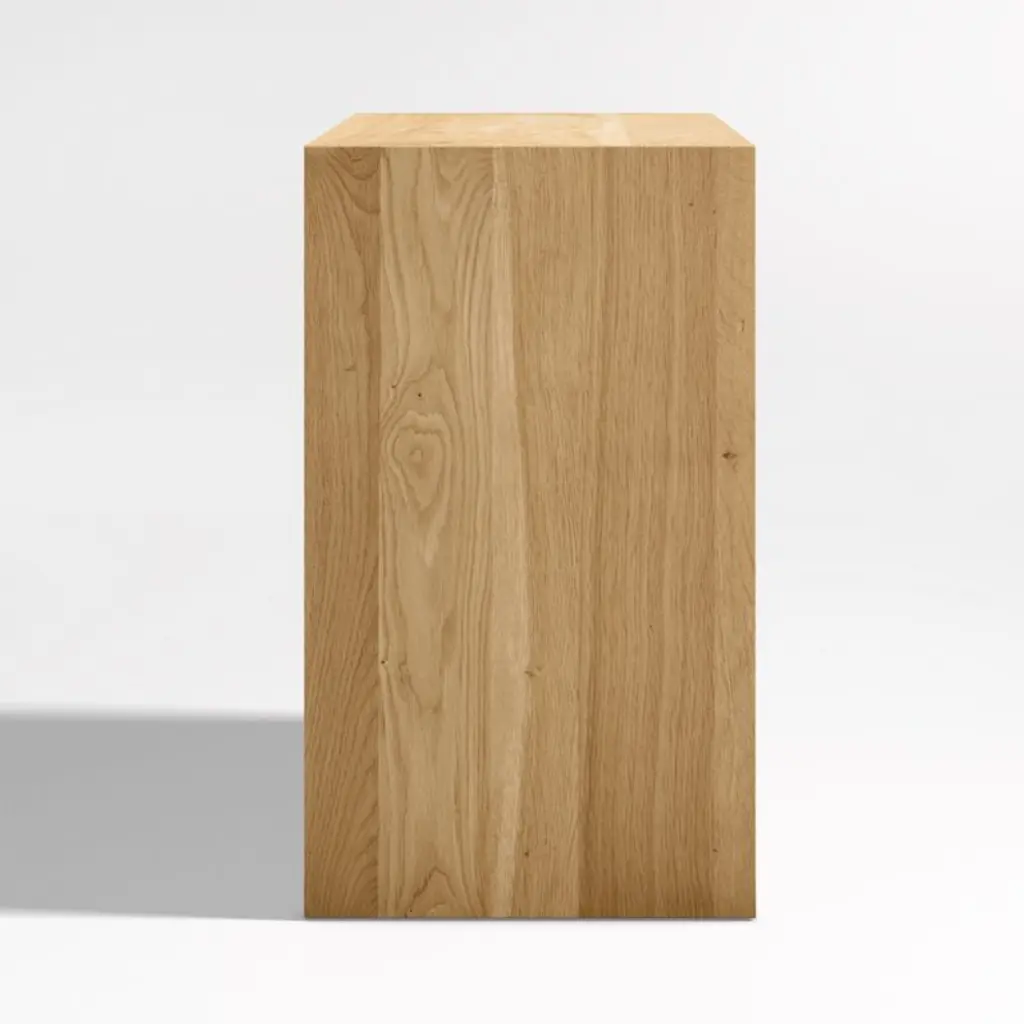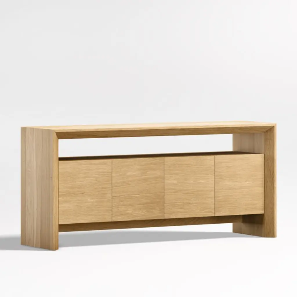 Named after the natural beauty found in the Baja Peninsula, our media console celebrates the organic richness of solid oak. Simple geometry and a natural stain put the focus on the wood's unique grain, knots and markings. Reverse chamfer edges and an open shelf lighten the clean waterfall silhouette, floating a pair of flat-fronted cabinets. Rustic and timeless, the Baja natural oak media console is a Crate & Barrel exclusive.By choosing FSC ®-certified furniture, you are supporting responsible management of the world's forests.