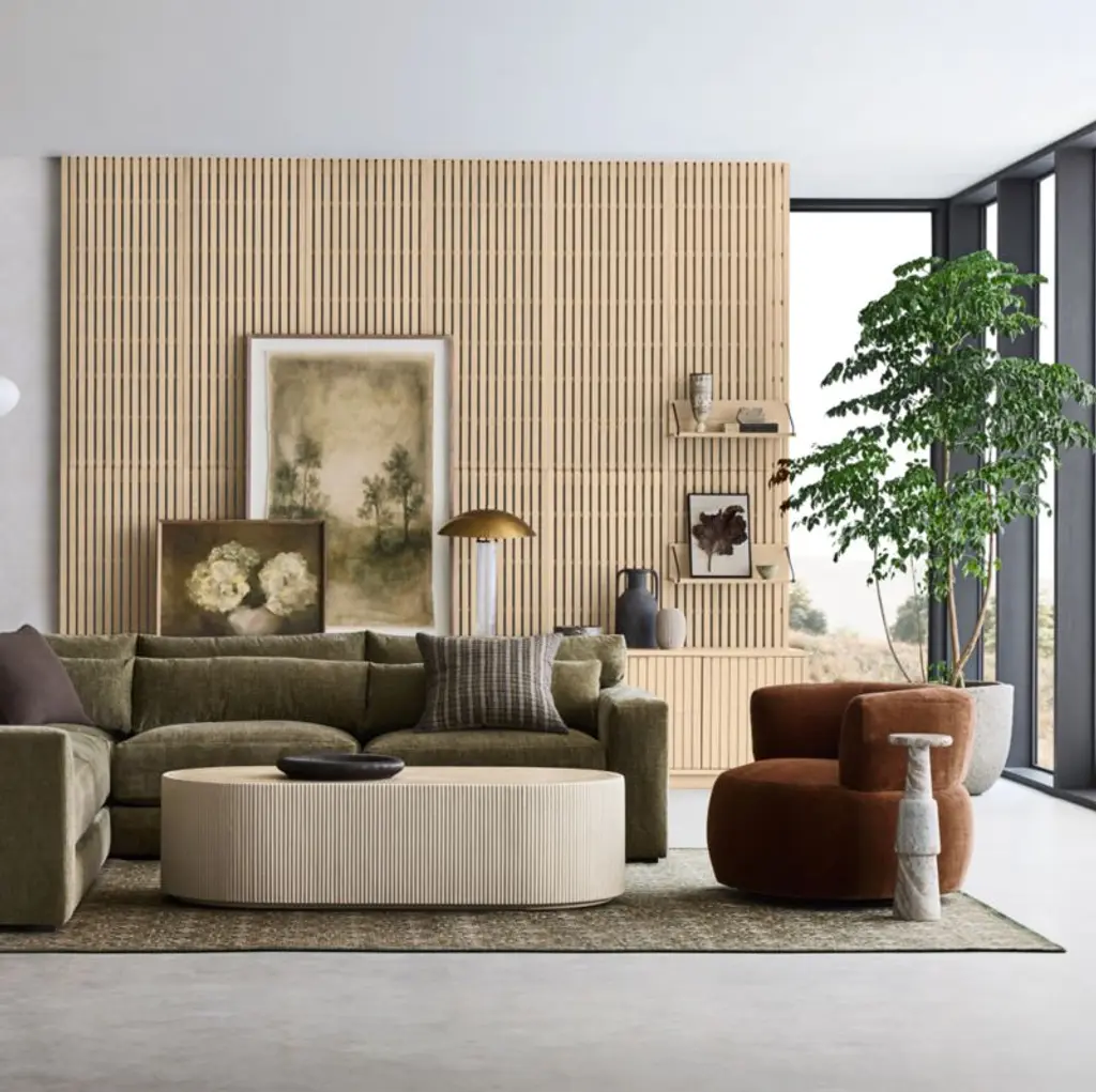 Showcasing our Batten collection's signature blend of modern design and natural materials, this modular home storage solution makes the most of wall space. We've put together this configuration to maximize storage in your living or media room, each piece made of beautiful oak veneer and crafted with dynamic linear interest. Five slatted back panels mount on the wall to provide a backdrop for six reversible shelves that hang with brackets on top or underneath to give you lots of storage options. Down below a freestanding media console clad in solid wood slats adds closed storage with a pair of drawers flanked by a cabinet on either side.