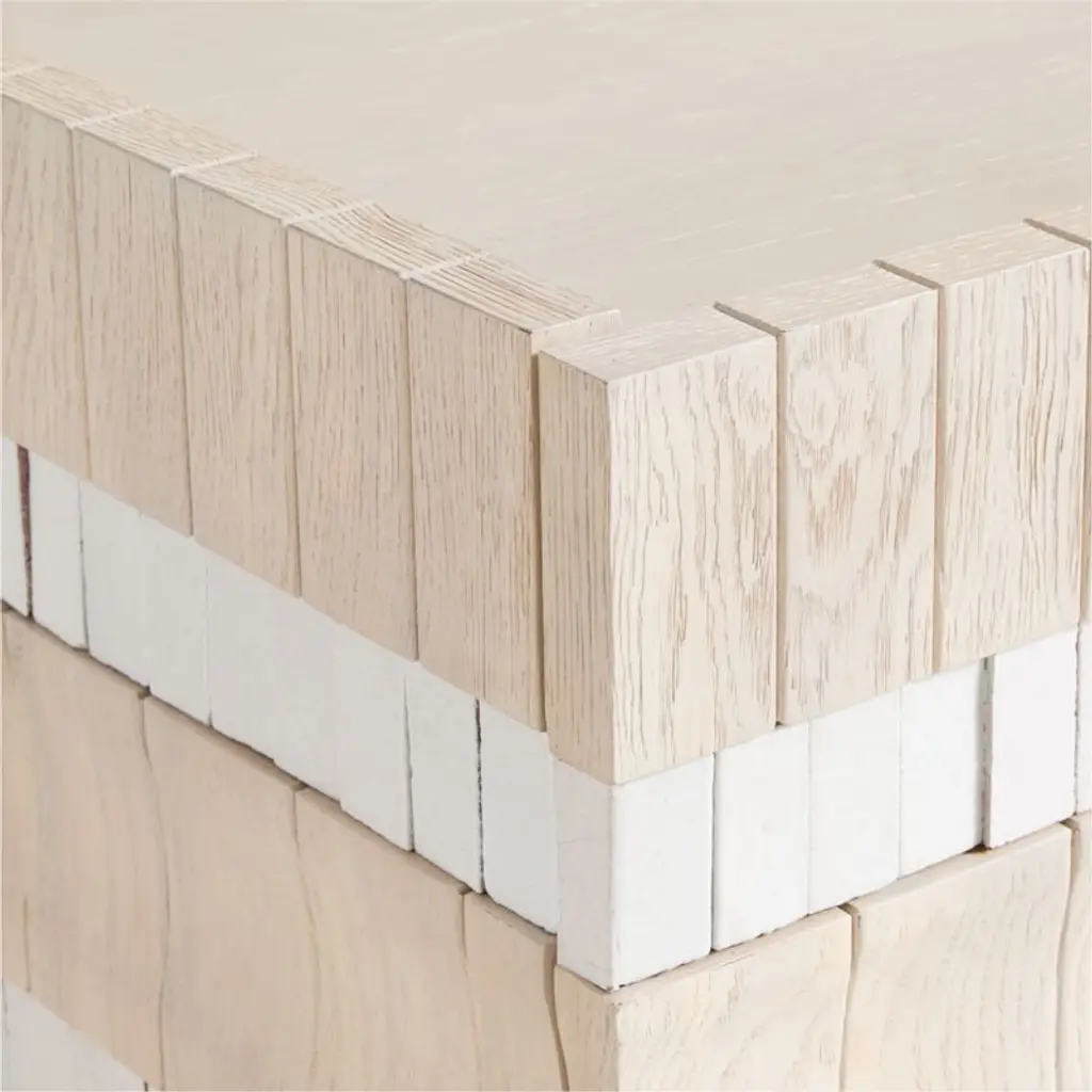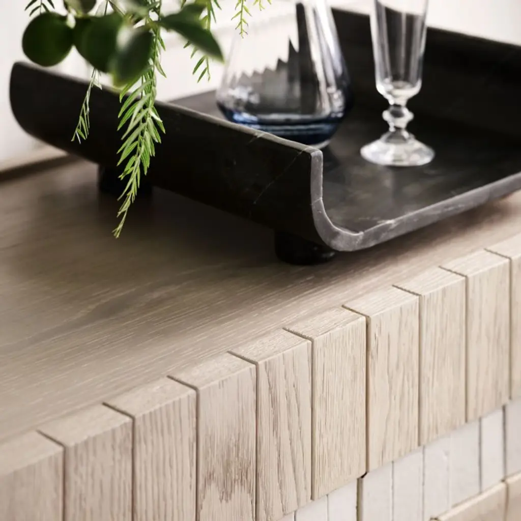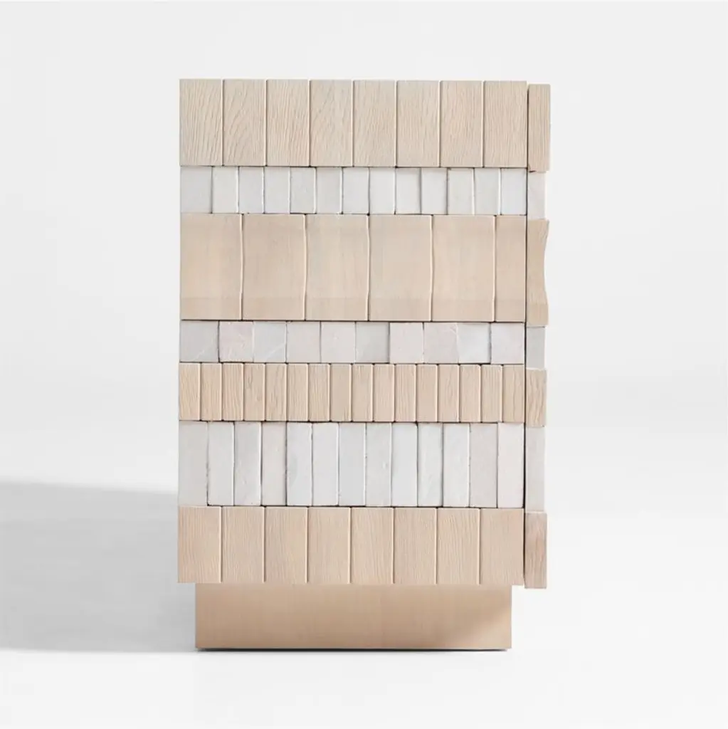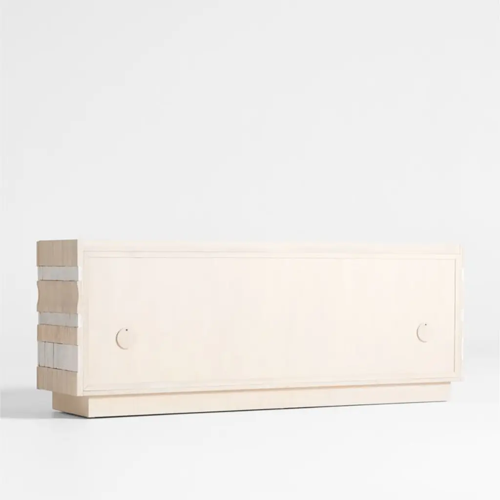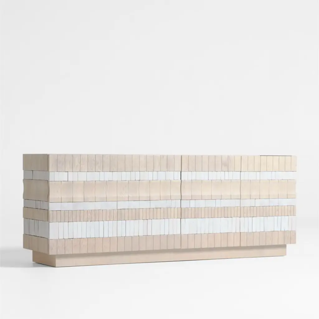 Our Beachcomber storage media console defies expectations with a sculptural facade and an unconventional mix of materials. Wrapped on three sides with alternating rows of whitewashed wood and handmade clay tiles, the artisanal cabinet undulates with texture and two-tone neutral color. Each one-of-a-kind media console features a pair of two-door cabinets that open to one adjustable shelf each. A plinth base lightens the silhouette.Exclusive collaboration! L.A.-based star designer Brigette Romanek redefines design rules as only she can, with playfully unexpected forms to bring you the fresh look her A-list clients love.