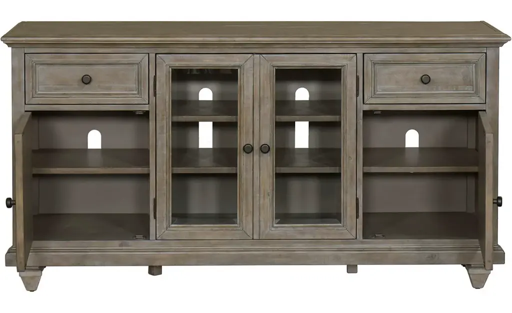 Creating rustic and handsome appeal in your home starts with our Beckley entertainment console. This piece, crafted from pine solids, boasts a dovetail grey finish giving it the appearance of being made with reclaimed wood. Two dust-proofed drawers offer storage while two wooden and two wood-framed glass doors open to reveal adjustable shelving. All drawers and doors feature brushed oil-rubbed bronze knobs and wood knots offer rustic appeal.