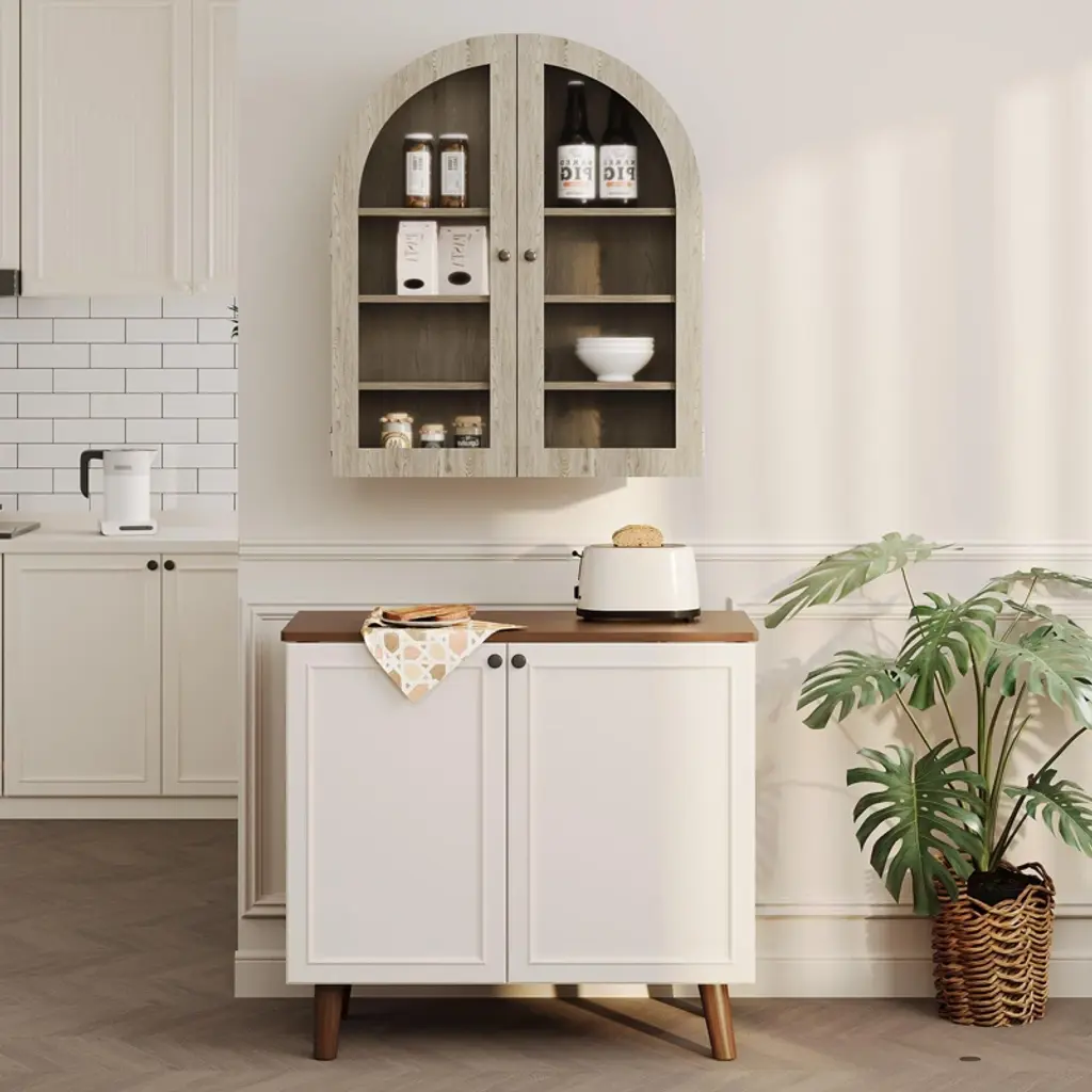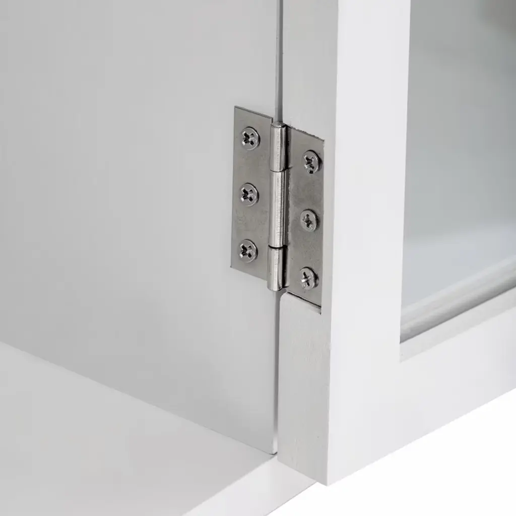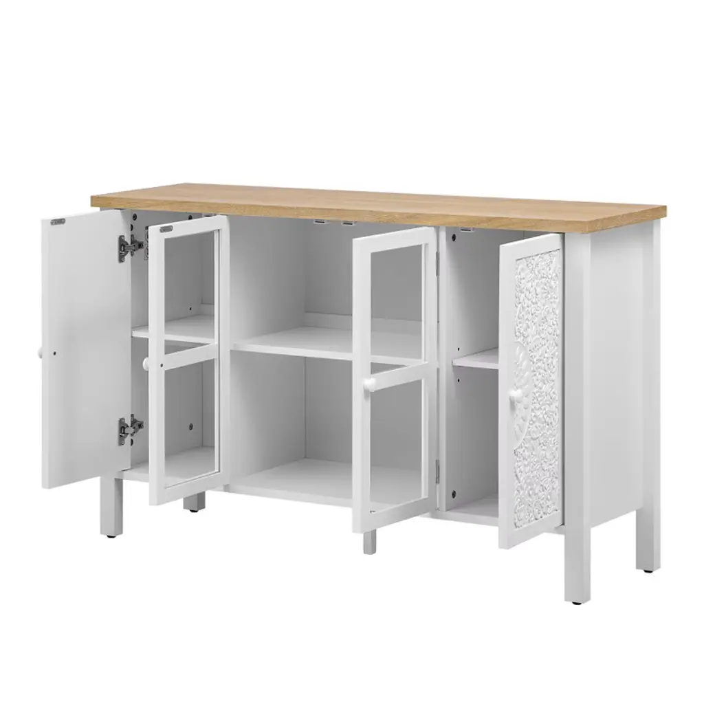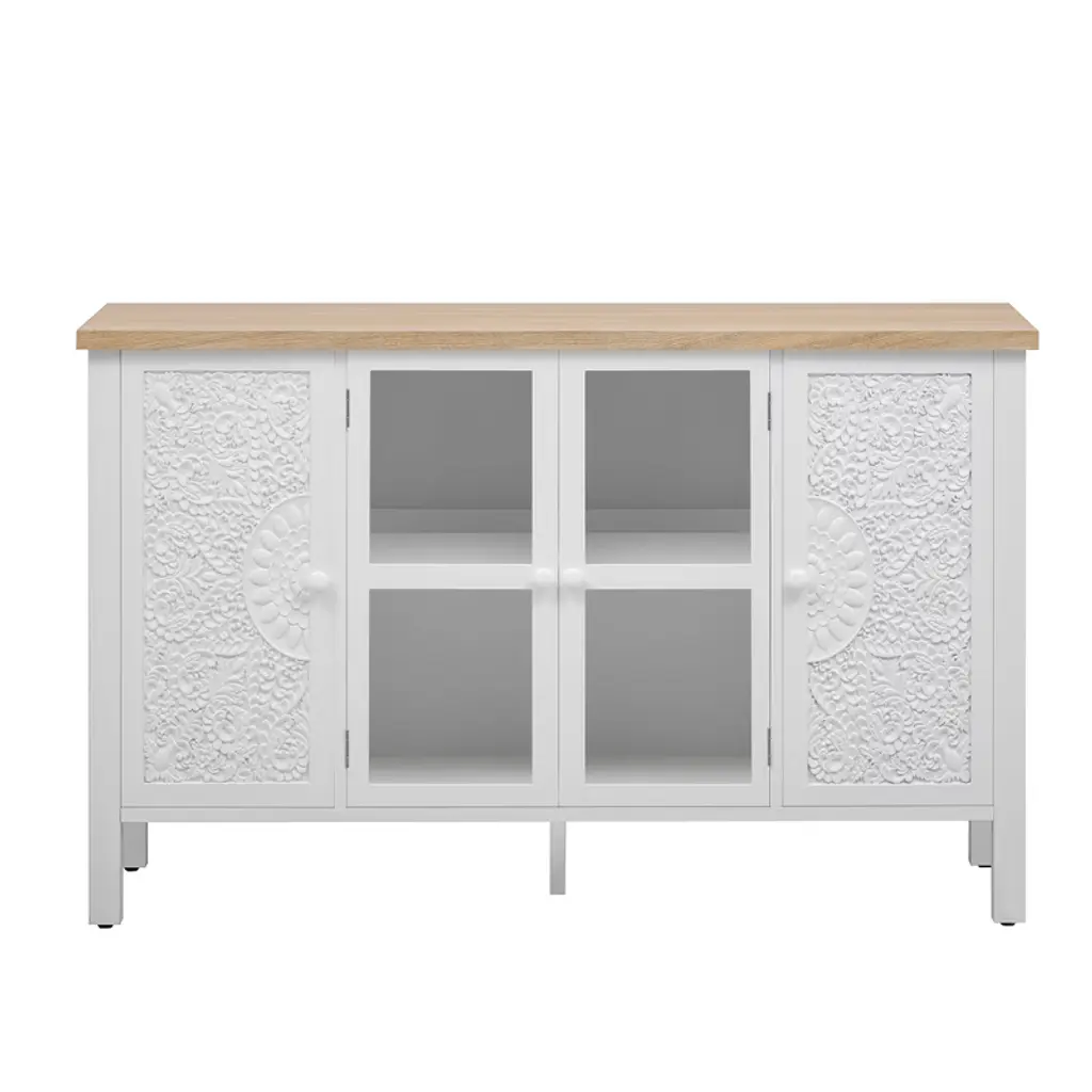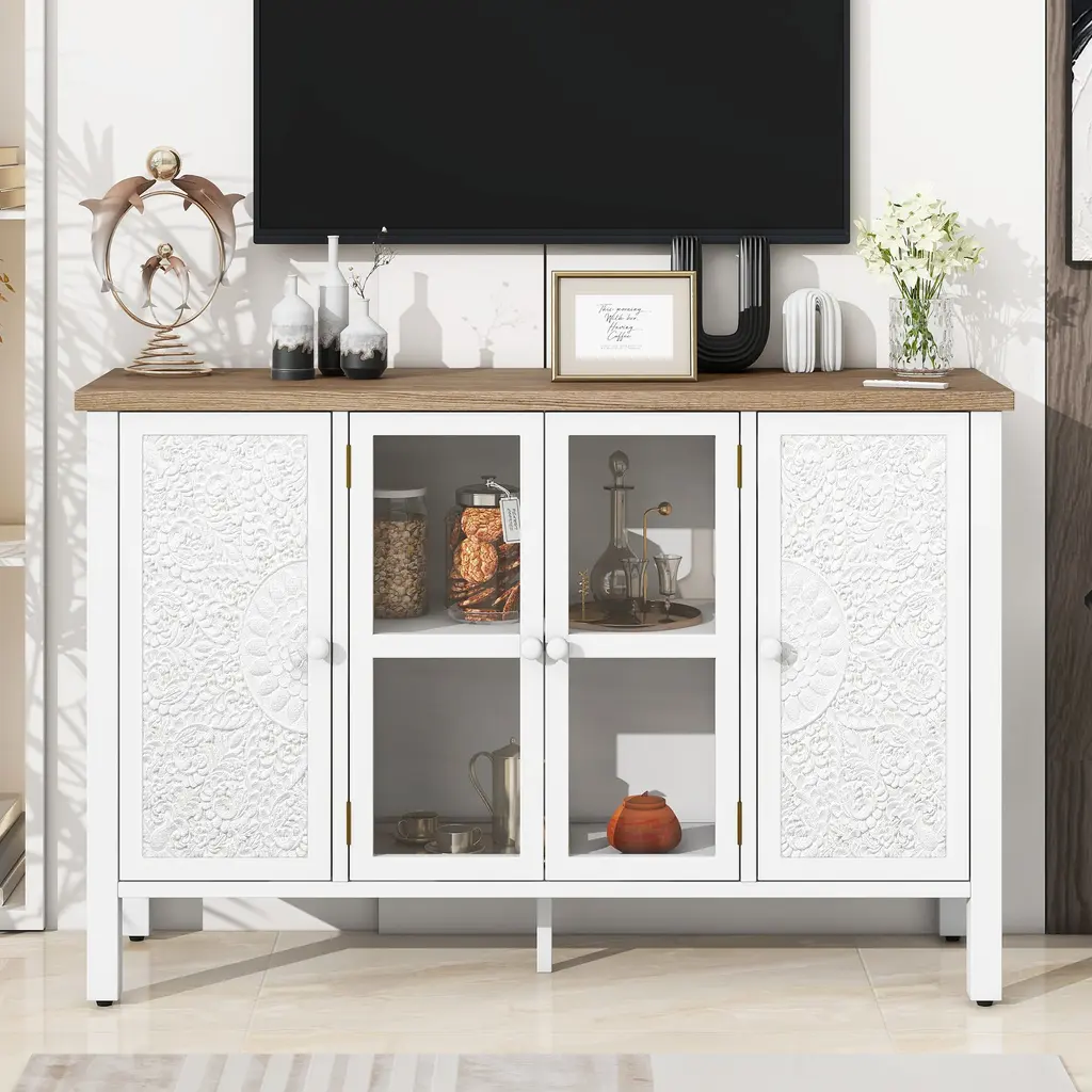 Transform your living space with this American retro-style TV stand, designed to accommodate TVs up to 43 inches. Fusing classical aesthetics with a modern minimalist design, this entertainment center features intricately carved cabinet doors and beautiful wood grain veneer. Its three spacious cabinets provide ample storage space, including a glass door display cabinet that offers elegance and easy access to your items. Built for durability with stable legs and an anti-tipping device, this stylish piece combines functionality with artistic flair, making it perfect for a variety of home decors. Enjoy a fulfilling installation experience with easy-to-follow instructions included.