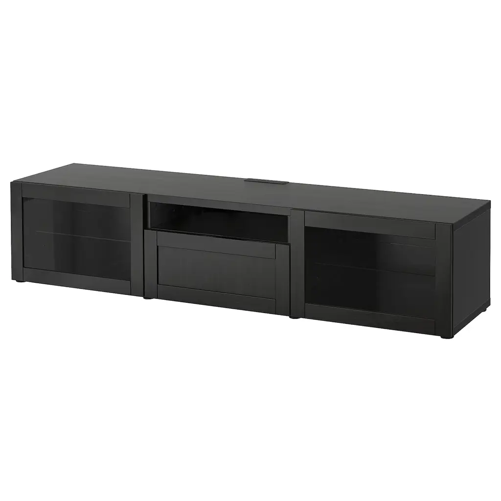 BESTÅ TV bench - black-brown/Hanviken black-brown clear glass 70 7/8x16 1/2x15 3/8 ". Adjustable feet make the TV bench stand evenly on an uneven floor. Drawers make it easy to keep your things organized. The cable outlet at the top lets cords run down smoothly into the TV bench.