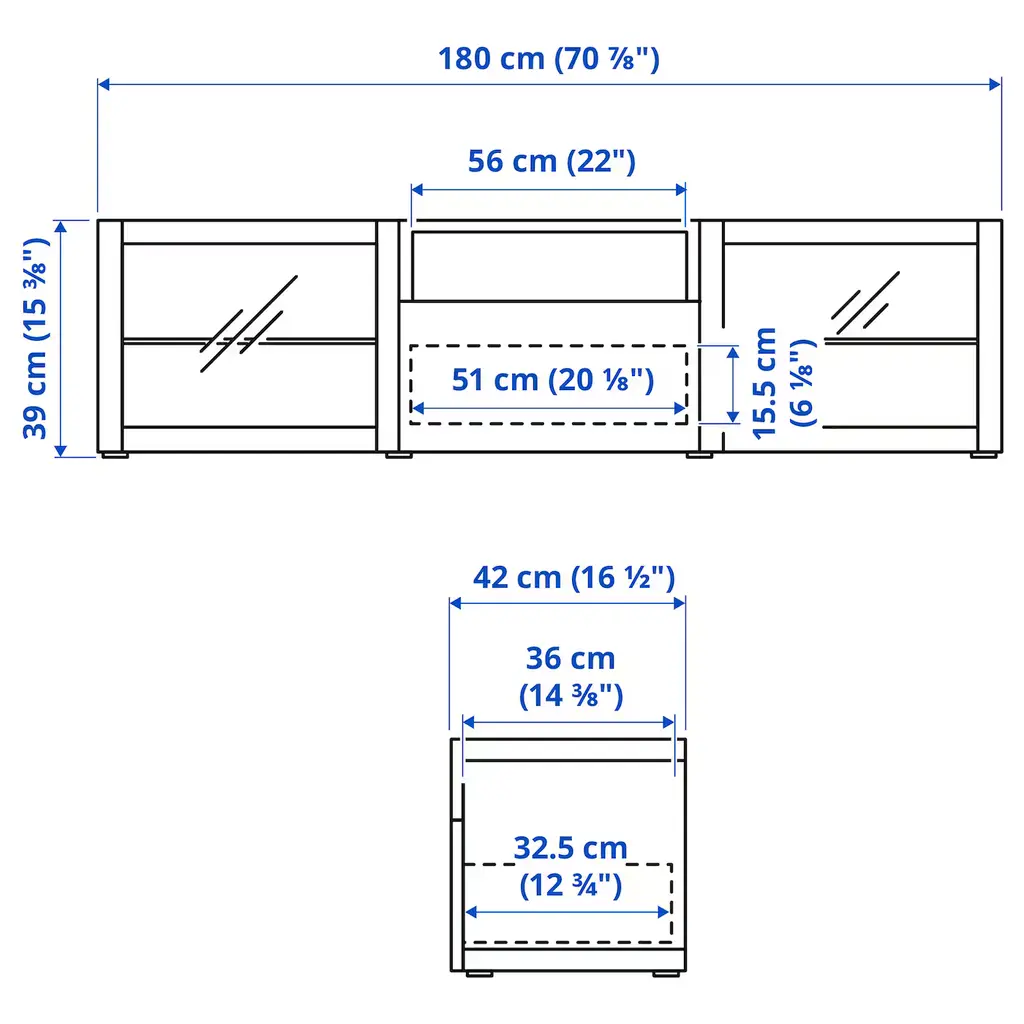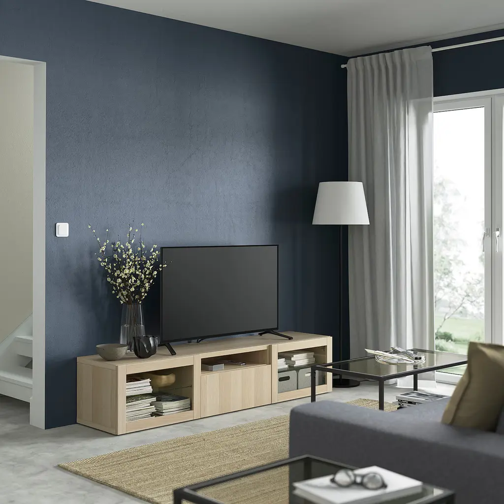 BESTÅ TV bench - white stained oak effect/Lappviken wht stained oak effect clear glass 70 7/8x16 1/2x15 3/8 ". Adjustable feet make the TV bench stand evenly on an uneven floor. Drawers make it easy to keep your things organized.