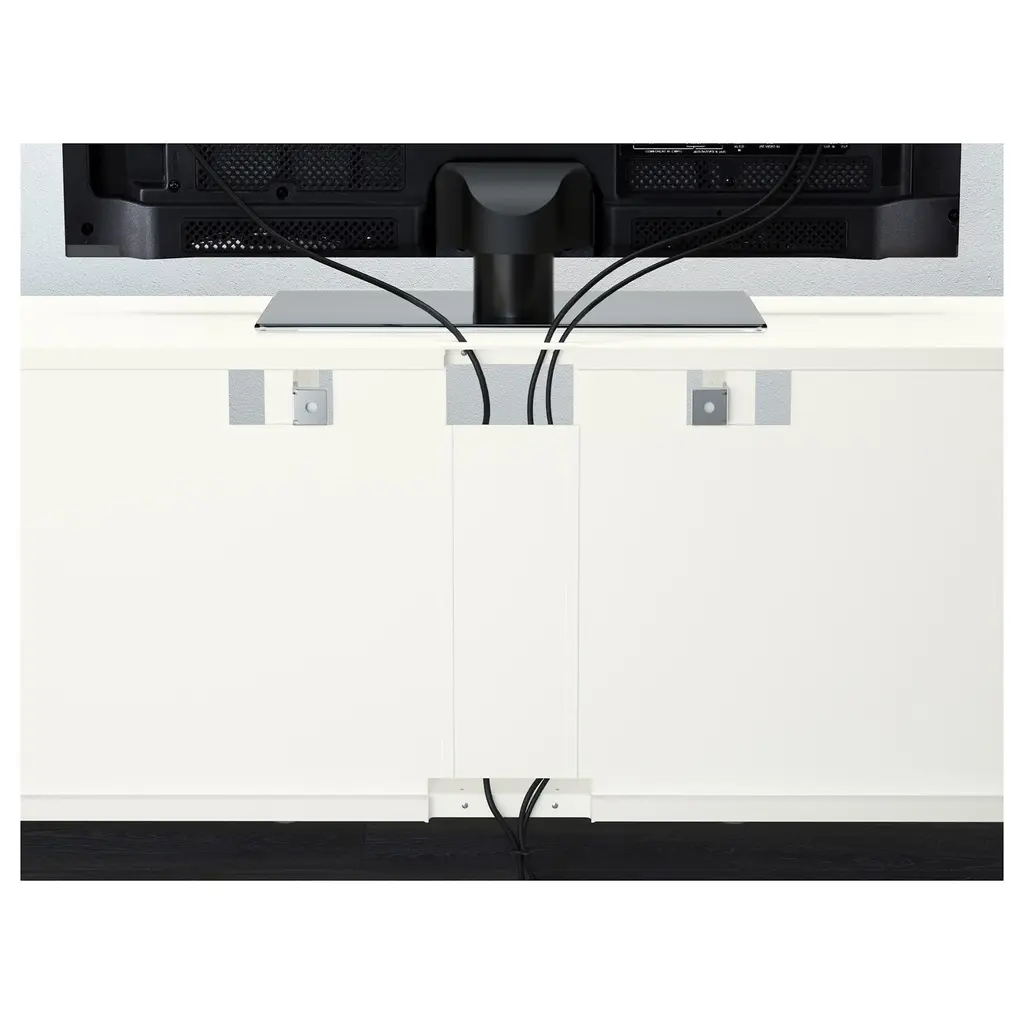 BESTÅ TV bench with drawers - white/Smeviken/Kabbarp white clear glass 70 7/8x16 1/2x29 1/8 ". It’s easy to keep the cords from your TV and other devices out of sight but close at hand, as there are several cord outlets at the back of the TV bench.
