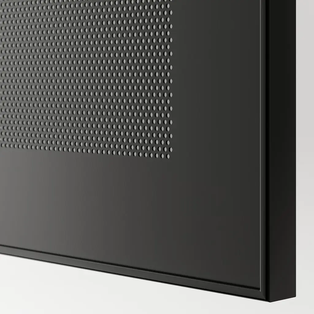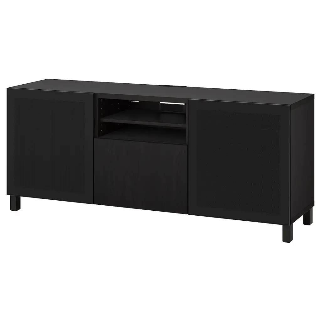 BESTÅ TV bench with drawers - black-brown Mörtviken/Lappviken/Stubbarp black 70 7/8x16 1/2x29 1/8 ". You can place electronic equipment behind the metal mesh doors since they allow signals to get through from your remote control.
