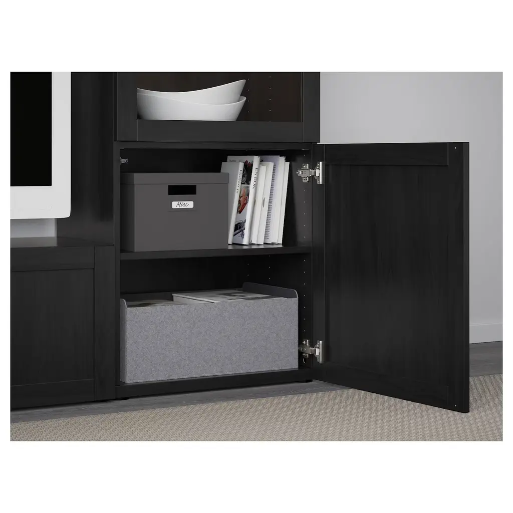 BESTÅ TV storage combination/glass doors - black-brown/Hanviken black-brown clear glass 94 1/2x16 1/2x50 3/4 ". It’s easy to keep the cords from your TV and other devices out of sight but close at hand, as there are several cord outlets at the back of the TV bench.