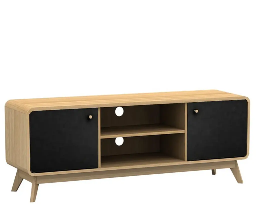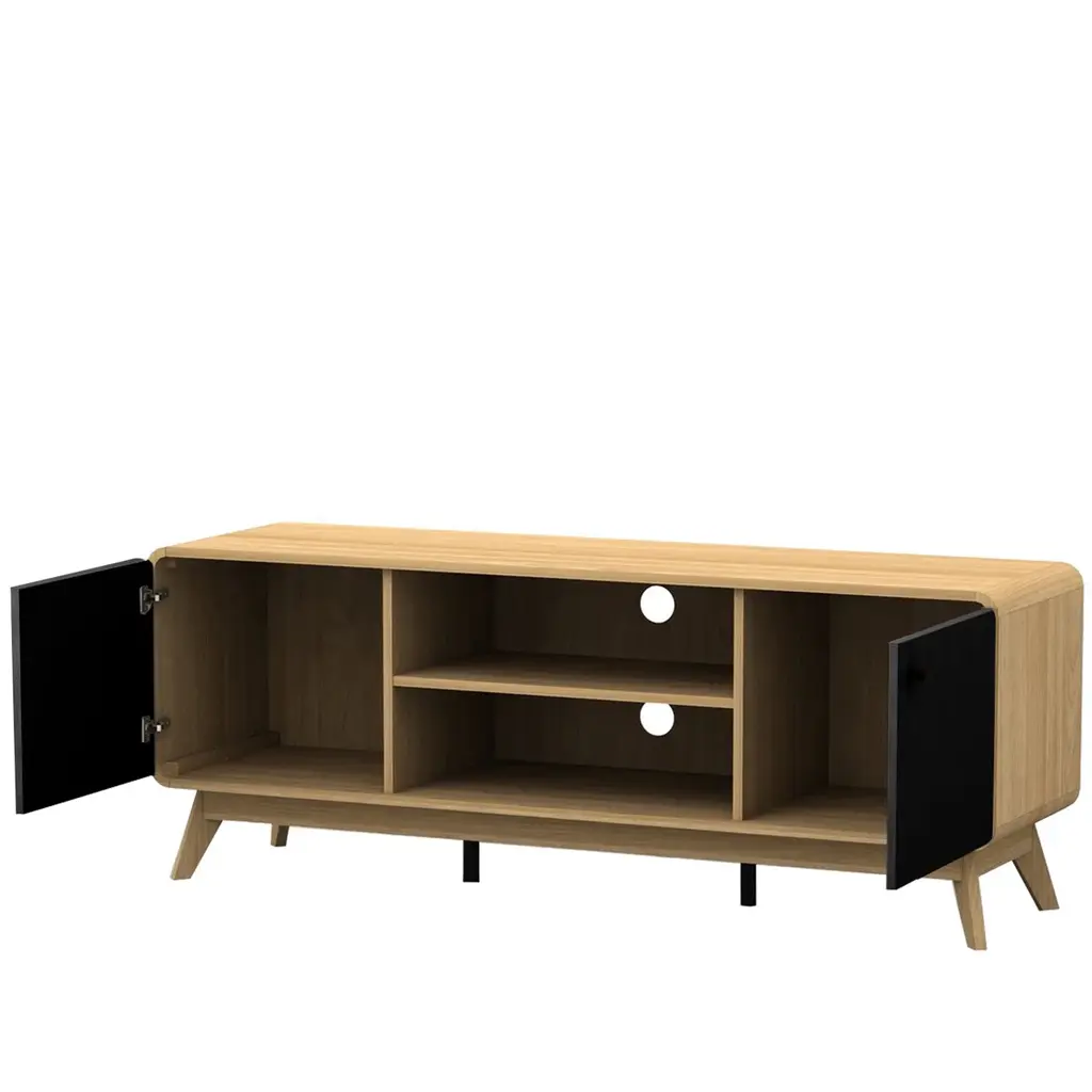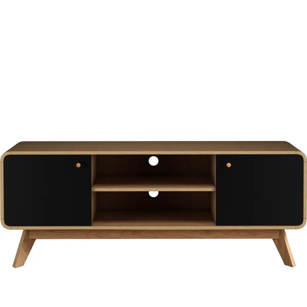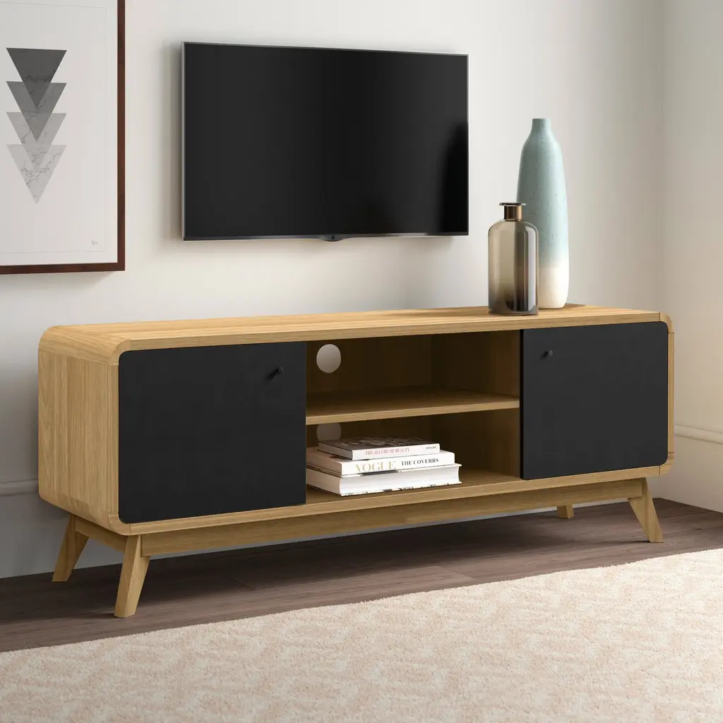 About This Product Designed for TVs up to 60" wide, this mid-century modern TV stand combines two contrasting finishes for a retro look we love. It's crafted from engineered wood and features a streamlined design with rounded edges sitting on splayed legs for a sleek look. Thanks to the two cupboards and adjustable shelves with cutouts for cable management, this piece makes clearing away media clutter easy. Best of all, thanks to the array of finishes, it's easy to get just the right look to fit you and your space.