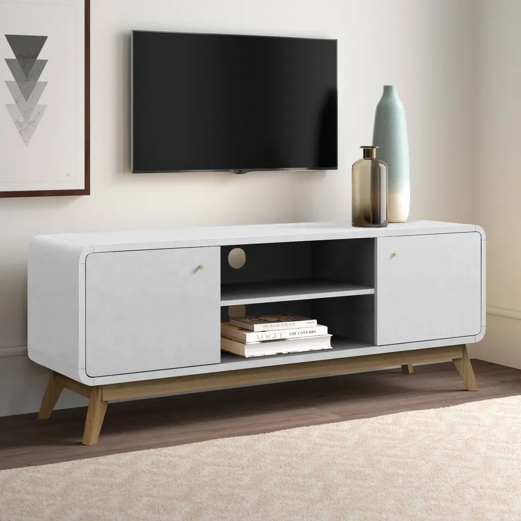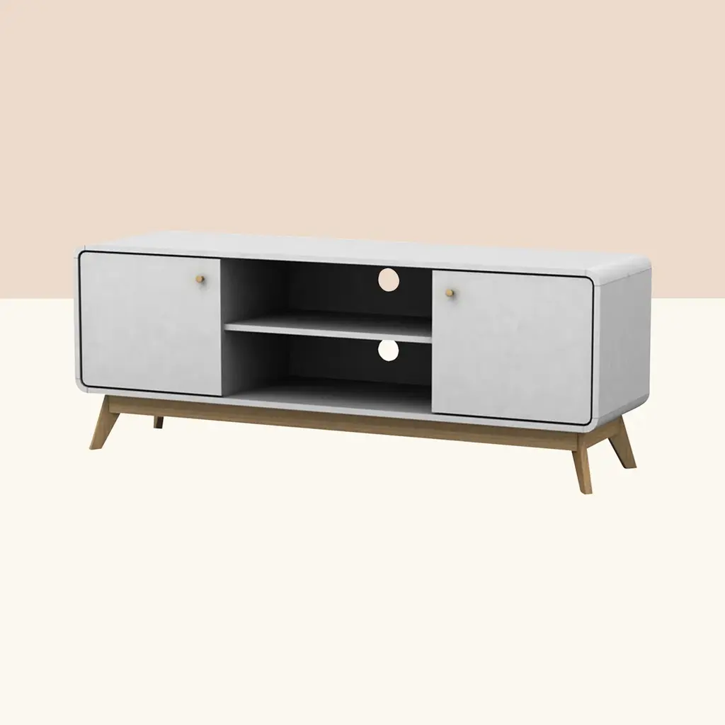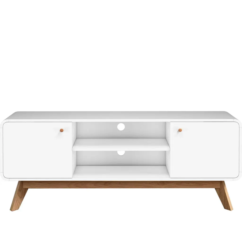About This Product Designed for TVs up to 60" wide, this mid-century modern TV stand combines two contrasting finishes for a retro look we love. It's crafted from engineered wood and features a streamlined design with rounded edges sitting on splayed legs for a sleek look. Thanks to the two cupboards and adjustable shelves with cutouts for cable management, this piece makes clearing away media clutter easy. Best of all, thanks to the array of finishes, it's easy to get just the right look to fit you and your space.