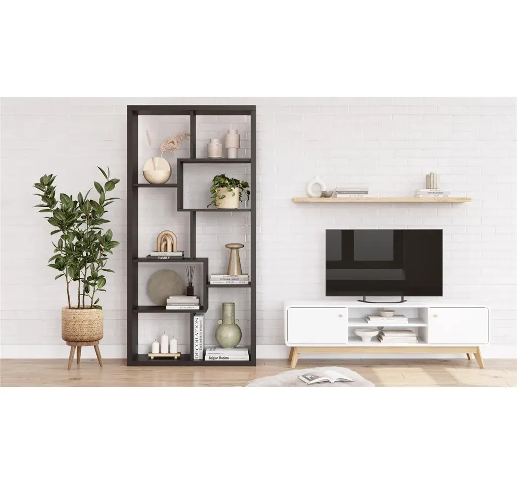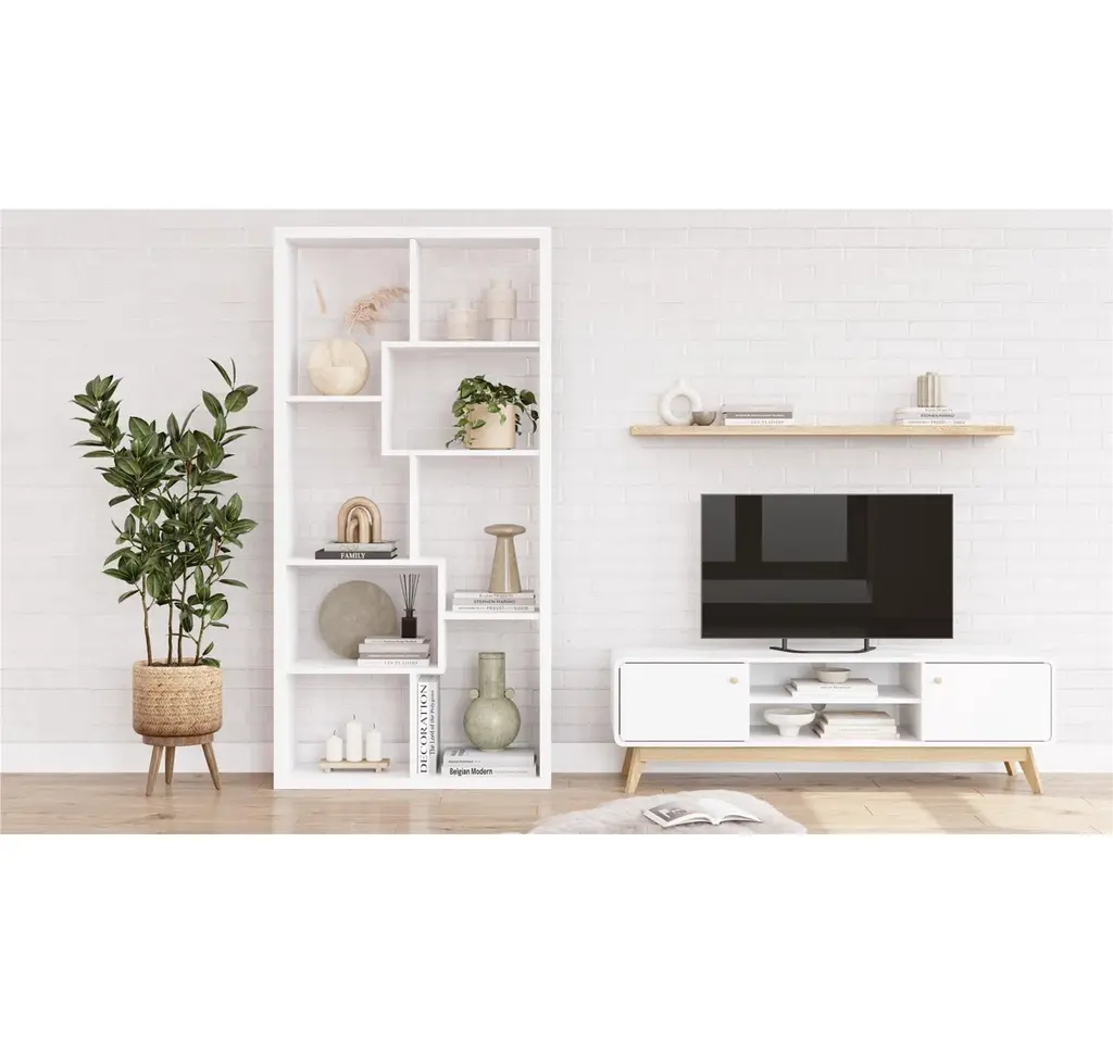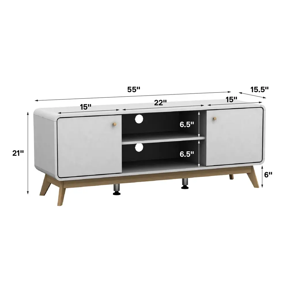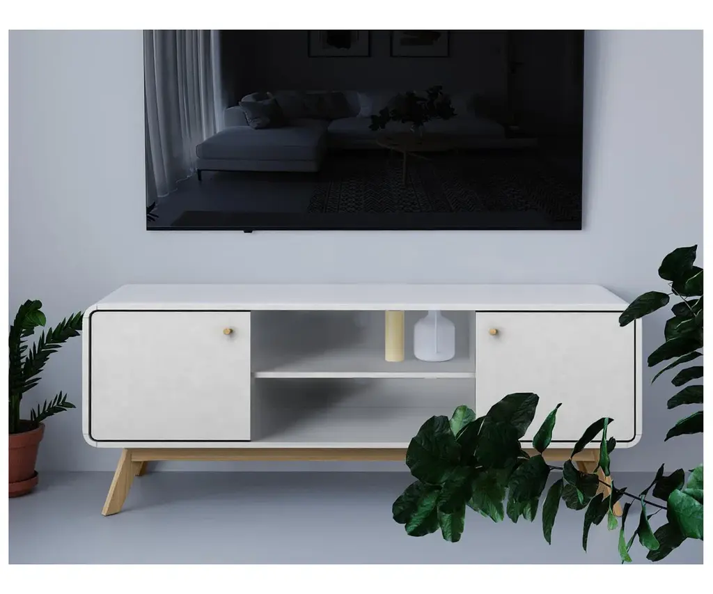 About This Product Designed for TVs up to 60" wide, this mid-century modern TV stand combines two contrasting finishes for a retro look we love. It's crafted from engineered wood and features a streamlined design with rounded edges sitting on splayed legs for a sleek look. Thanks to the two cupboards and adjustable shelves with cutouts for cable management, this piece makes clearing away media clutter easy. Best of all, thanks to the array of finishes, it's easy to get just the right look to fit you and your space.