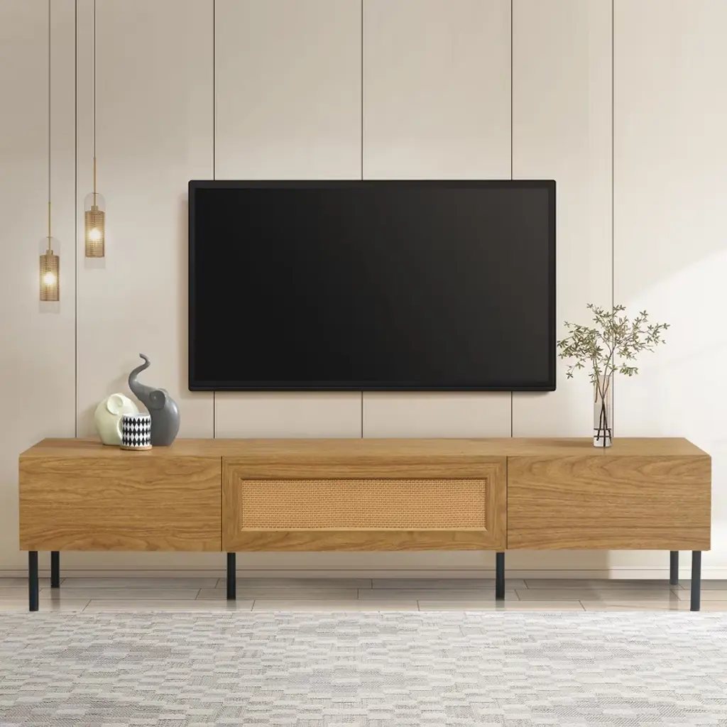 This farmhouse-style rattan TV cabinet combines the charm of classic design with modern functionality, creating a stylish and practical addition to your living room. The elegant rattan decoration on the front adds a touch of rustic appeal, while the clean lines and natural wood tones provide a modern and sophisticated look. Designed to meet all your storage needs, this TV stand offers ample space with three spacious pull-down cabinets. Whether you're storing media essentials, gaming consoles, DVDs, or other items, the generous storage capacity helps keep your living room organized and clutter-free. The cabinets feature high-quality hinges for smooth operation, ensuring that you can easily access your belongings. Crafted from durable P2 grade particle board, it is built to last, offering strength and stability. The waterproof, easy-to-clean desktop makes maintenance hassle-free, while the elevated leg design allows cleaning robots to easily reach under the stand, keeping your space tidy with minimal effort. In conclusion, this farmhouse rattan TV cabinet blends style and practicality seamlessly. Its spacious design, durable construction, and easy assembly make it a perfect addition to any home. Whether you're updating your living room or enhancing your entertainment area, this TV stand provides the ideal combination of storage and aesthetic appeal. Specifications Material: Cabinet: PB Board / Hardware: Metal. Overall Dimension: 70.86”W x 16.26”D x 14.57”H. Overall Weight: 52.03 LBS. Package Quantity: 1.