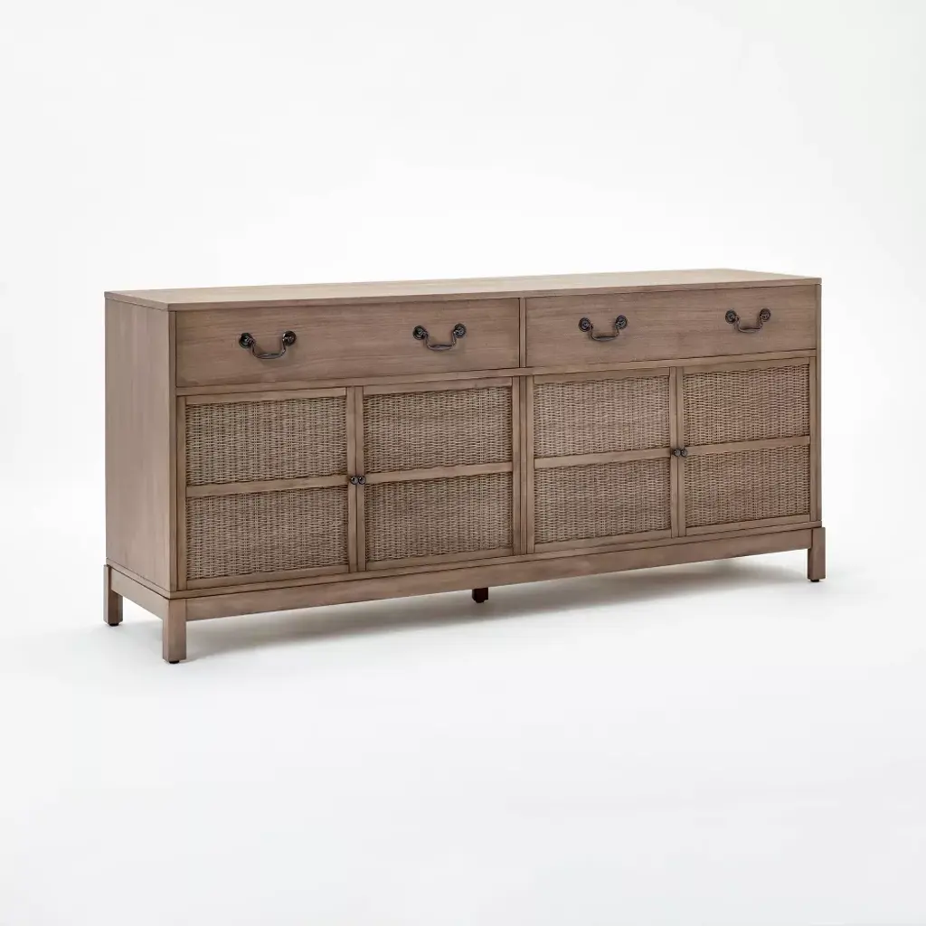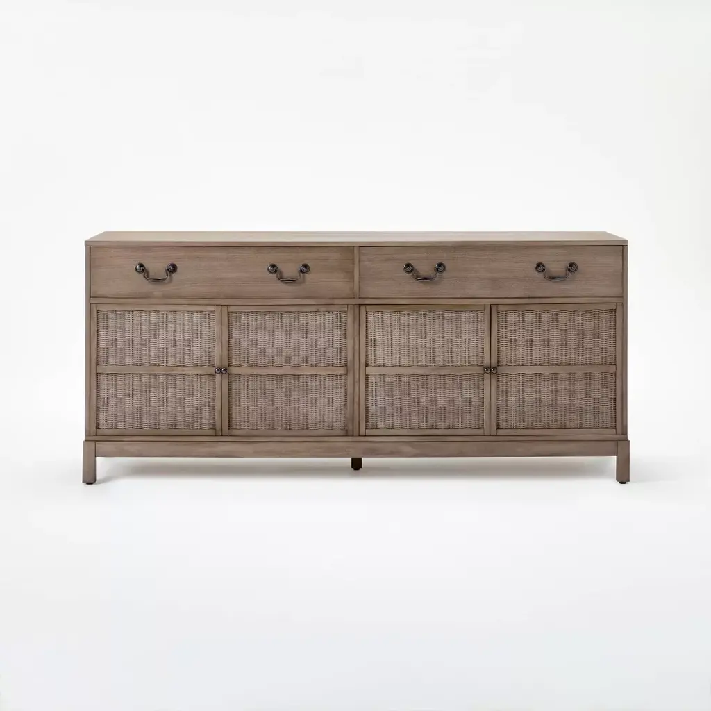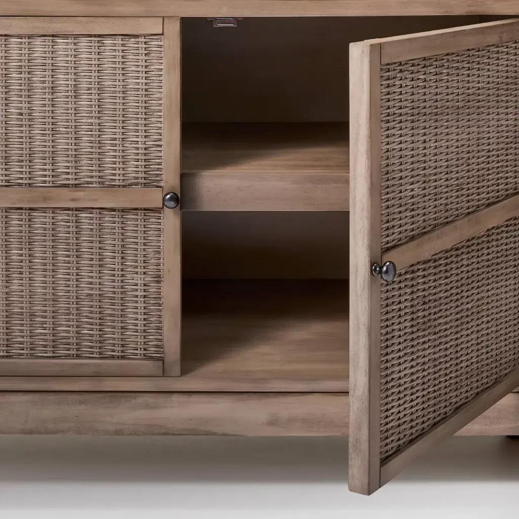 Create a warm and inviting entertainment spot in your home with this Brandeis Woven TV Stand from Threshold™ designed with Studio McGee. Sporting a woodgrain frame, this light brown TV stand can hold televisions up to 60 inches wide. It has two lower drawers with drop-down pulls and two cabinets at the bottom with shelves for ample storage space. Each cabinet is designed with double doors featuring woven rattan-like insets and shiny black-tone pulls for a stunning look.Overall Width: 68.03 InchesOverall Height: 30 InchesOverall Depth: 17.99 InchesDistance from floor to bottom: 3.15 InchesDistance between front legs: 31.75 InchesDistance between front leg and back leg: 14.84 InchesDistance between shelf and bottom drawer: 7.34 InchesDrawer Width: 30.87 InchesDrawer Depth: 14.80 InchesDrawer Height: 3.9 InchesDistance between shelf and bottom: 8.56 InchesShelf width: 32.80 InchesShelf depth: 15.7 Inches