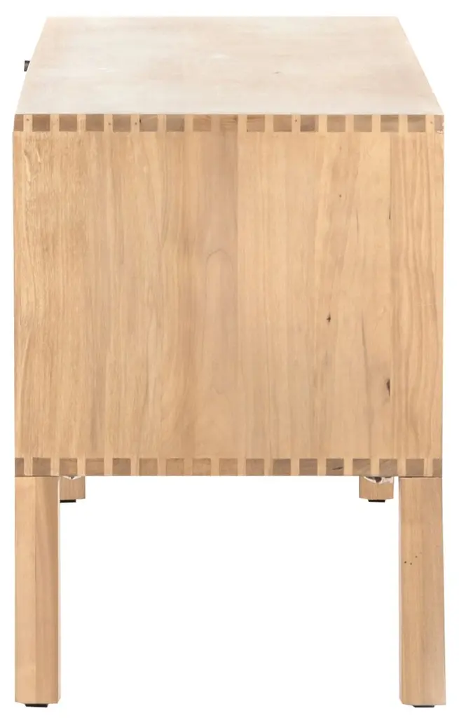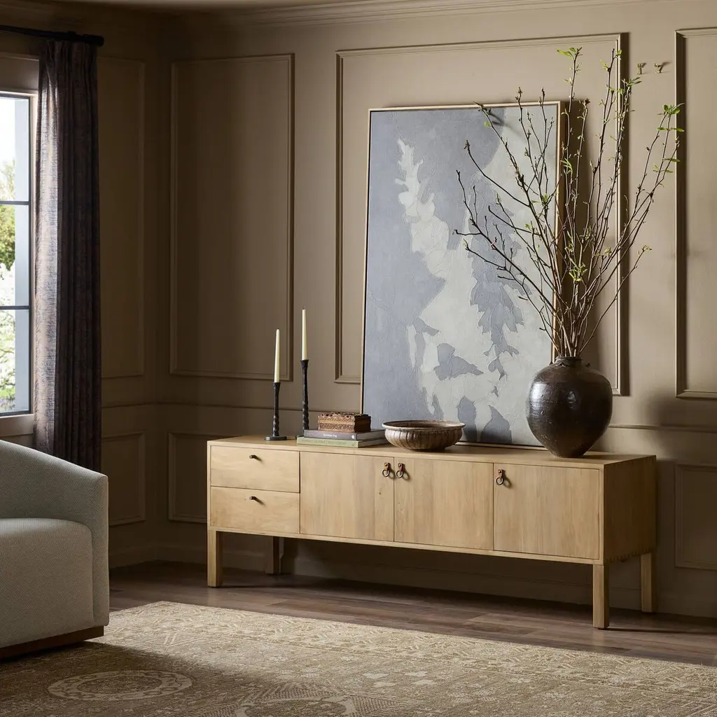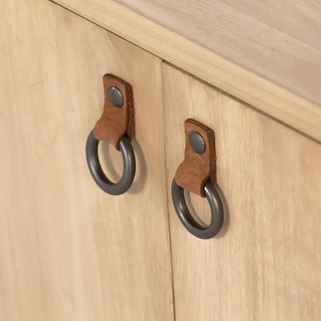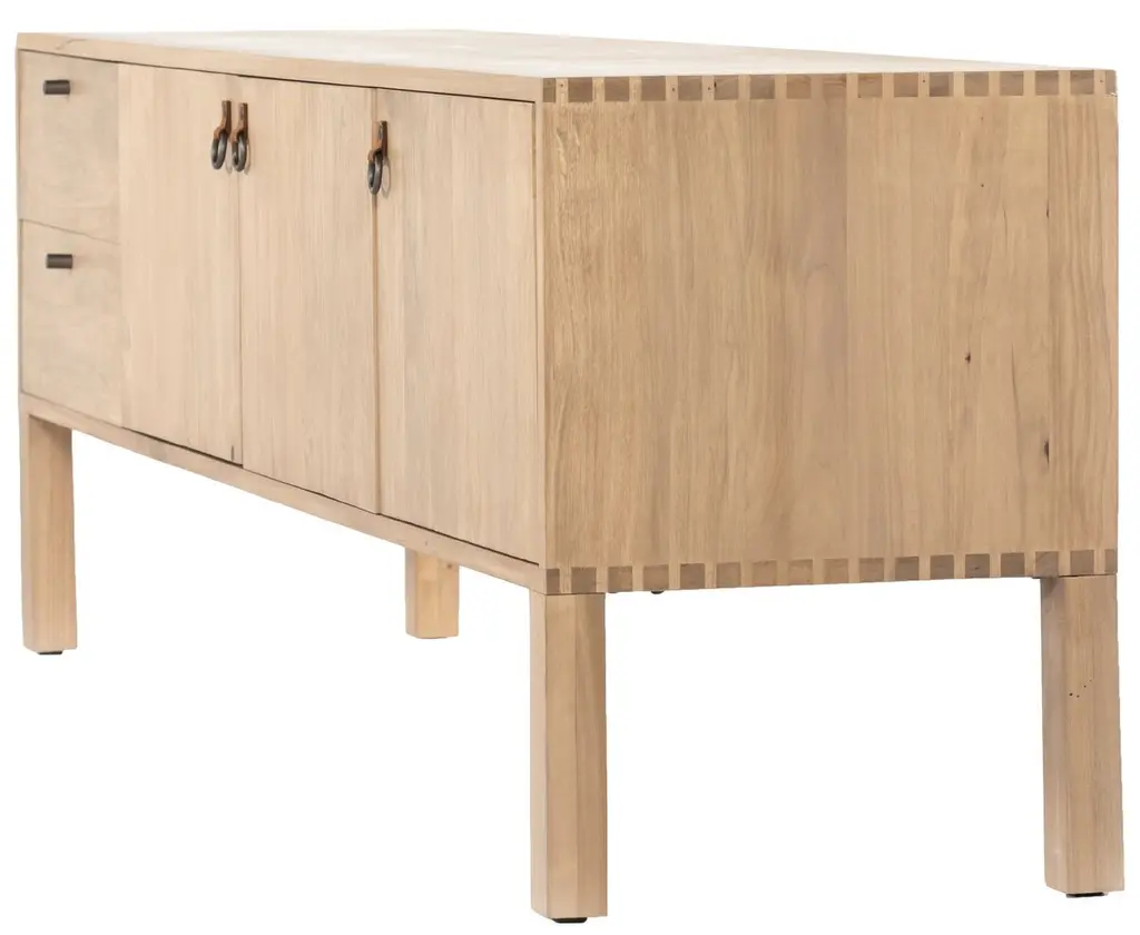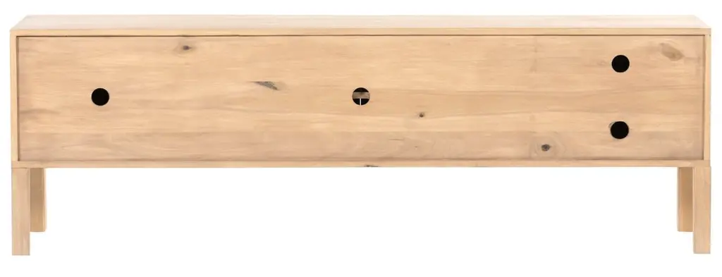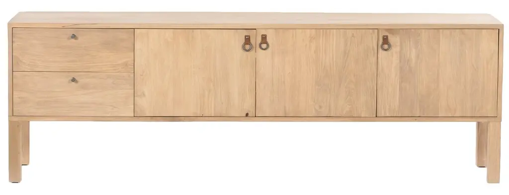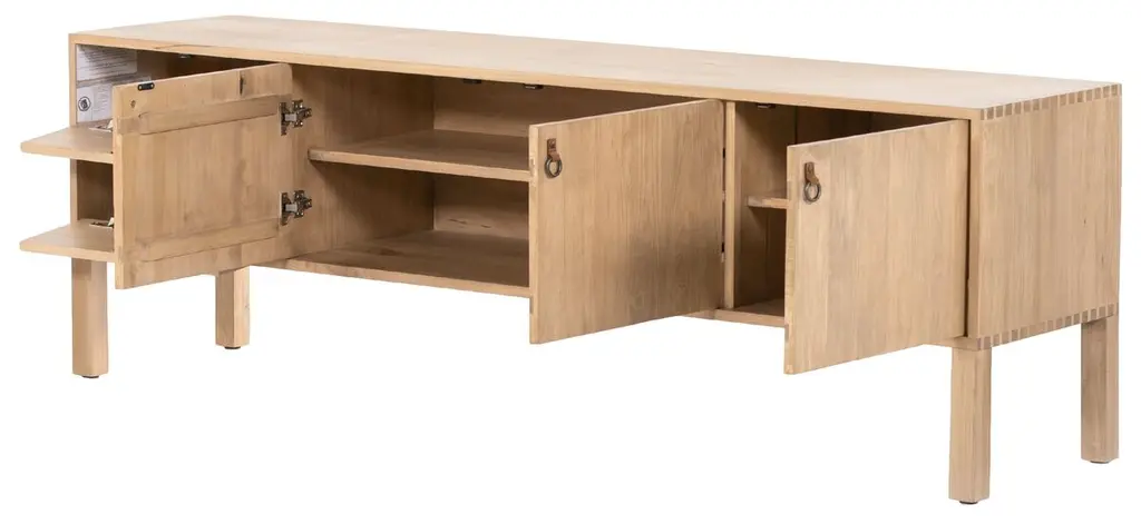 Artisanal details such as the dovetail joinery and the iron-and-leather door pulls add to the allure of this media console. Behind the three doors is shelving; the two drawer fronts pull down to reveal more storage. The rear cutouts simplify cord management.