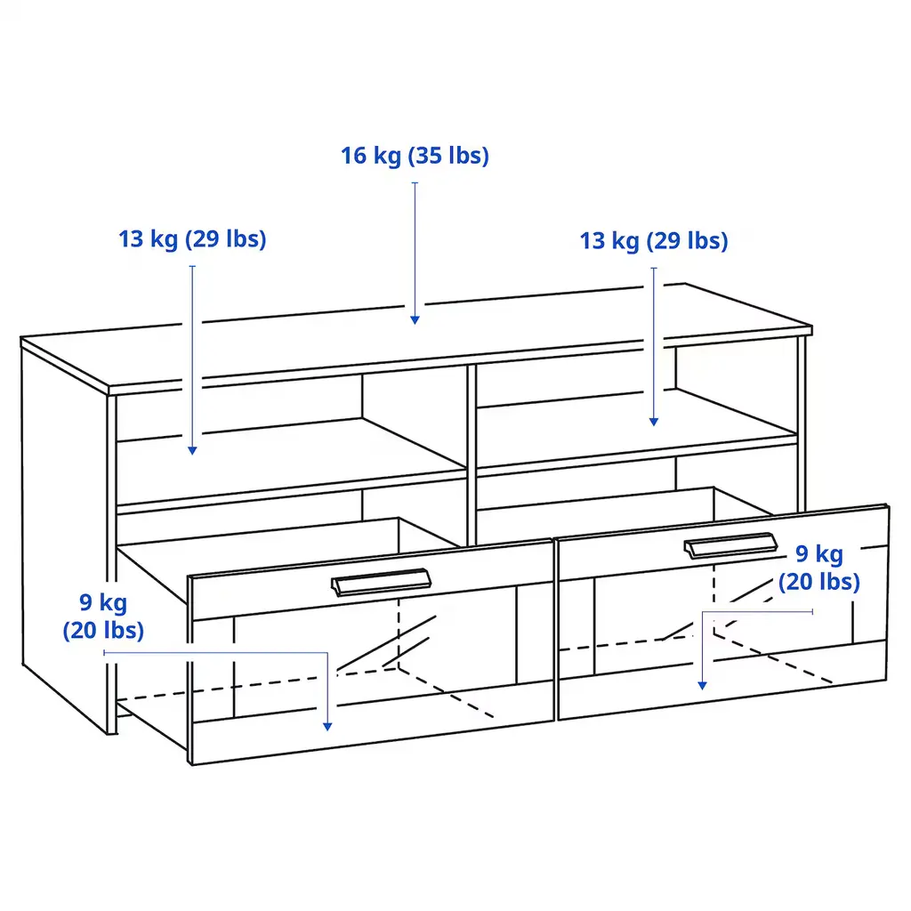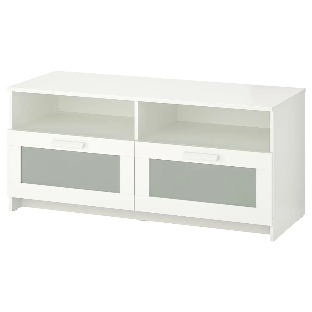 BRIMNES TV unit - white 47 1/4x16 1/8x20 7/8 ". This TV unit has large drawers that make it easy to keep remote controls, game controllers and other TV accessories organized. The top panel of the TV bench is intended for a TV with a maximum weight of 35 lbs.