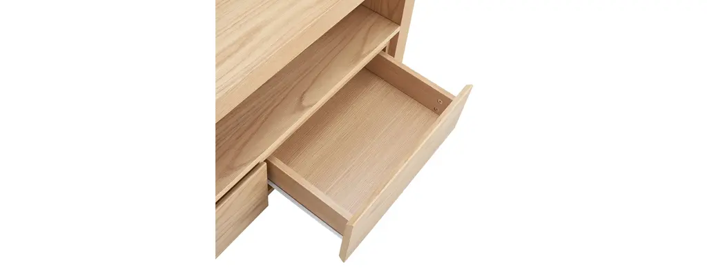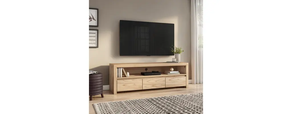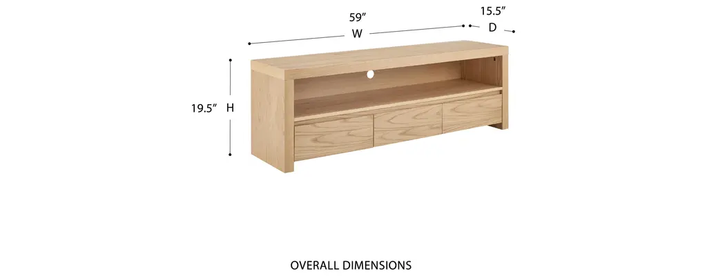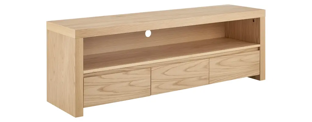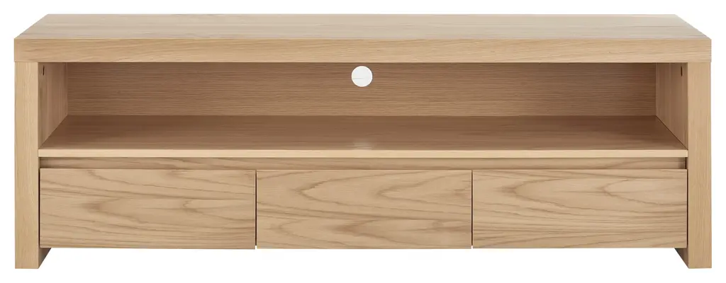 Bryant Media Stand in OakThe Bryant Media Stand is the perfect choice for any living room. It features three drawers for storage, a wide shelf for your electronics, and a back hole for convenient cable management. It comes in your choice of American walnut, oak or matte white finish.American natural white oak veneerThree drawersLight weight honeycomb constructionBack panel opening for cable management