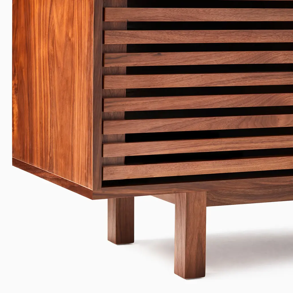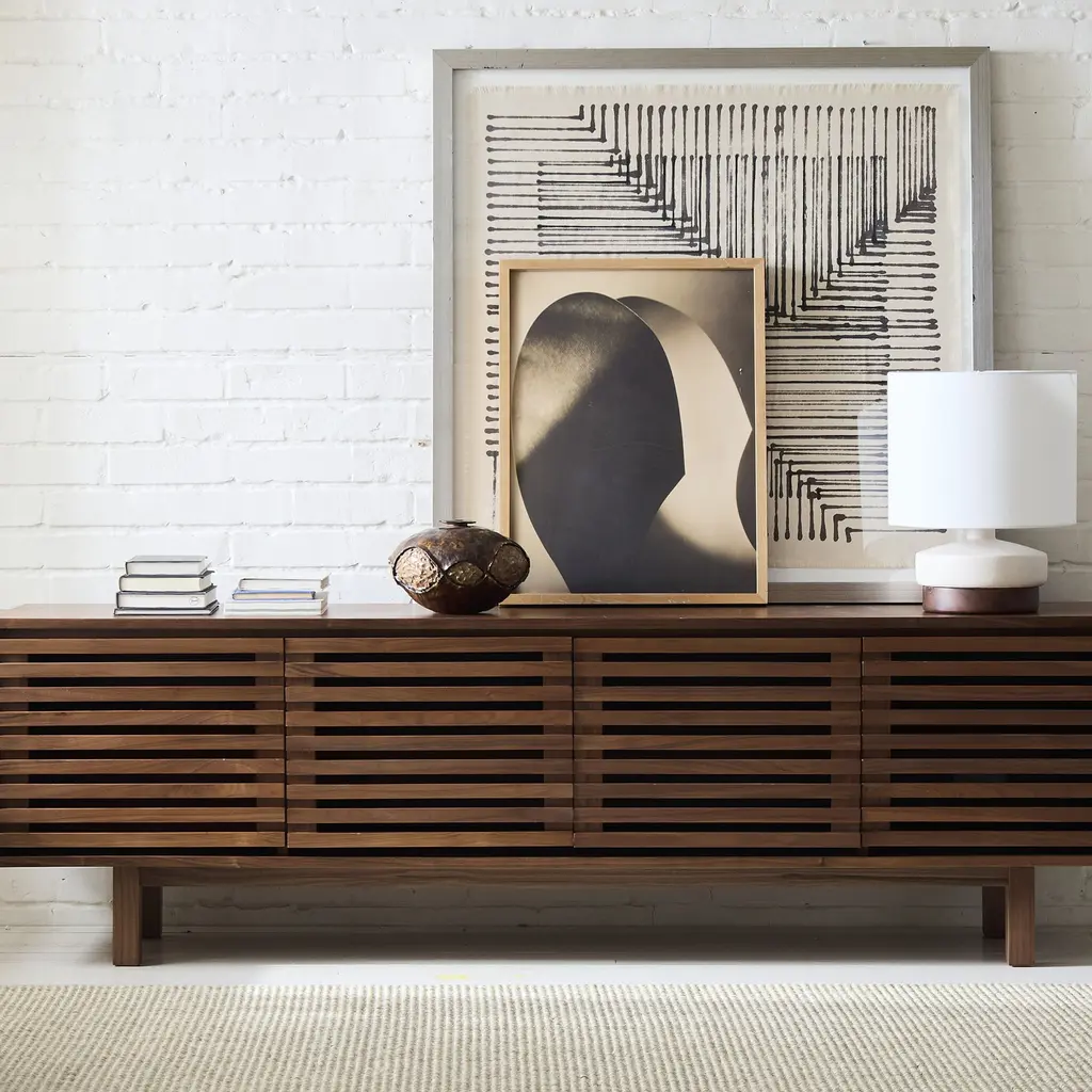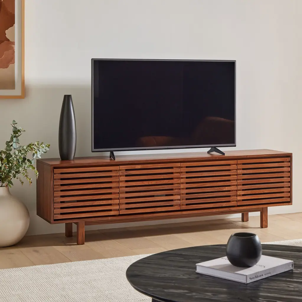 Slatted style is a nod to the '60s and '70s. Three roomy cabinets keep everything hidden. Crafted from kiln-dried wood that's extra durable. Contract Grade, so you know it's built to last.