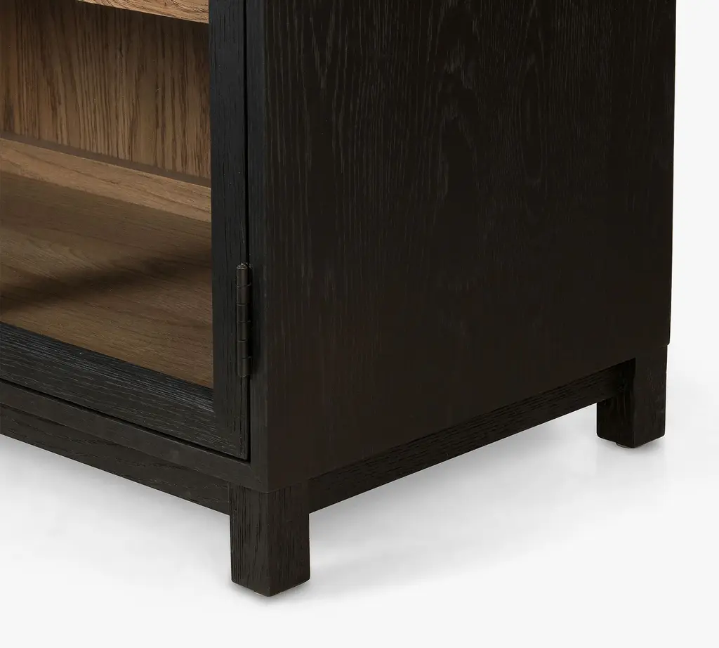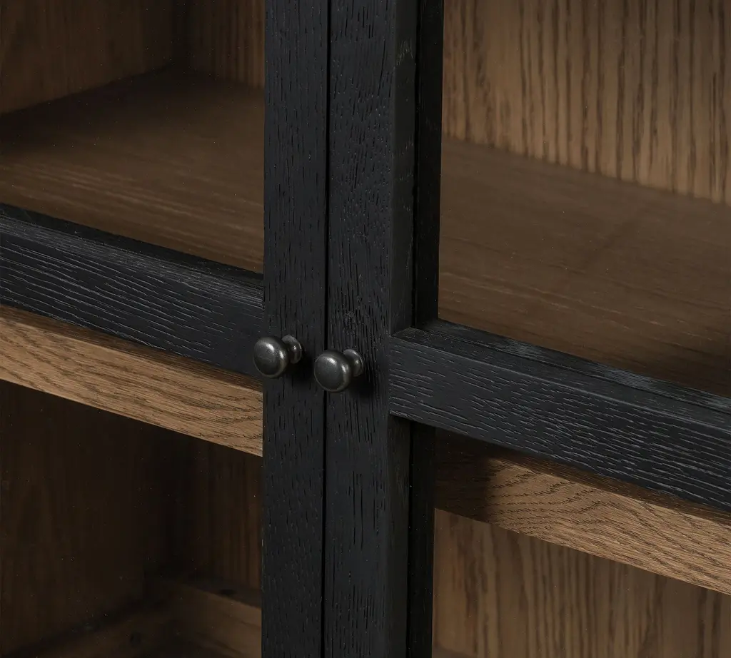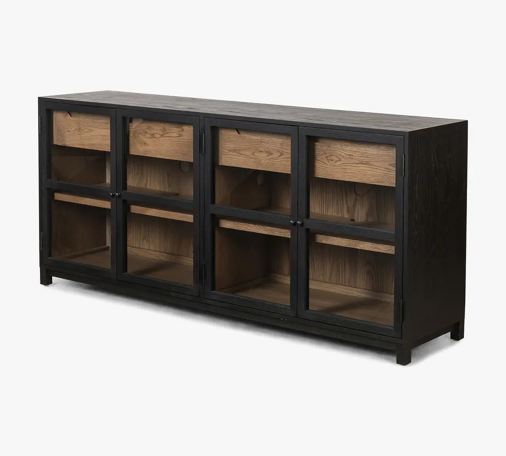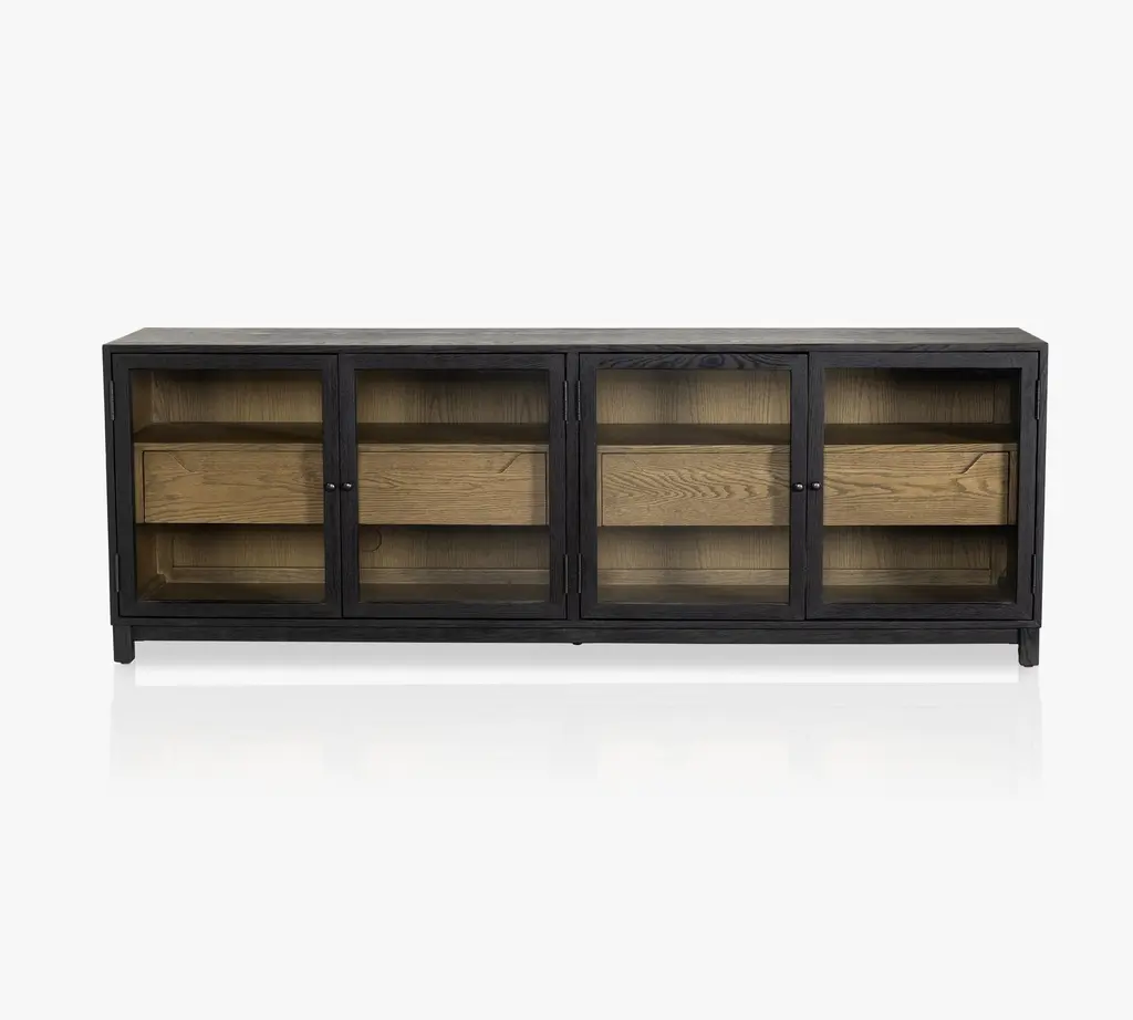 Put on a stylish display with this glass door console. Framed by an oak exterior, the spacious interior is designed with both fixed and adjustable shelving so you can reconfigure as you find and collect pieces for your home. We love the out-of-view storage drawer, perfect for putting away flatware in a dining room or concealing chords in a living room.