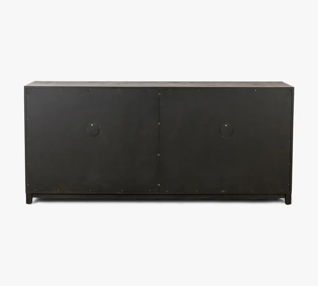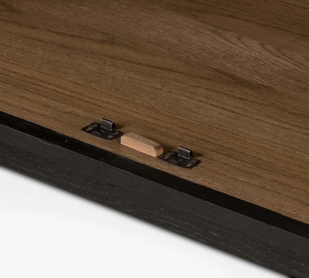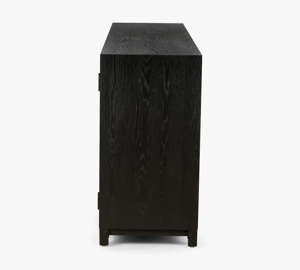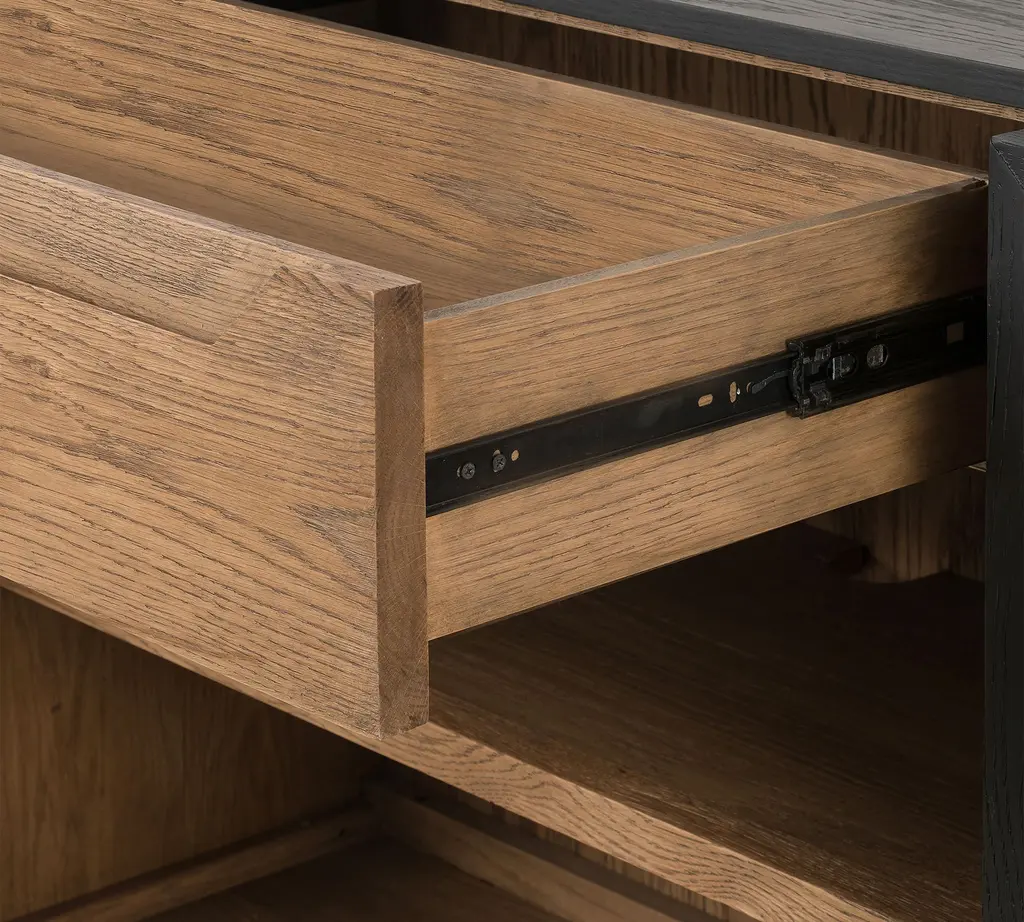 Put on a stylish display with this glass door console. Framed by an oak exterior, the spacious interior is designed with both fixed and adjustable shelving so you can reconfigure as you find and collect pieces for your home. We love the out-of-view storage drawer, perfect for putting away flatware in a dining room or concealing chords in a living room.