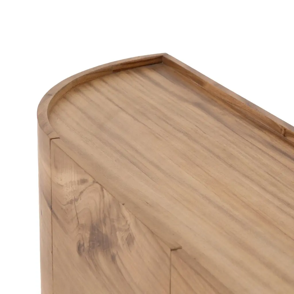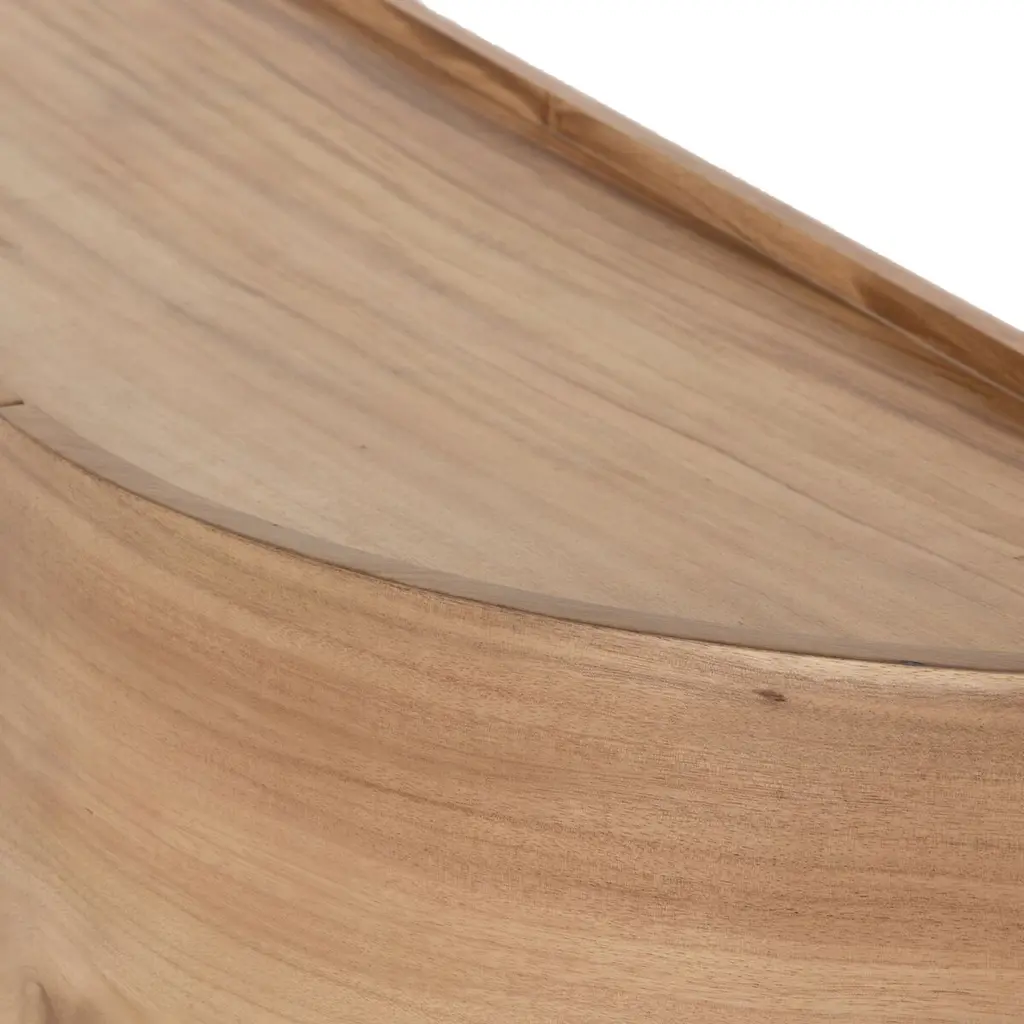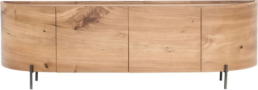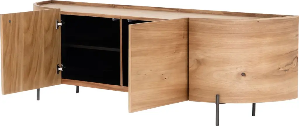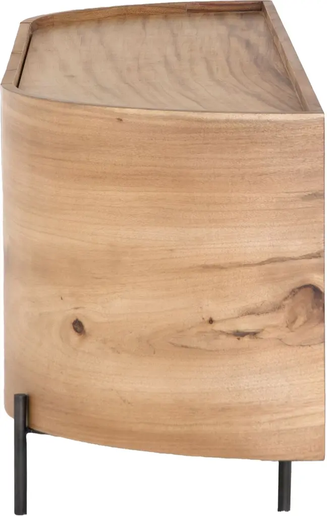 The lavish grain of the guanacaste, a durable, fast-growing hardwood, is all the decoration this media console needs. The curves of the sides echo the wood's sinuous patterns. Behind the doors are shelving and rear cutouts for cord management.