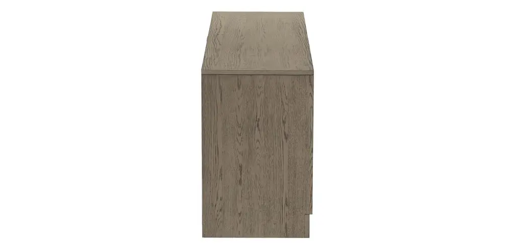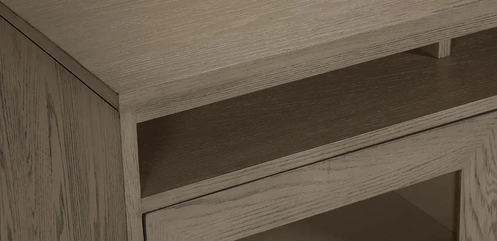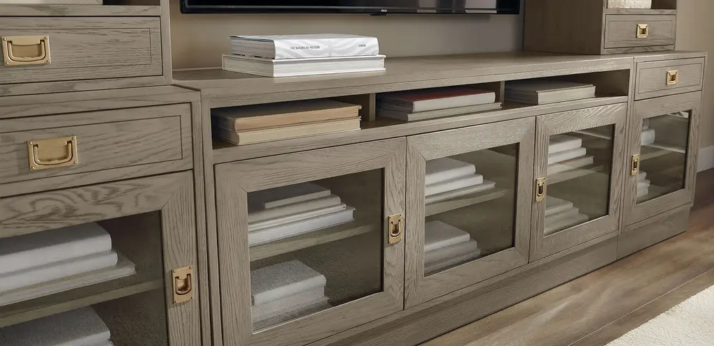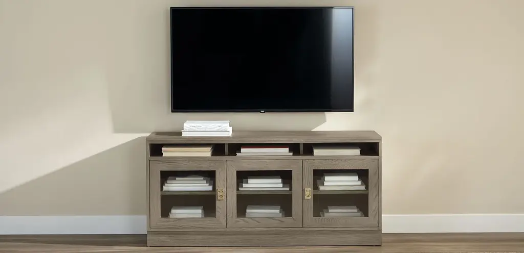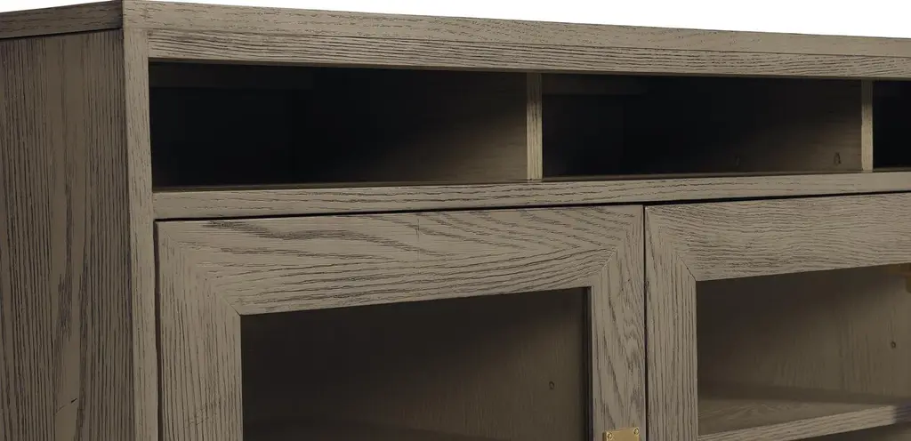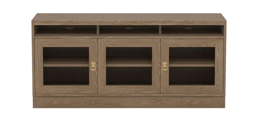 Streamline your streaming look: Place your TV atop our 60" Callum modern media cabinet. With three roomy, vented tempered glass-door cabinets for storing your game consoles and more, plus brass-plated hardware inspired by British campaign style.