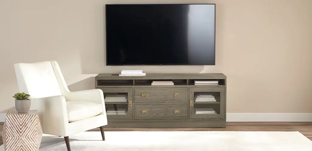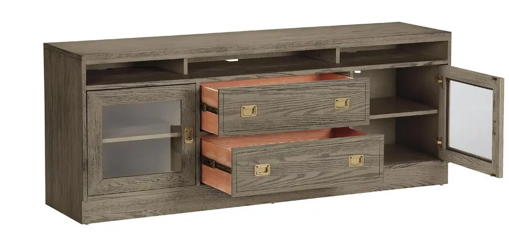 Turn that unused wall into a storage and viewing superstar with our 71" Callum media cabinet. Place electronics, board games, and more behind closed doors; use roomy storage drawers for the Blu-rays you just can't let go of. Brass campaign-style hardware adds flair to Callum's clean, modern lines.