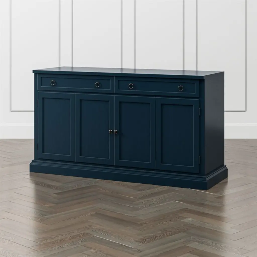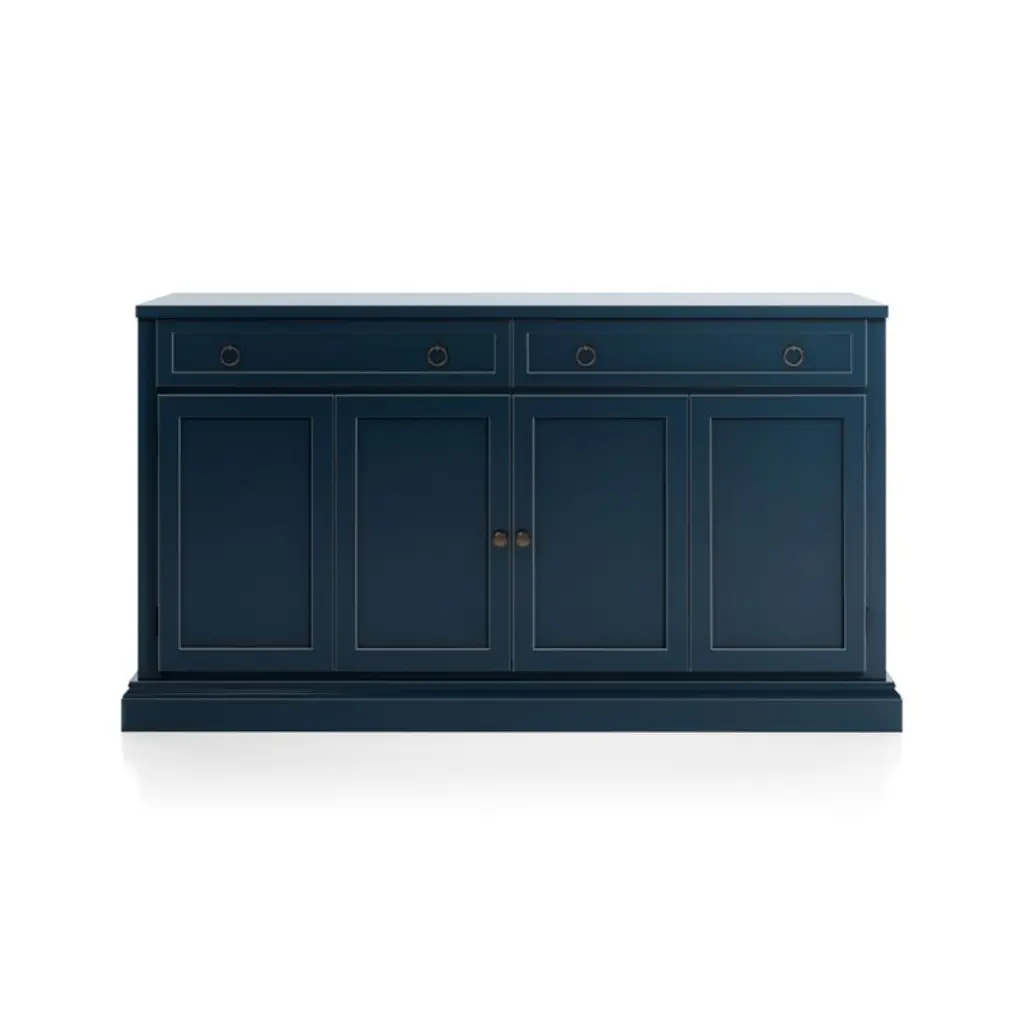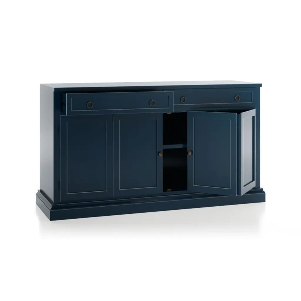Making an extended cameo appearance in the living room, family room or den, this versatile media console pairs with other Cameo modular pieces to create customized storage, media configurations and display of prized possessions. Each console exhibits a rich, multi-step indigo painted finish, hand-applied by Italian artisans.