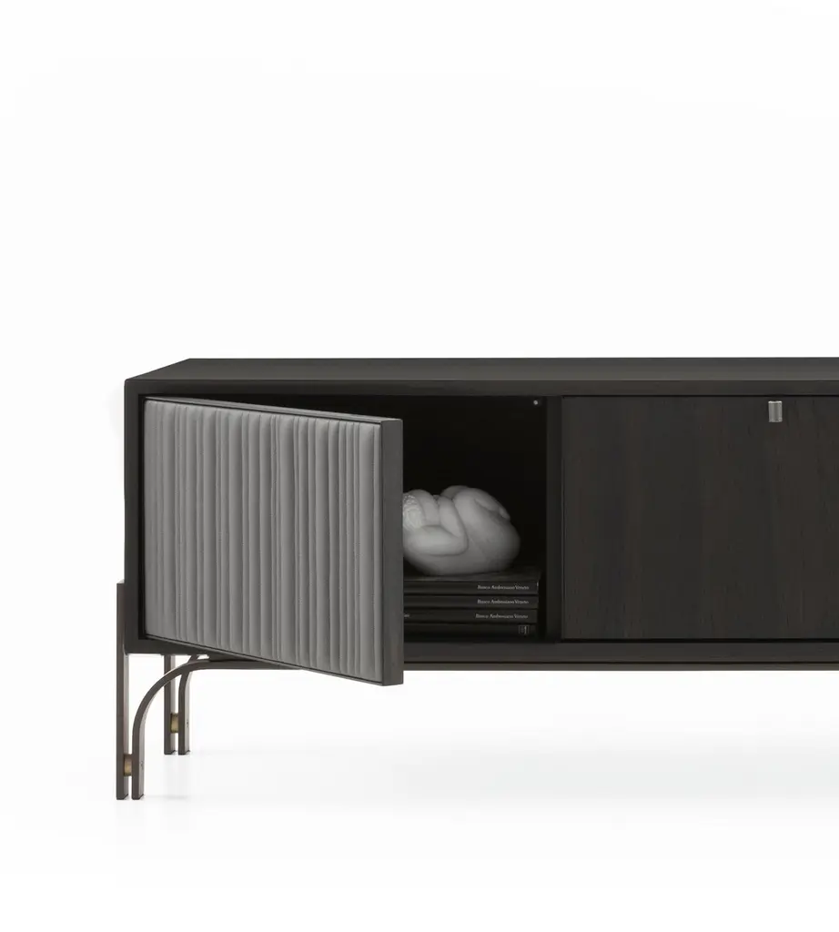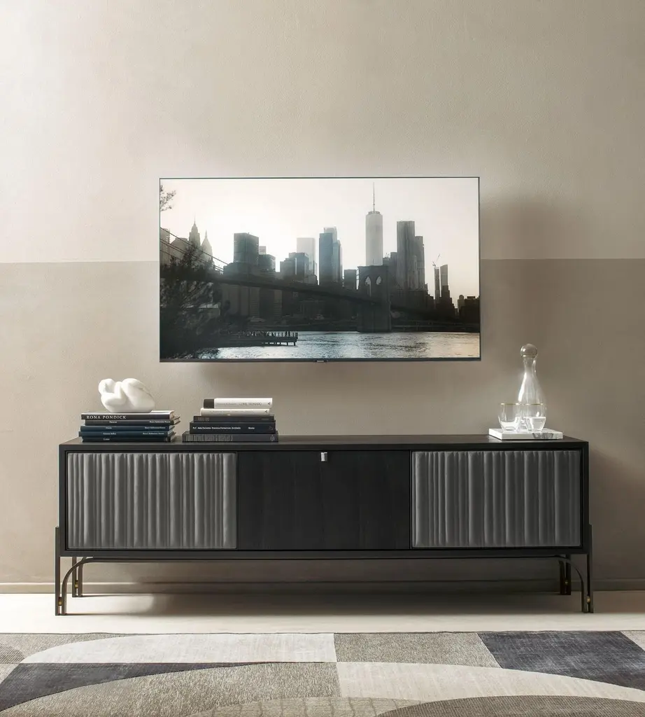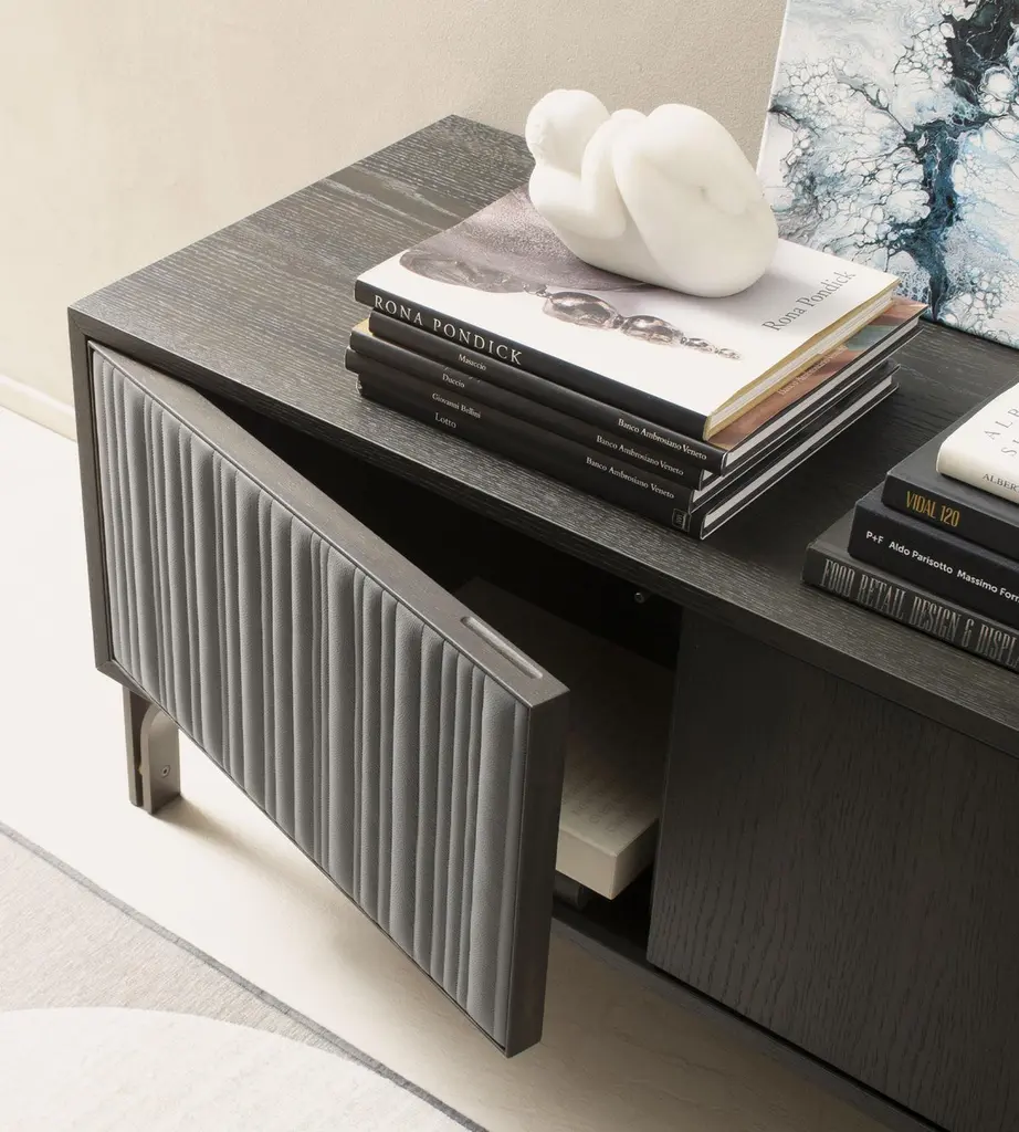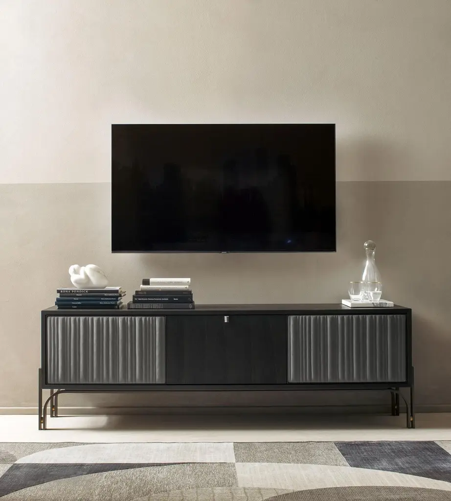 Canette TV Stand by Morica DesignDimensions: D 55 x W 171 x H 48 cm.Materials: Anthracite leather, Laguna oak, metal.Available in Canaletto Walnut, Laguna Oak, and Oak wood. Please contact us.Available in Salvia nubuck, Conchiglia nubuck, Anthracite, Tortora, Oyster, and Cognac leather options.Low dresser in real wood veneered MDF structure finished using varnishes with a very low environmental impact. Two doors upholstered in genuine leather or nubuck leather, crafted by hand to create an irregular, rounded canneté effect with a solid wood profile joined at 45° and a hollow to aid opening. One drawer in real wood veneered MDF and a handle in real leather or nubuck leather. Burnished, soft-closing hinges and push-pull mechanisms for the doors. Base in curved and dark burnished painted metal with brushed brass details.The spark of an idea began with three brothers, Moreno, Riccardo, and Carlo, and the desire to provide genuine Made in Italy design furniture, delivered to customer homes directly from the factory.We guarantee our customers a controlled, certified supply chain and an excellent service that makes it easy for their items to be delivered directly to their homes.We are a fresh organization, full of ideas with the desire to make the world a better place, to change the way we consume by providing beauty, sustainability, and reliable service!