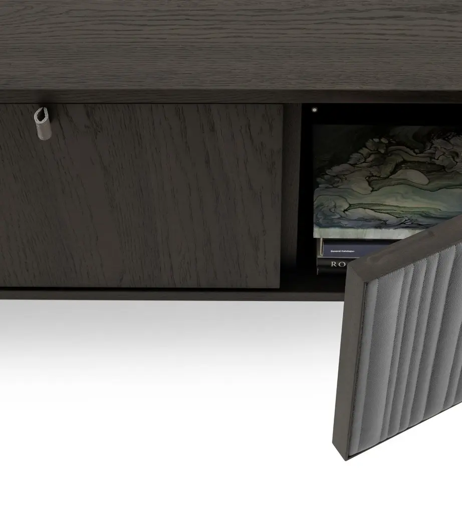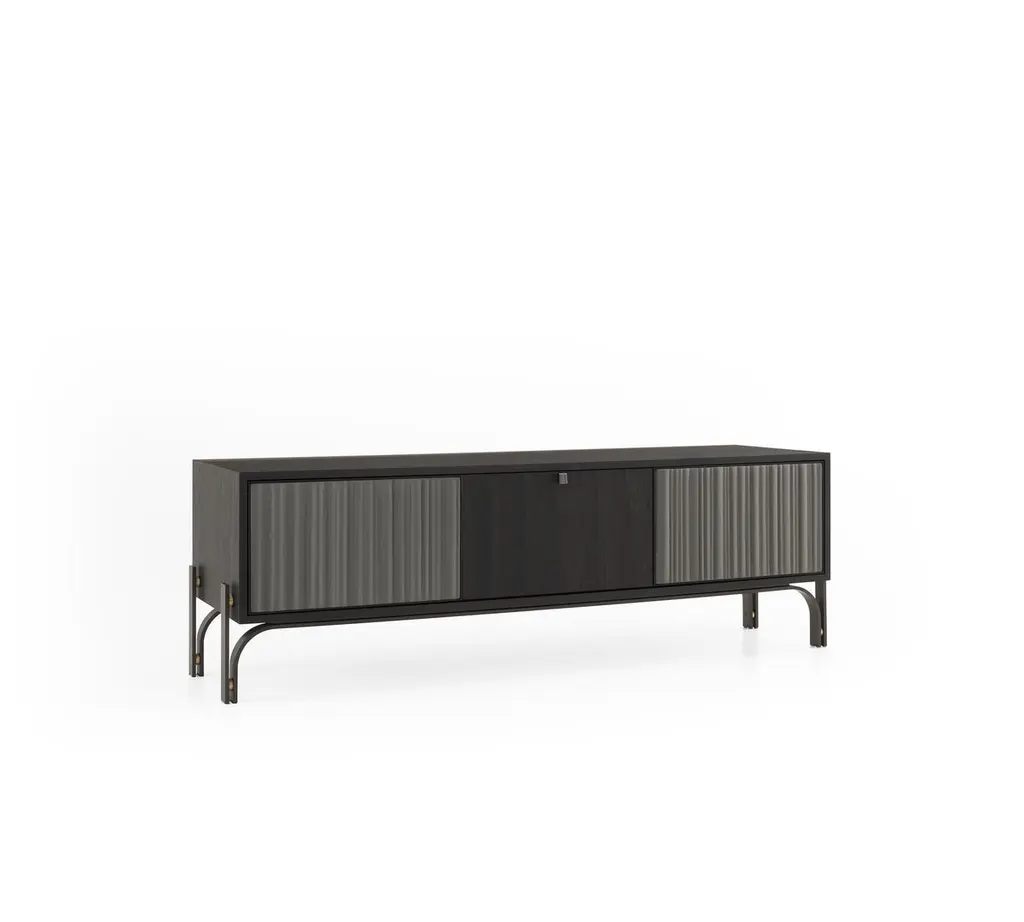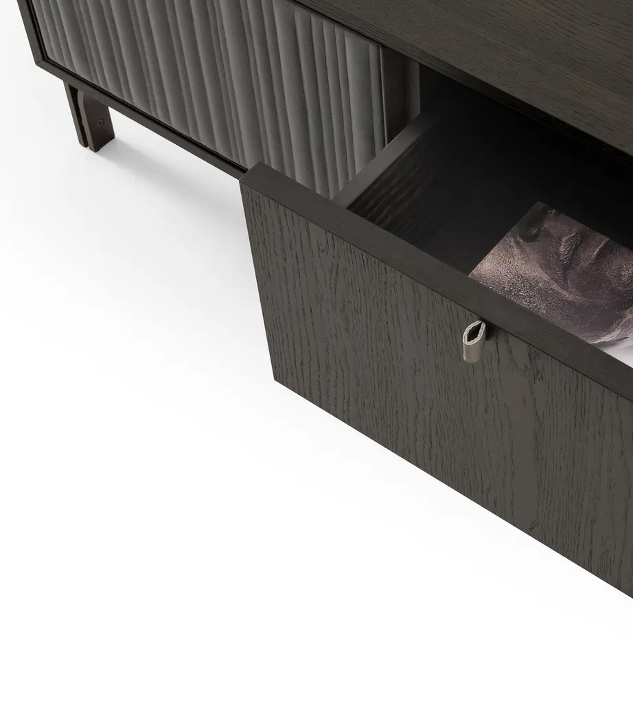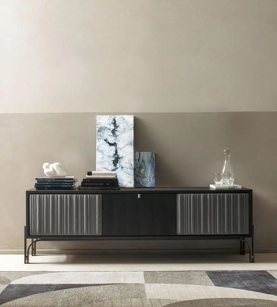 Canette TV Stand by Morica DesignDimensions: D 55 x W 171 x H 48 cm.Materials: Anthracite leather, Laguna oak, metal.Available in Canaletto Walnut, Laguna Oak, and Oak wood. Please contact us.Available in Salvia nubuck, Conchiglia nubuck, Anthracite, Tortora, Oyster, and Cognac leather options.Low dresser in real wood veneered MDF structure finished using varnishes with a very low environmental impact. Two doors upholstered in genuine leather or nubuck leather, crafted by hand to create an irregular, rounded canneté effect with a solid wood profile joined at 45° and a hollow to aid opening. One drawer in real wood veneered MDF and a handle in real leather or nubuck leather. Burnished, soft-closing hinges and push-pull mechanisms for the doors. Base in curved and dark burnished painted metal with brushed brass details.The spark of an idea began with three brothers, Moreno, Riccardo, and Carlo, and the desire to provide genuine Made in Italy design furniture, delivered to customer homes directly from the factory.We guarantee our customers a controlled, certified supply chain and an excellent service that makes it easy for their items to be delivered directly to their homes.We are a fresh organization, full of ideas with the desire to make the world a better place, to change the way we consume by providing beauty, sustainability, and reliable service!