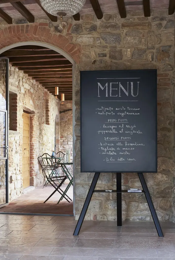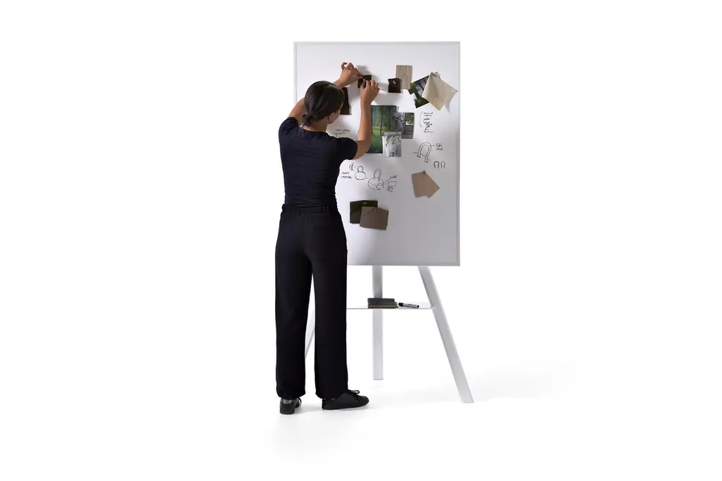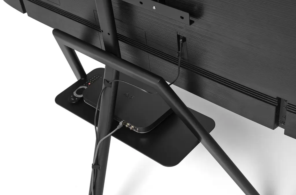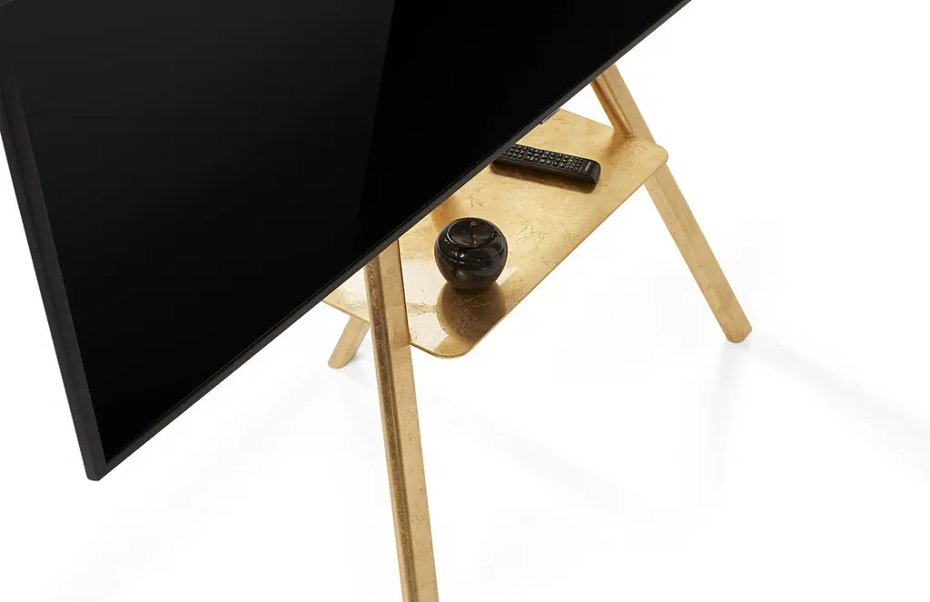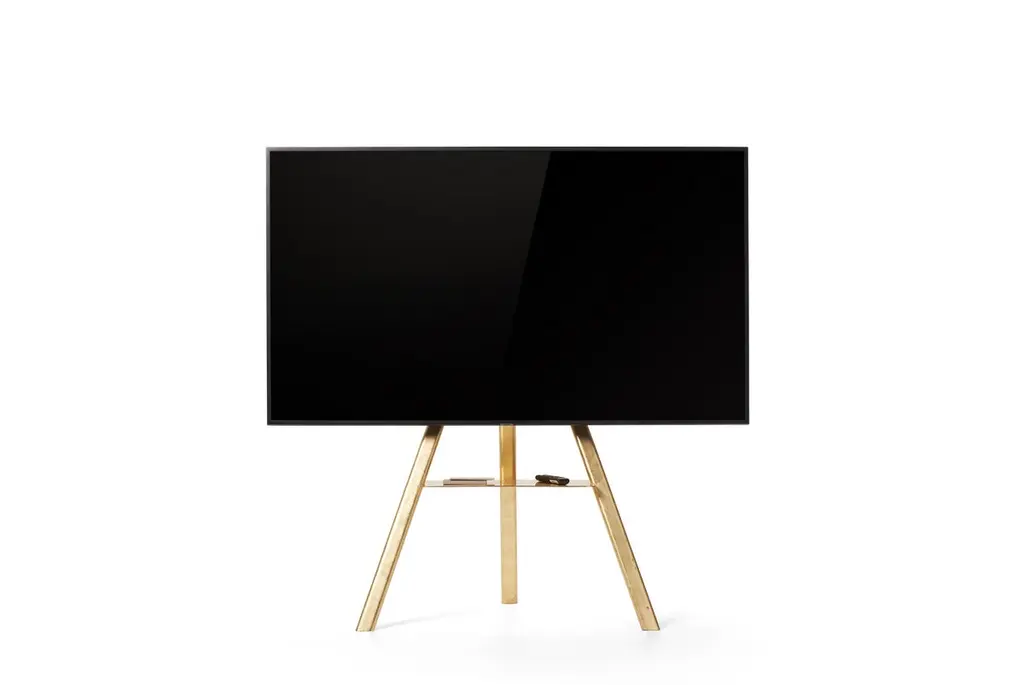Cartesio, a steel trestle/stand for multimedia appliances with cable management column and integrated shelf by Lapo Ciatti, is the answer to these reflections. Cartesio is designed for large TVs but it is also a stand for special magnetic boards on which to pin ideas and reflections. Impeccable in black, essential in white, especially stylish in gold leaf, Cartesio is ideal for both education and leisure. With Cartesio you can project old auteur films, modern productions, immersive video games, challenging slides, or show complicated mathematical graphs, fascinating mood boards, stunning keywords, or delicious menus of the day. Whether in education and training institutes, bars and restaurants, conference centres, meeting rooms, your living room or home studio, Cartesio nurtures knowledge and style.Steel stand/TV stand with cable management column and built-in shelf for TVs from 43 to 82 inches. Structure finishes: matt - black or white. Glossy - gold leaf. Accessories: magnetic writing board with aluminium frame available in two versions: black for chalk, white for markers. Frame in matching colour. Additional Information: Materials: SteelFrame finish: Matt blackDimension: W 102 x D 57 x H 142 cmAvailable in other frame finish option: Matt white, glossy gold leaf Available in other structural options: Writing BoardNote: For TVs with a maximum weight of 48 kg. Maximum weight capacity of shelf for appliances: 5 kg.