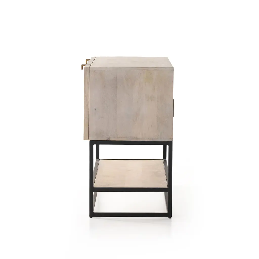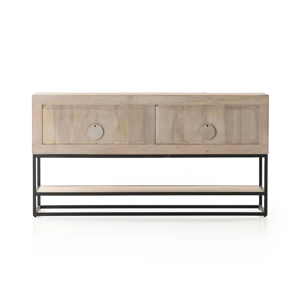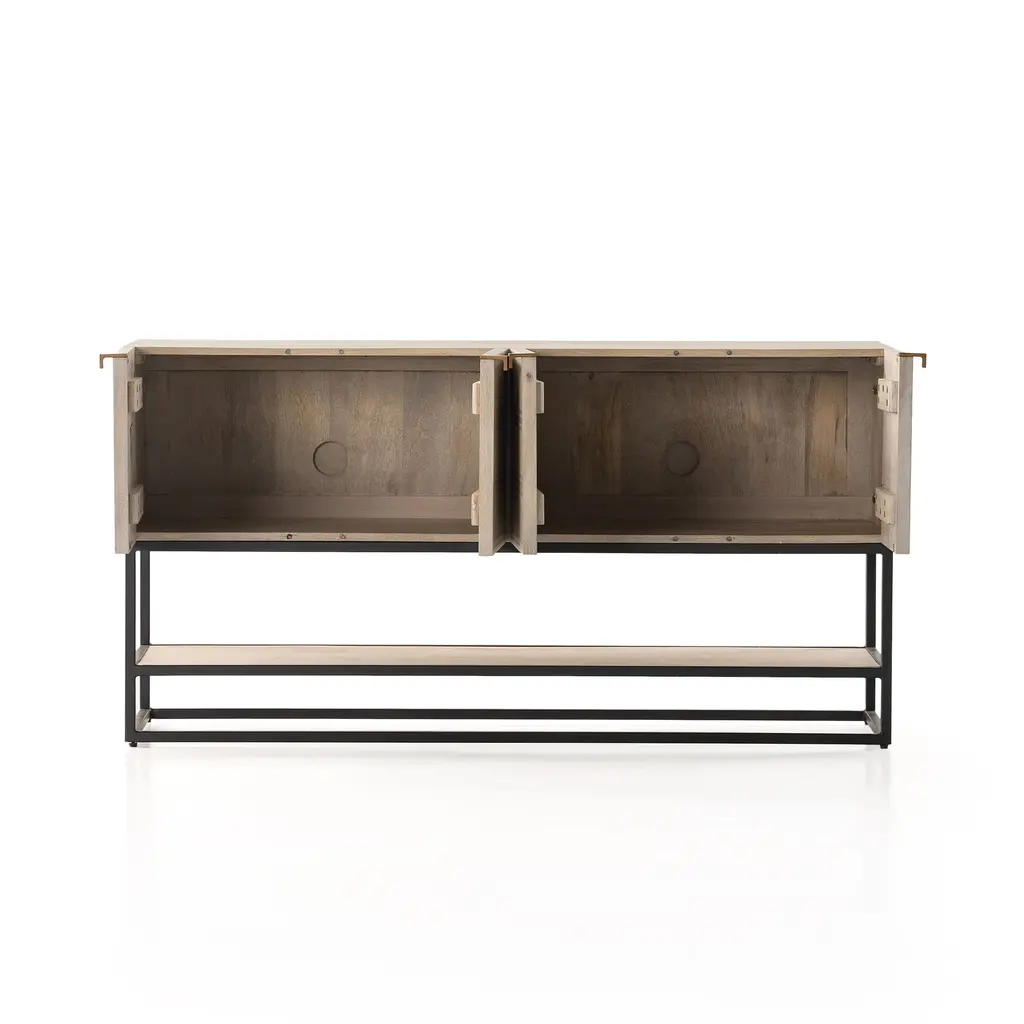 Crafted from durable mango wood and iron. Two spacious cabinets covered by beautifully carved doors. Keep books and electronics organized.