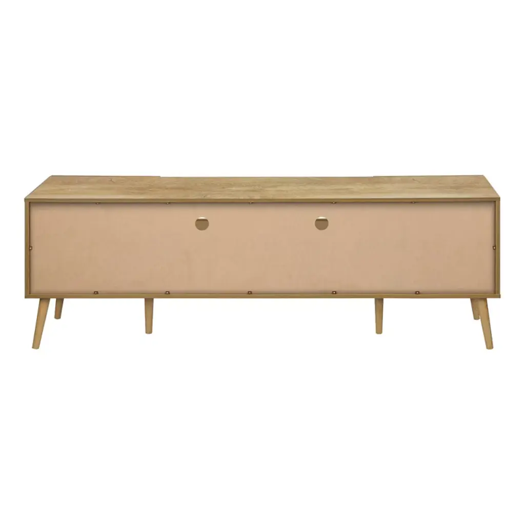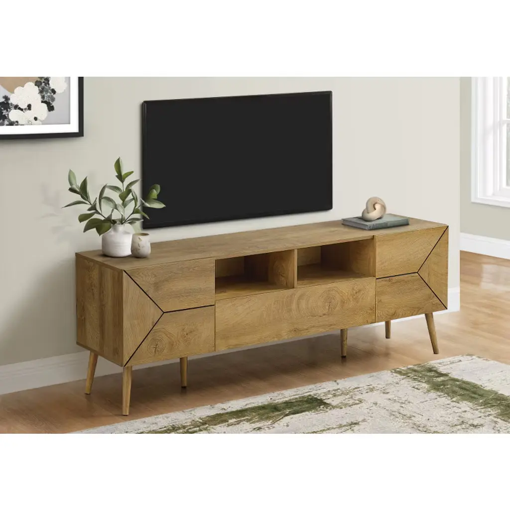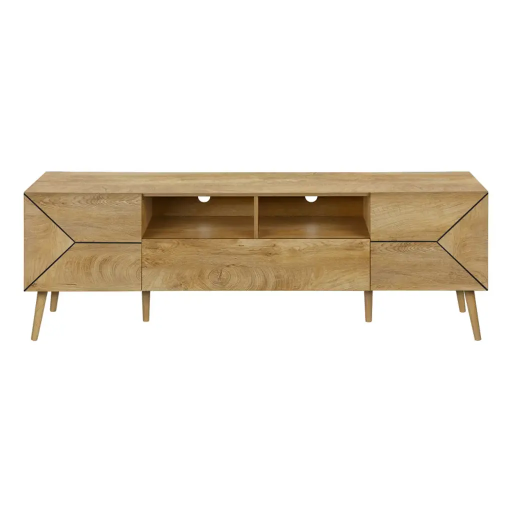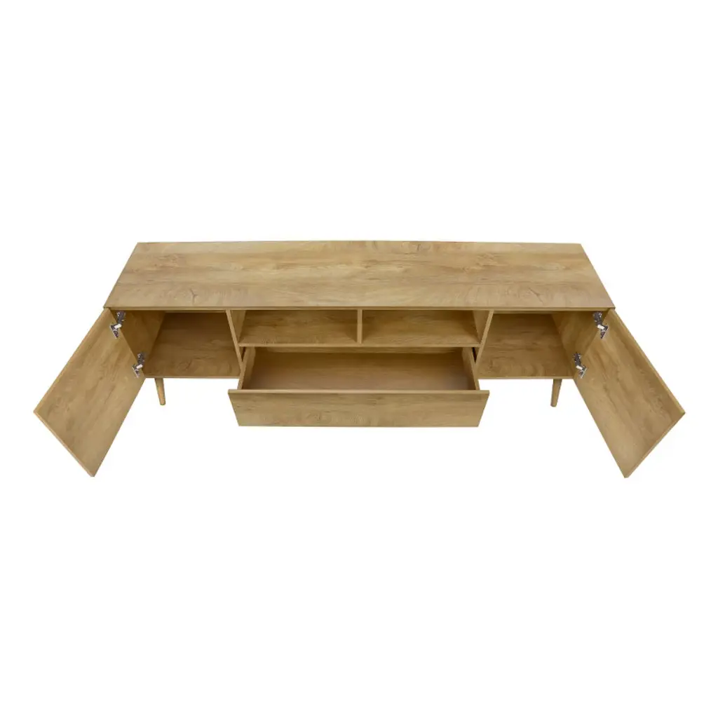 A highly functional 72 inch tv stand console unit with a smooth, light walnut laminate finish in a mid-century, retro style and abundant storage options.Featuring a large, easy glide storage drawer, 2 open cubbies, and 2 storage cabinets accented with stylish grooved lines for all your media and entertainment storage needs.Durably designed with solid construction that includes solid wood legs, 2 cable management holes in the back to keep cords out of sight and an easy to clean top for hassle-free maintenance.Easy to assemble with illustrated instructions and all hardware included.