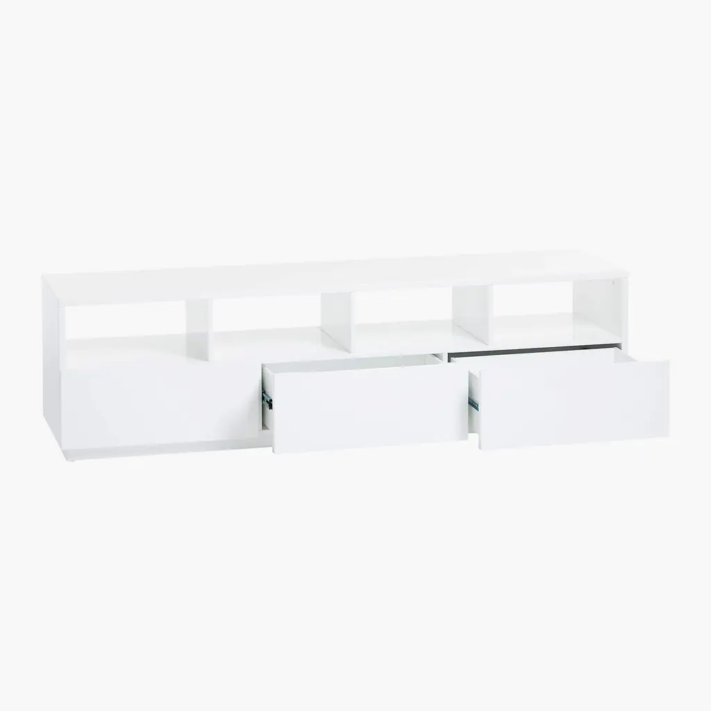 Thoughtful details and workmanship by Eric Pfeiffer at an exceptionally thoughtful CB2 price (of course). Four open component cubbies span over three XL closed drawers angled to open sans pulls on smooth metal glides. Smart details you can't see here: back is completely finished—all white, all around—so it can float in the room; center media cutouts funnel cords to an integrated ledge along the entire lower back edge then out the bottom to tidy up wires. Engineered wood slicked in hi-gloss lacquer. Chill Large White Media Console is a CB2 exclusive.