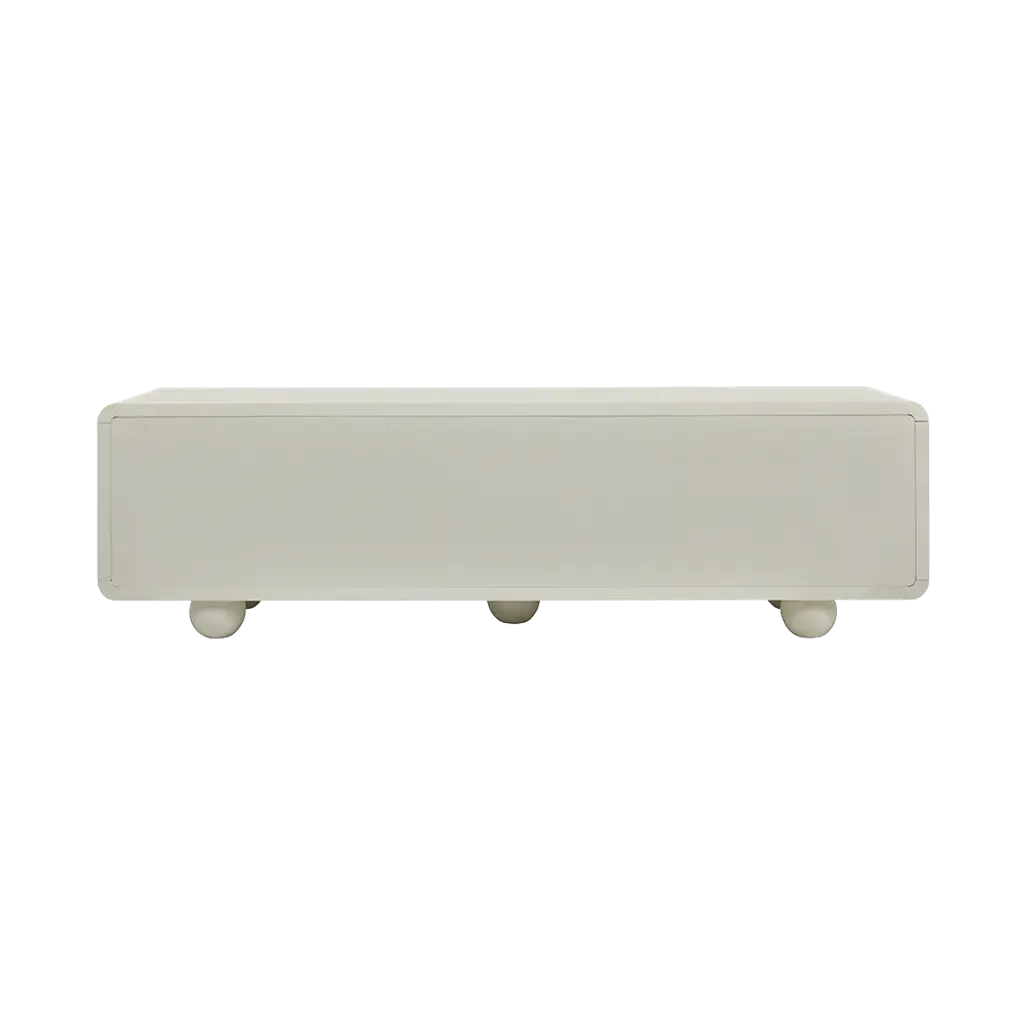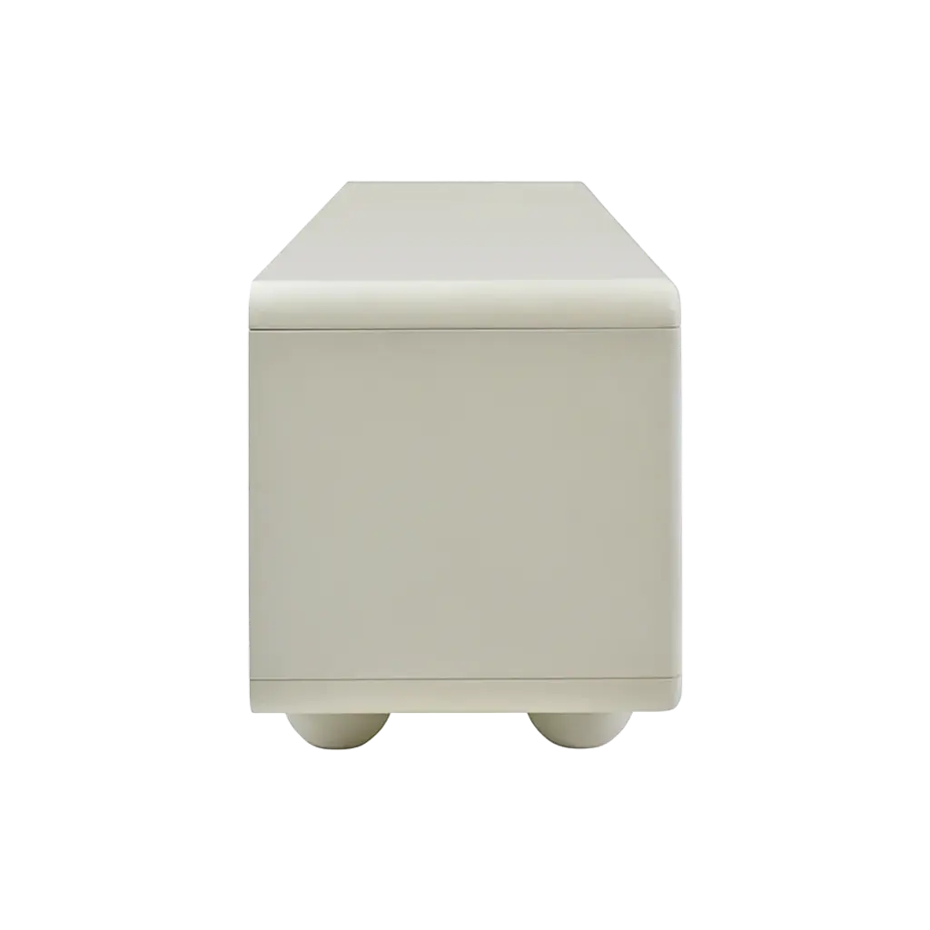 The Cielo TV Stand in Alabaster is a sophisticated and modern storage solution, crafted in a smooth alabaster finish that adds a touch of elegance to any living space. Featuring a sleek, rectangular design with four opening doors adorned with unique arched designs, this stand rests on five spherical legs for a distinctive, floating appearance. The interior offers ample shelving space, perfect for organizing media equipment and accessories, making it an ideal centerpiece for contemporary entertainment areas.