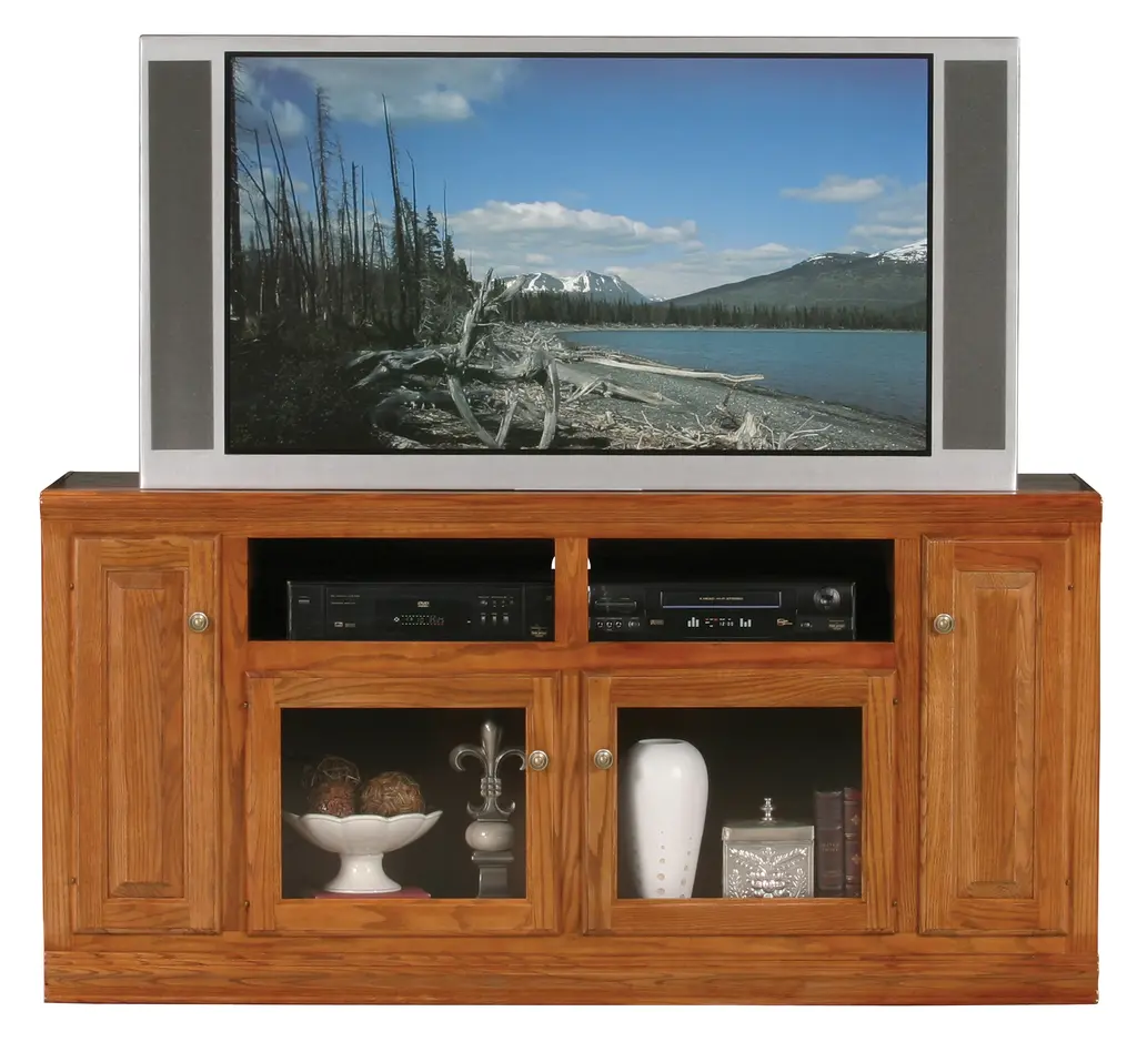 American oak hardwood and traditional styling make the Classic Oak collection one for the ages. Crown moulding, antique brass hardware and solid oak frames and raised panel doors combine longevity and classic style in this enduring and popular collection.Innovation, Quality, and Design are the unique characteristics that have distinguished Eagle Furniture Manufacturers as America's favorite maker of home Entertainment Consoles, TV Stands, and Bookcases. Rooted in three decades of experience and grounded in the belief that today's consumer values American Crafted quality made furniture for their homes. Eagle Furniture Manufacturers achieves success through a commitment to superior craftsmanship, product innovation, coupled with exceptional service. Manufacturing from their facility in Bowling Green KY, Eagle Furniture Manufacturers work endlessly to be a leader in the industry, setting the standard for today and the future.Features:Solid Furniture grade oak Ply2 Plain Glass Wood Framed Doors2 raised Panel Doors2 Fixed Wood ShelvesDecorative MouldingPlain BaseMultiple FinishesPlease see secondary image for finish swatch