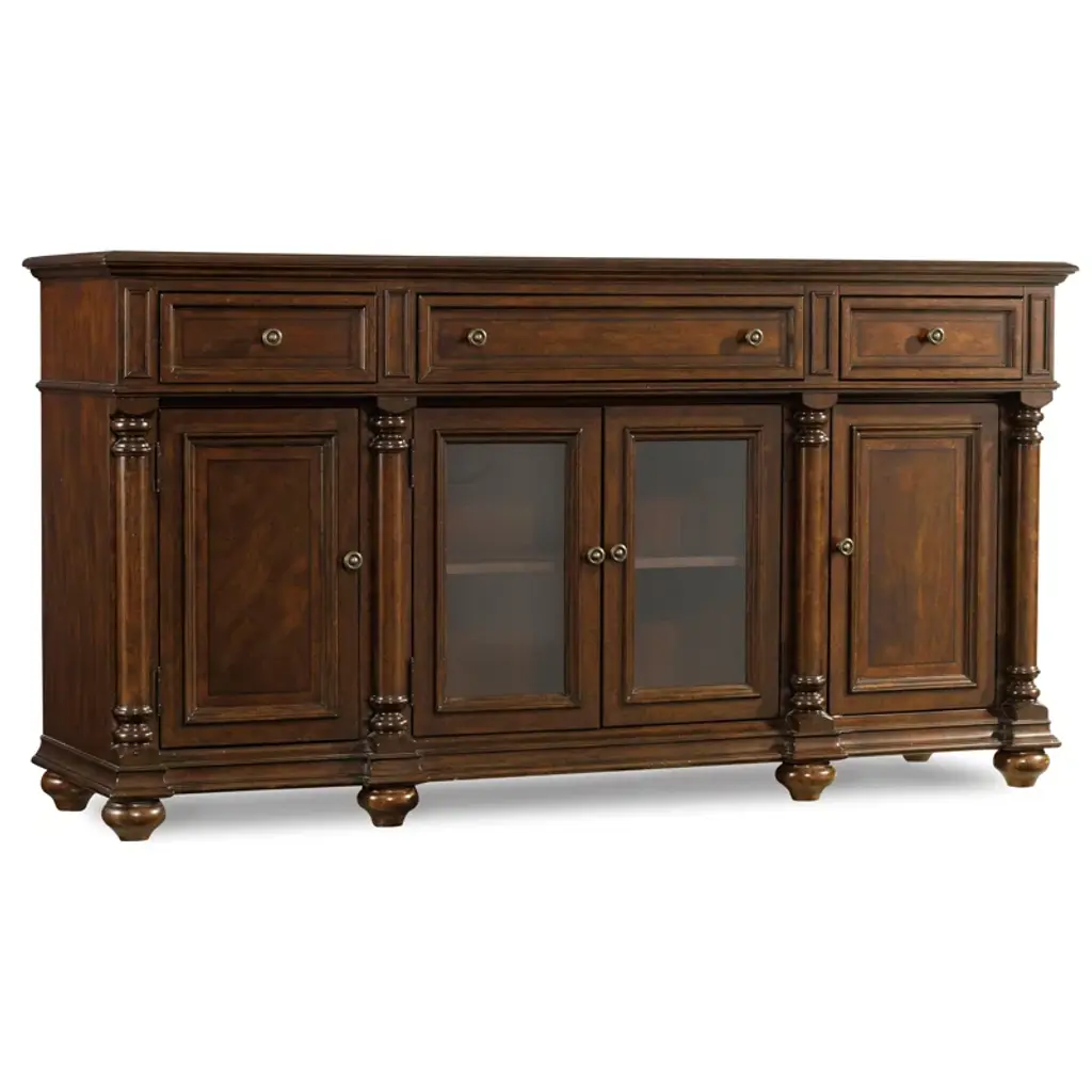 Create a living room entertaining space where elegant style and functionality take center stage with our Cleveland entertainment console. Crafted of solid poplar with a multi-step, brown finish with rub-through and distressing, this entertainment console has three drawers to stow your tech accessories and two adjustable shelves behind each wood-framed glass door to hold your electronics.