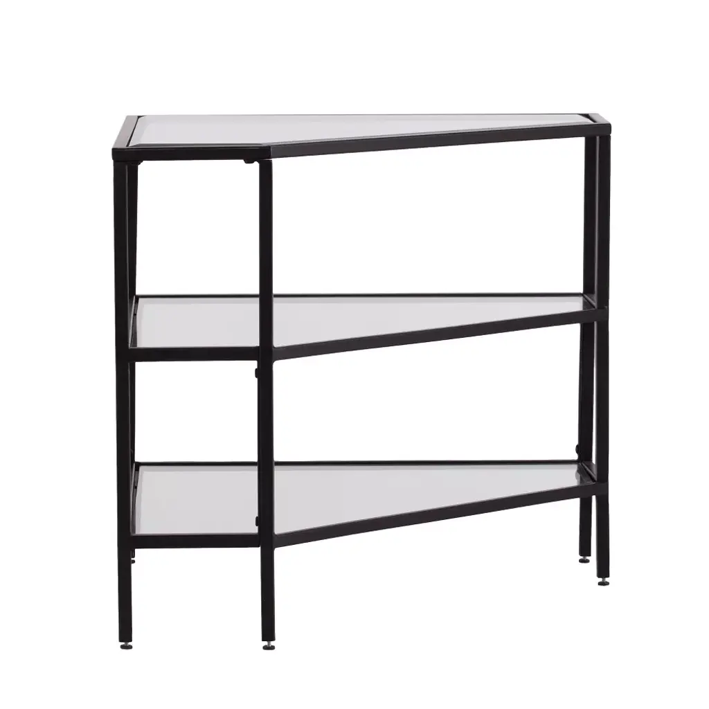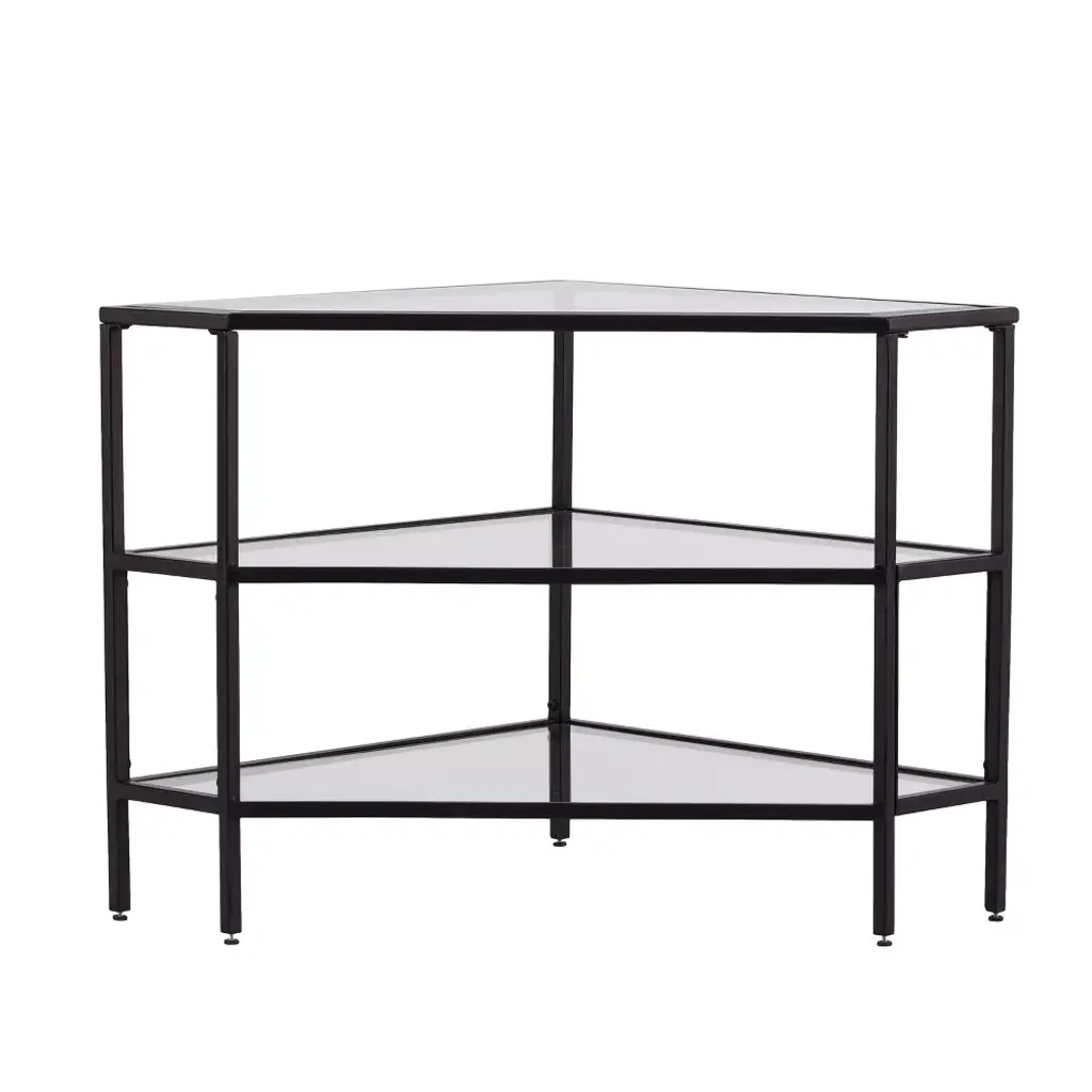 Add sleek minimalist style to your living room with the Conrad Metal/Glass Corner TV Stand from Aiden Lane. With two angled corners and a triangular shape, this simple TV console fits into corners so you can make it work in any room. Three glass shelves can support your media equipment or decorative pieces.