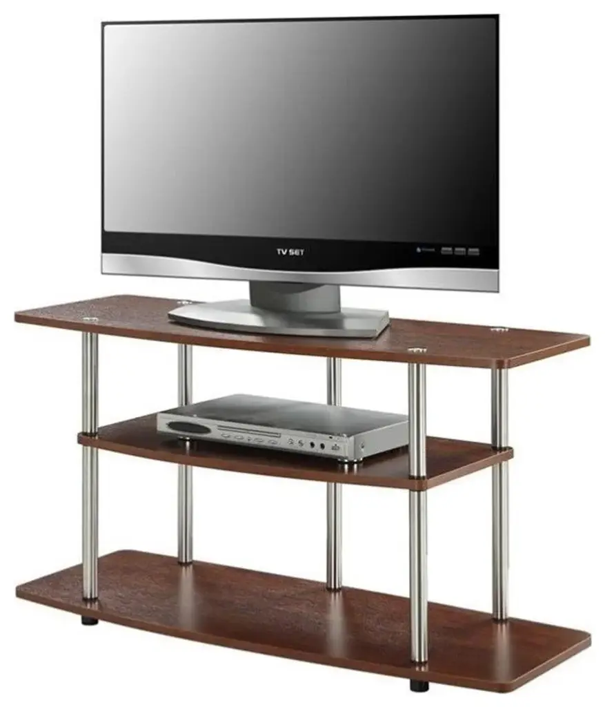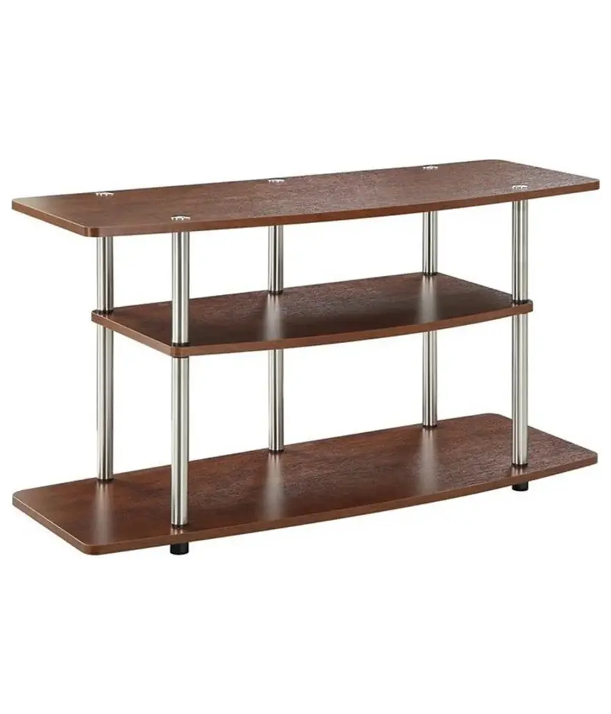 The Designs2Go 3 Tier Wide TV Stand is the perfect complement to any living room décor. Featuring an open modern design that allows for easy cable management. Also featuring three spacious shelves that will give you plenty of room for all of your media components. Made of wood and stainless steel components, this product is built to last for many years of enjoyment. With a beautiful cherry wood finish, this stand will provide a rich compliment to the look of any room it is added to.Features:No Tools RequiredBeautiful Cherry Wood Grain FinishStainless Steel Poles Won't RustWill Provide Years of Enjoyment.(W) 42" x (L) 15.75" x (H) 21.63"Three separate shelvesSpecifications:Product Dimensions: (W) 42" x (L) 15.75" x (H) 21.63"Product Color: Cherry