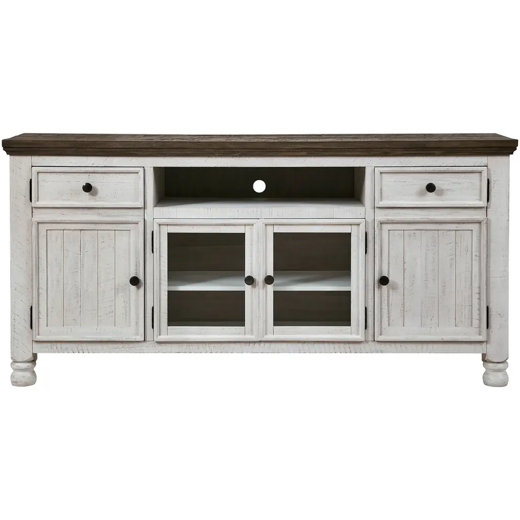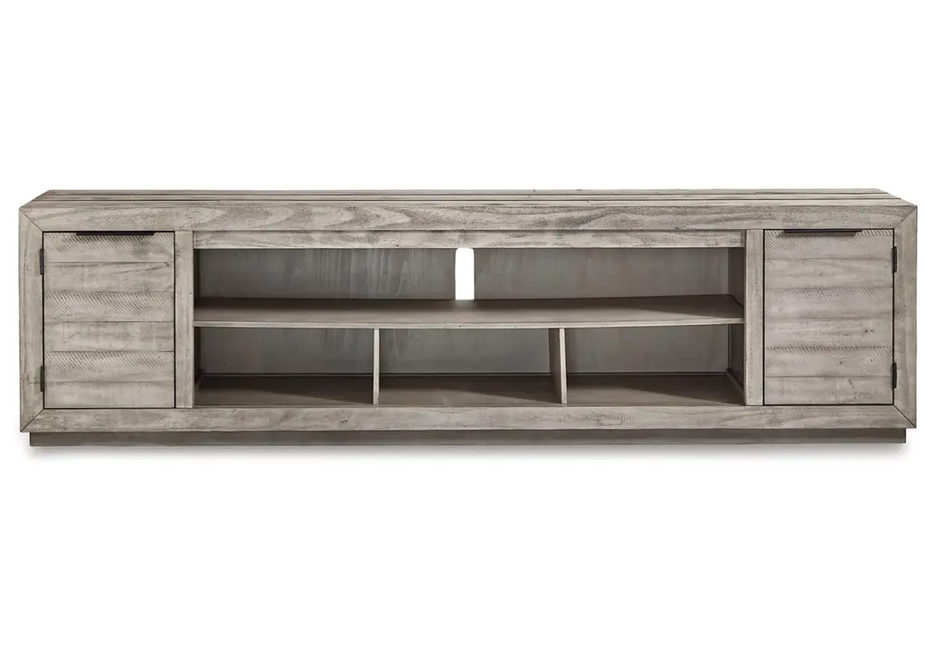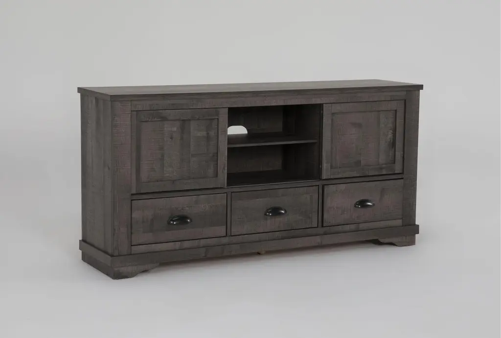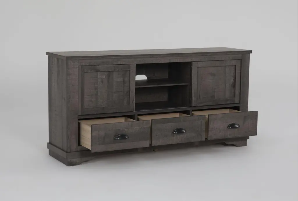 The Coralee Grey 63" Rustic Wood TV Stand is the perfect addition to your living room, offering both functionality and style. Its rustic grey finish provides a timeless, classic look that complements any decor. With ample storage space, this entertainment center features sliding doors, shelves, and drawers to keep your media essentials organized.