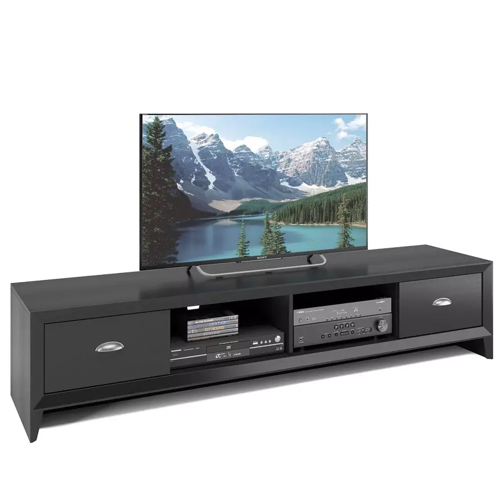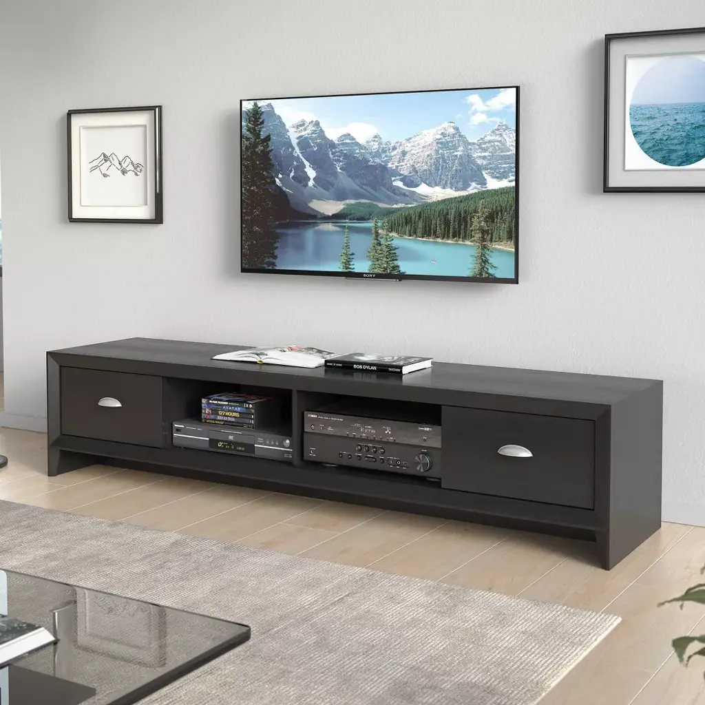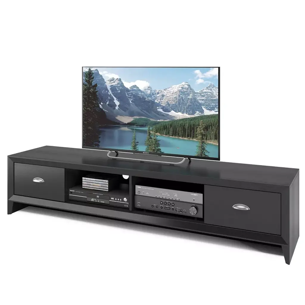 Sleek and modern design is showcased in the Lakewood TV Stand. This low profile, extra‐long bench features a black faux wood grain finish, accented with imitation nickel handles. It includes two spacious drawers for concealed storage and two open center shelves for additional storage and display options. Offering a variety of open and concealed storage, it is the perfect solution for maintaining a classic and organized appearance in your living room or entertainment space.Product dimensions: 15.5"H x 71"W x 16.5"DMax Weight: 150 lbs