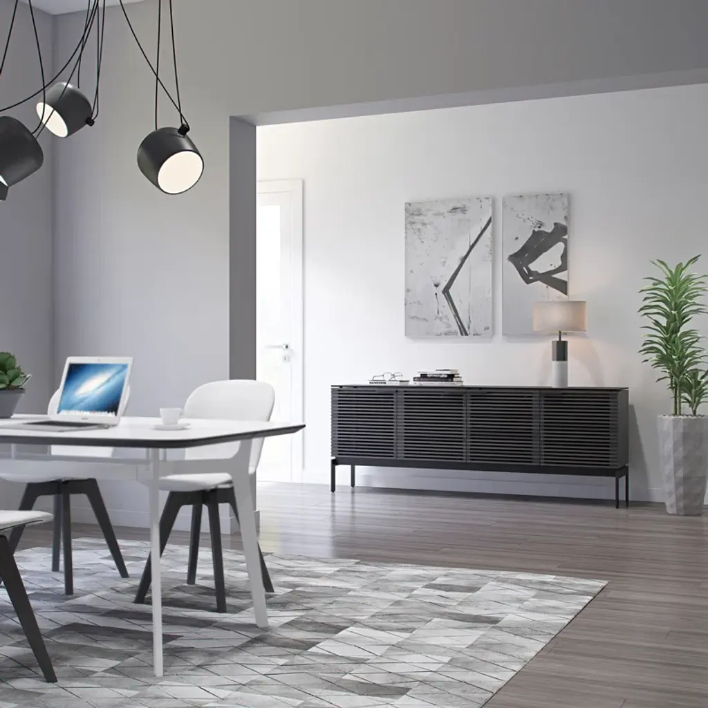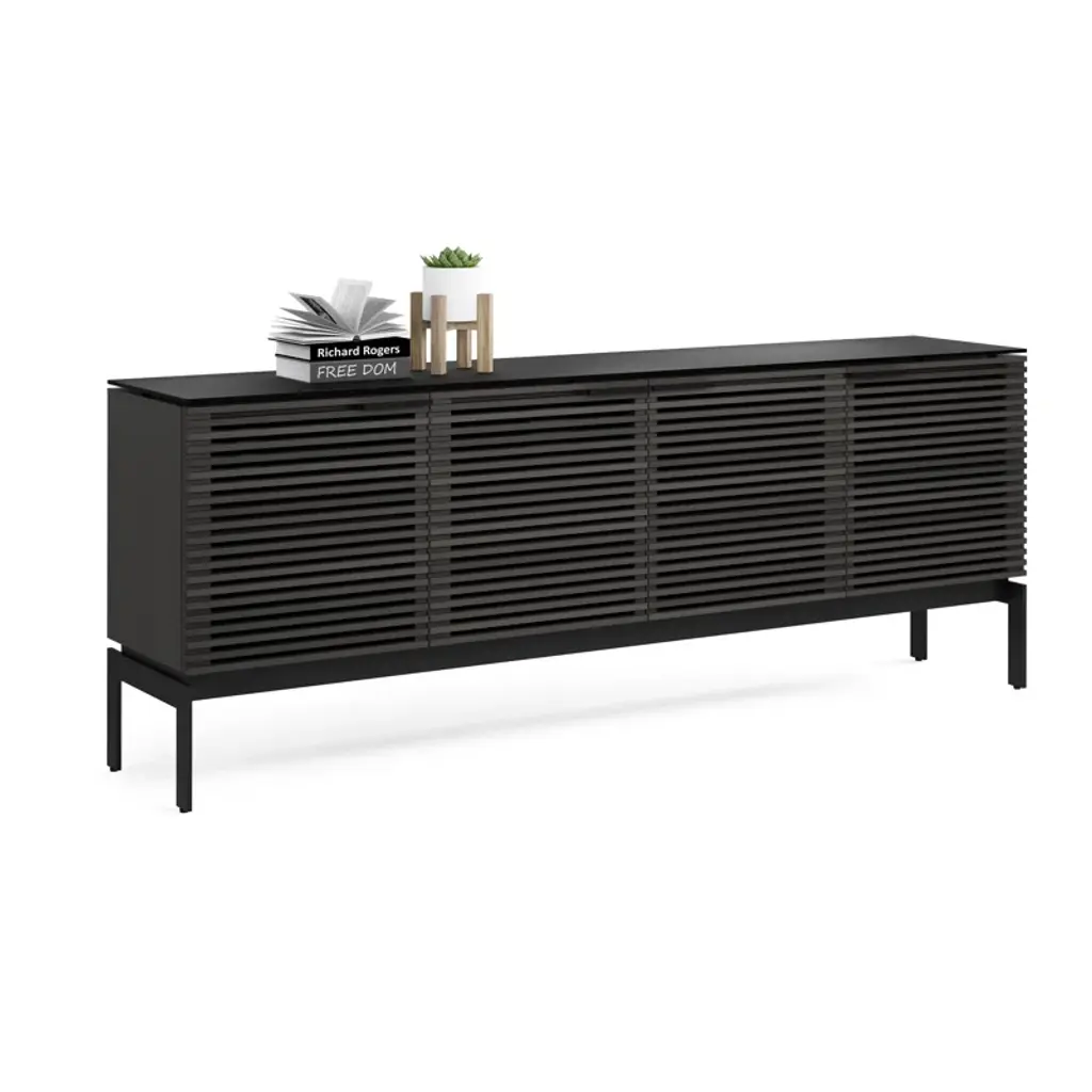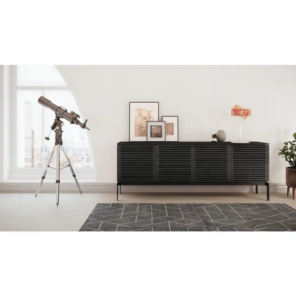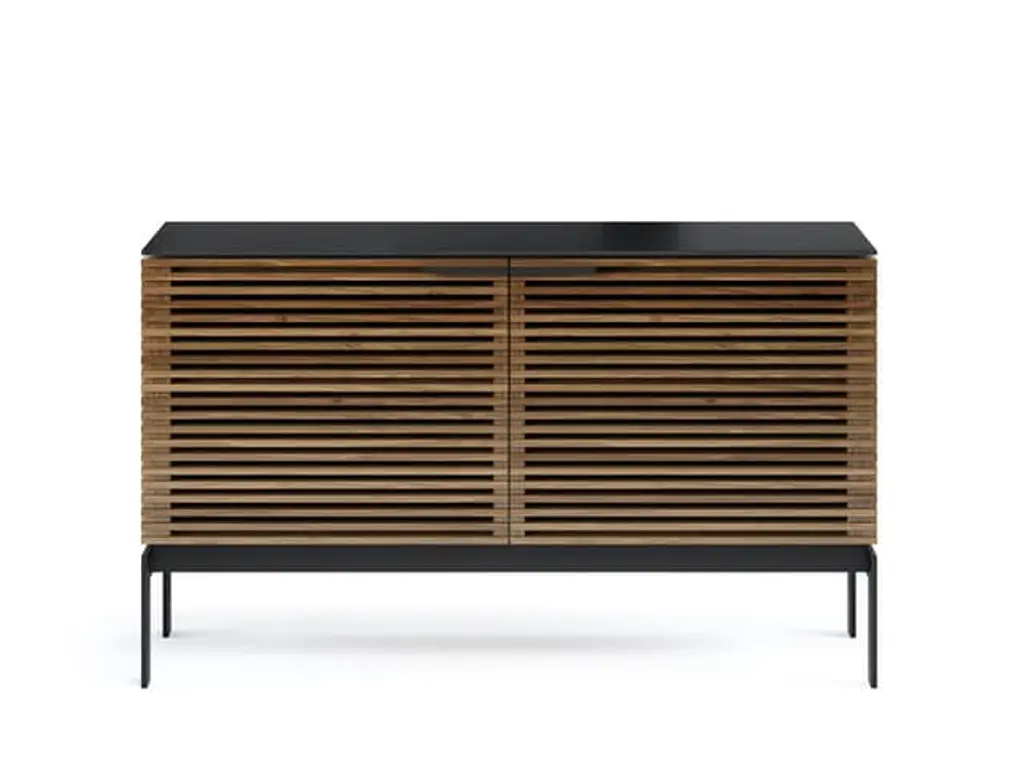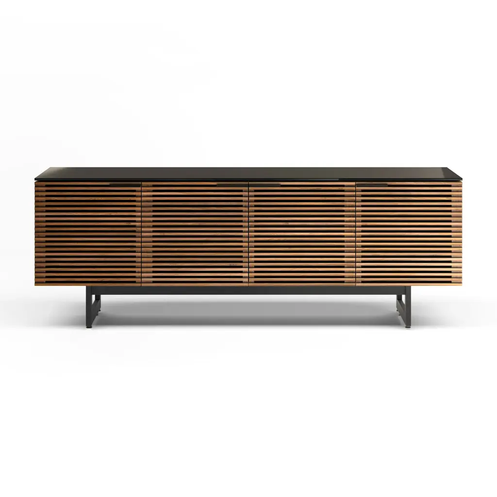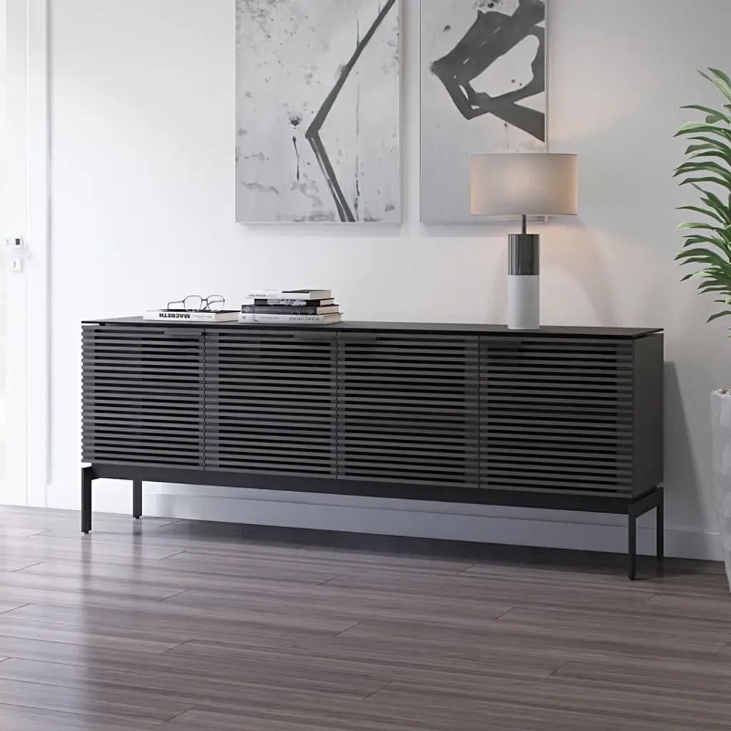 Whether used as an attractive storage credenza in a dining room or hallway or as the center of your compact media set-up, the svelte design of the TV stand packs a lot of performance into a slim footprint.