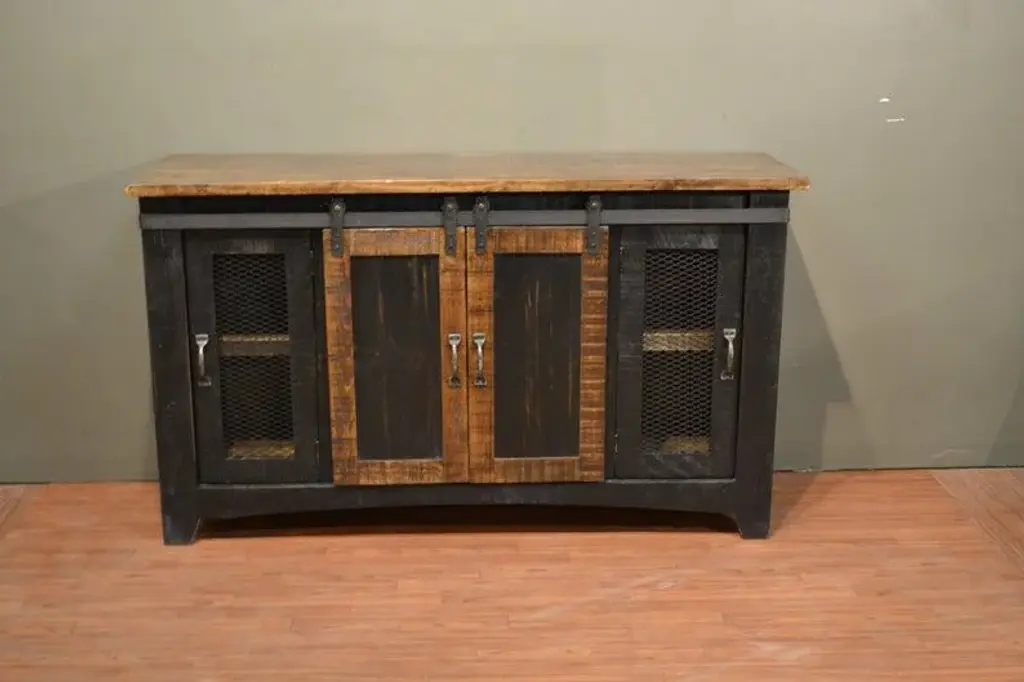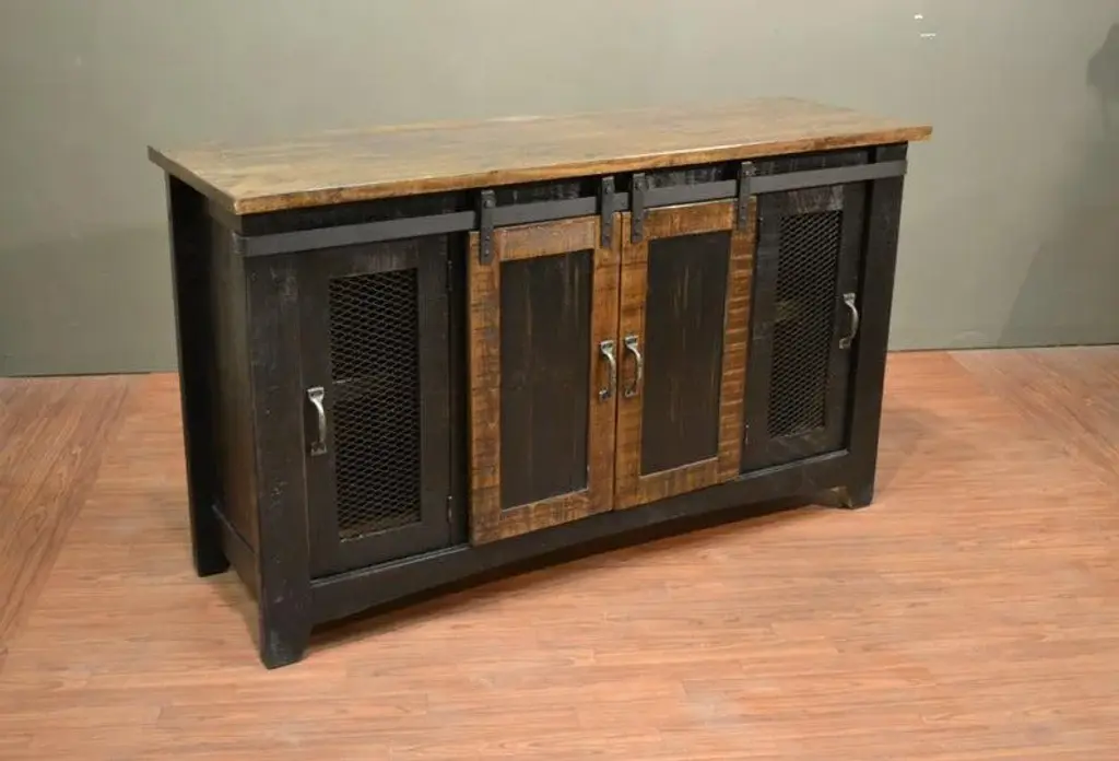 The Greenview Collection features solid wood furniture with rustic and refined industrial details and finishes. This is a new, never used piece Also available in a 70" and 80" TV Stand Solid Pine wood Mortise and Tenon joinery Grommet hole for cable management Dimensions: 59.75W x 19D x 34.75H Center Interior Dimensions: 22.75 wide x 11.75 deep (shelves) 7" height between shelves Behind Cage Door: 11.5 wide x 11.75 deep (shelf) 11.5" height above and below shelf Free Shipping: We do our best to have your item delivered within 2 - 3 weeks. More rural or hard to reach areas can take up to 5 weeks. The shipper will only move the item through the front door of your home or building. Chairish sells electronic items only with the display as the intended use. The electronic elements are not guaranteed to be in working order by Chairish.