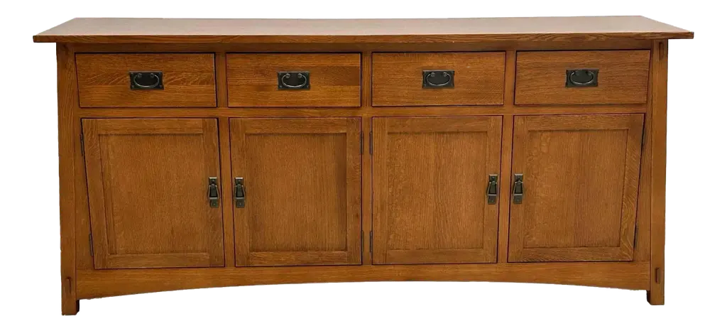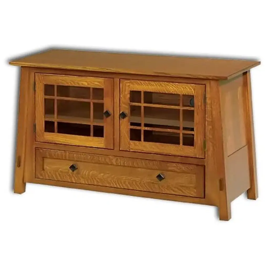 Our Mission / Arts & Crafts style furniture is made with attention to detail and expertise like that of 100 year old Stickley. - Solid quarter sawn white oak with a medium-dark brown stain - Remote can reach components through glass doors - Removable glass shelves behind glass doors, removable wood shelf behind center doors - 2 Drawers feature dovetail drawer fronts and metal glides - 2 grommet holes behind each glass door for cable management Dimensions: Overall: 72W x 17D x 32H Drawer: 29W x 10.75D x 7.5H Behind glass doors: above shelf: 21W x 14.5D x 8H below shelf: 21W x 14.5D x 9H Behind center doors: above shelf: 21W x 14.5D x 8H below shelf: 21W x 14.5D x 9H