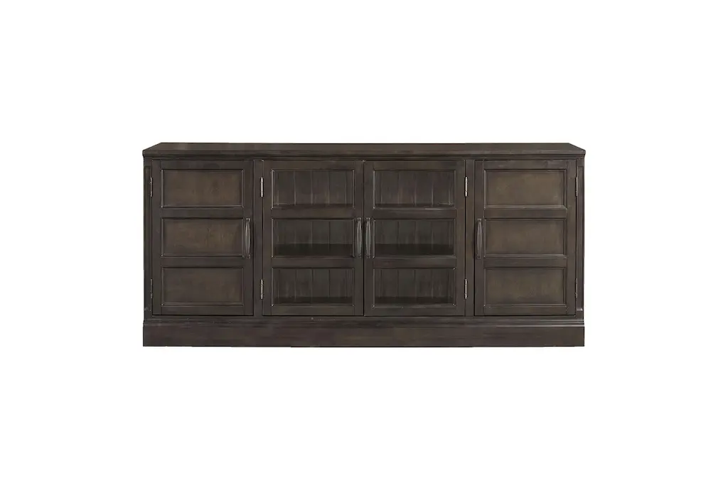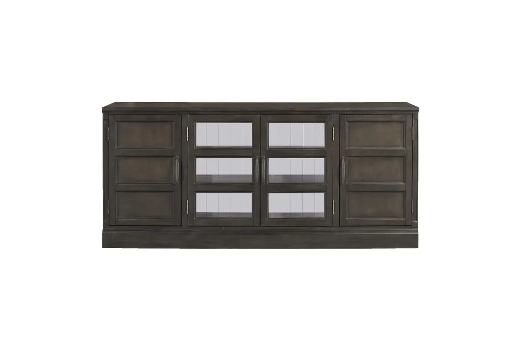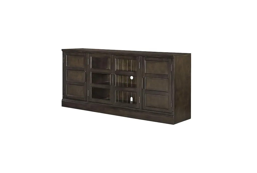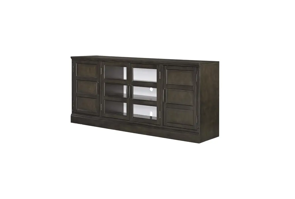 Bring a touch of traditional elegance to your living room with the Cromwell Brown 76" TV Console. This stunning piece features ample storage, including shelves and doors with glass fronts, all crafted from high-quality wood and designed with cord management in mind.