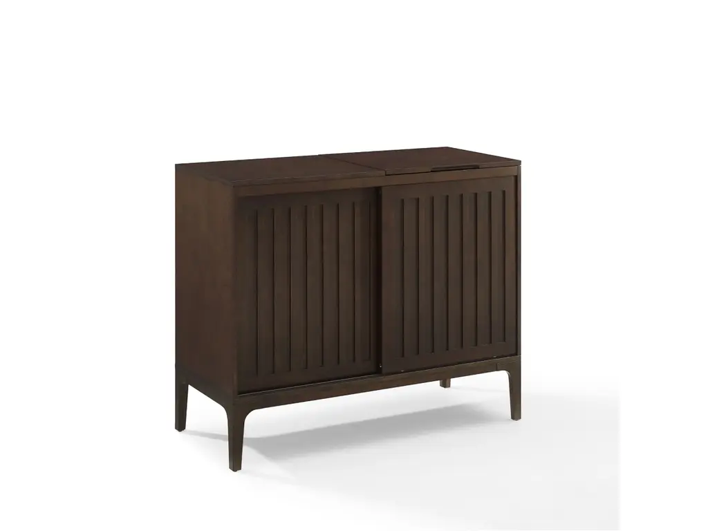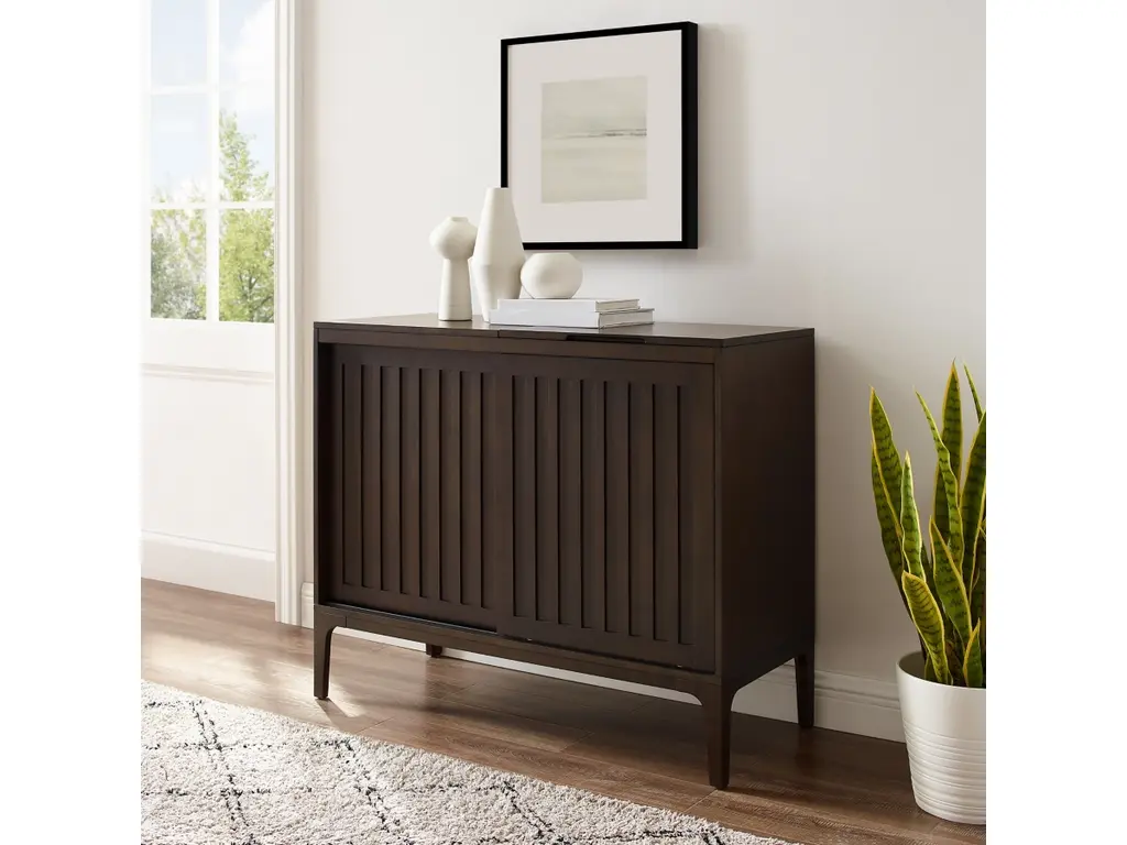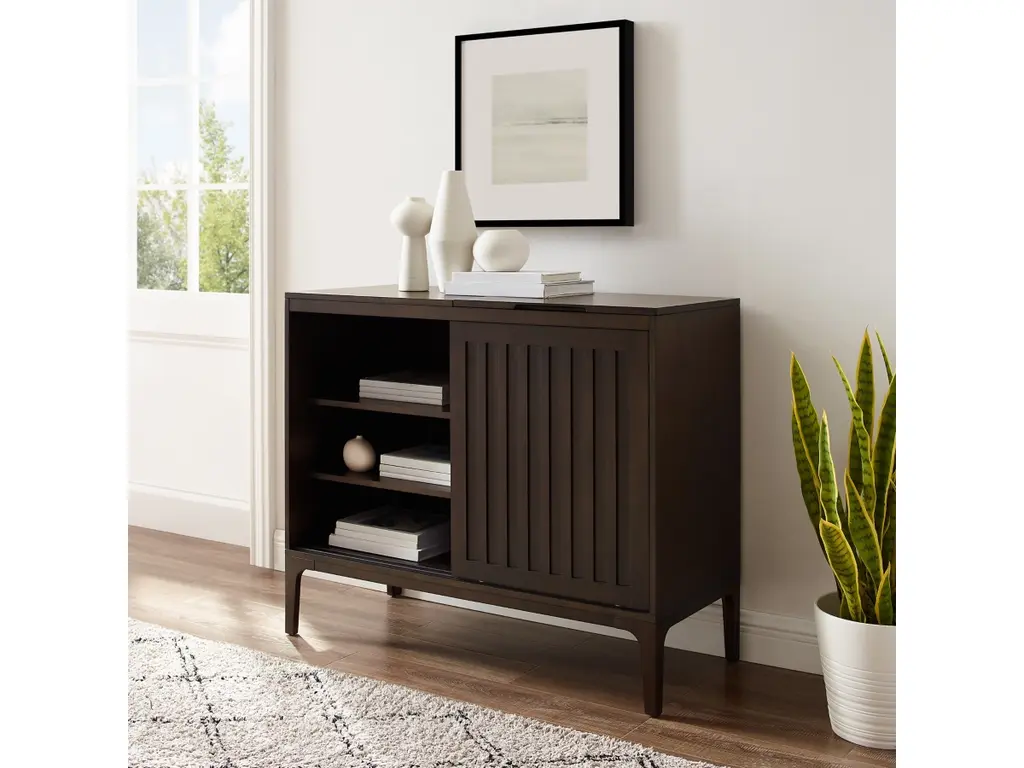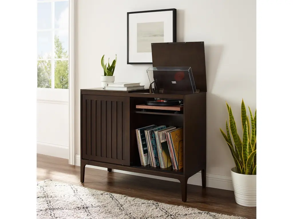 Get in the groove with the Asher Record Storage Media Console. This modern media console features a sleek profile and sliding doors with a slatted look. Whether you need a record player stand with storage or a stylish accent cabinet, this turntable stand fits the bill. With sliding cabinet doors that open to adjustable shelving on one side, and vinyl storage on the other, this media cabinet is a perfect addition to your home.