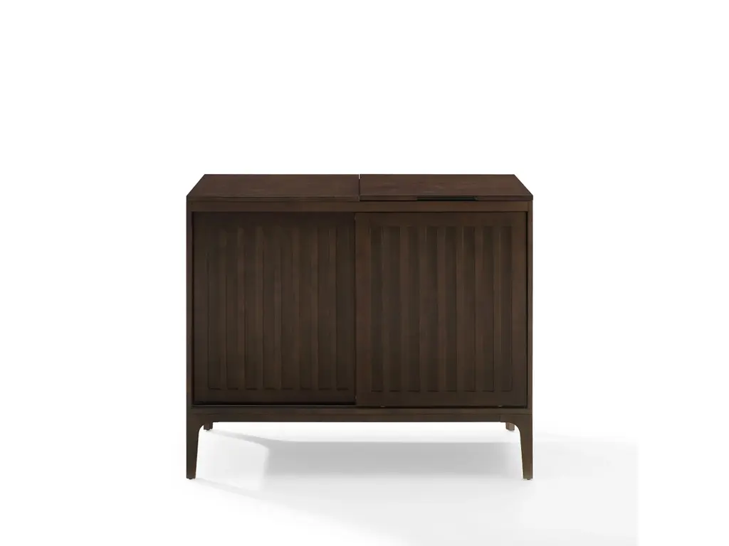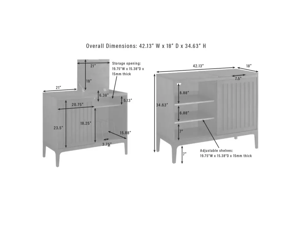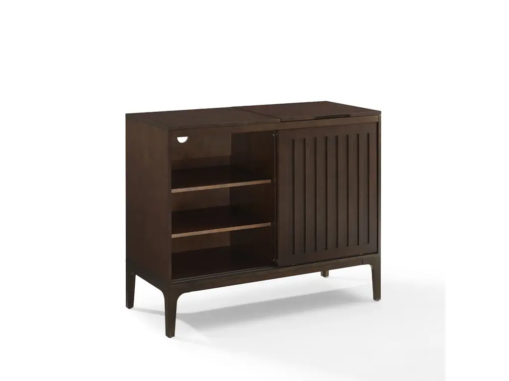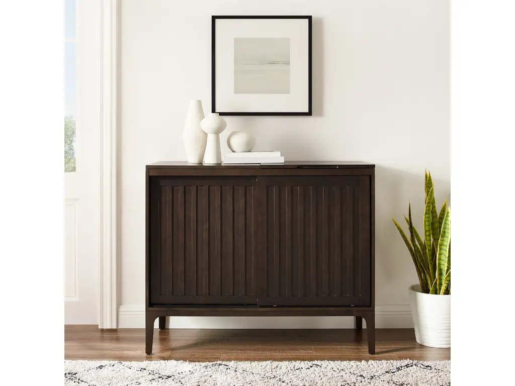 Get in the groove with the Asher Record Storage Media Console. This modern media console features a sleek profile and sliding doors with a slatted look. Whether you need a record player stand with storage or a stylish accent cabinet, this turntable stand fits the bill. With sliding cabinet doors that open to adjustable shelving on one side, and vinyl storage on the other, this media cabinet is a perfect addition to your home.