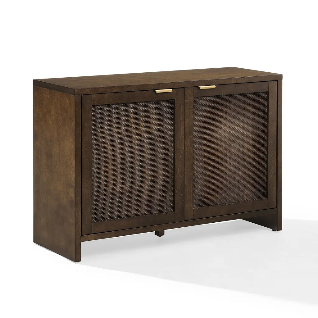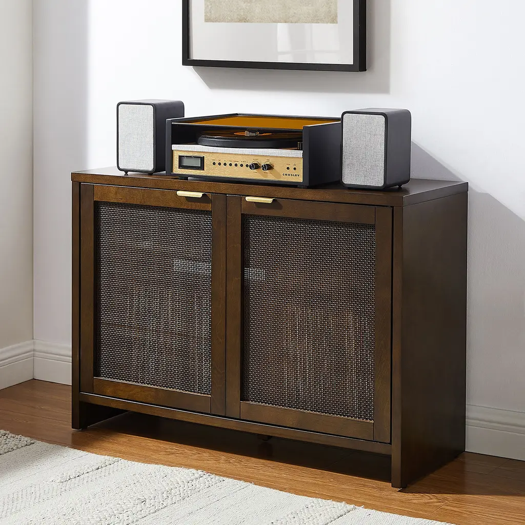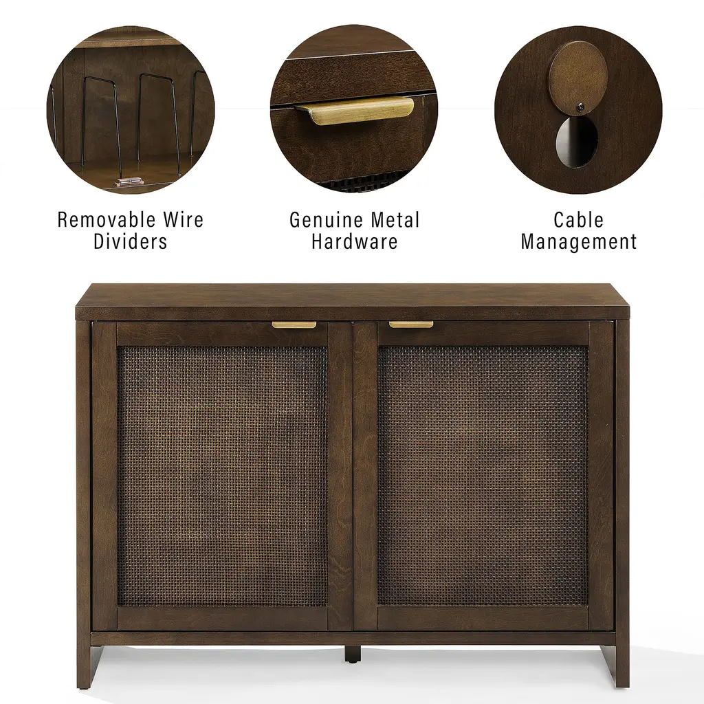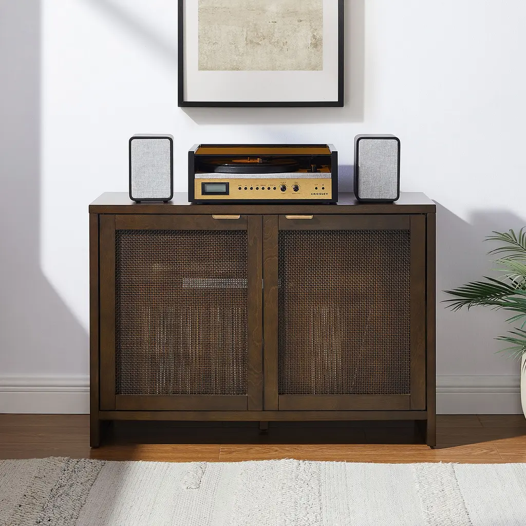 There's plenty of space on this stylish console for your record player and external speakers. Behind the cabinet doors are two shelves for holding large record collections and decor. Complements nearly any home style, and looks great as an entryway table or accent piece.