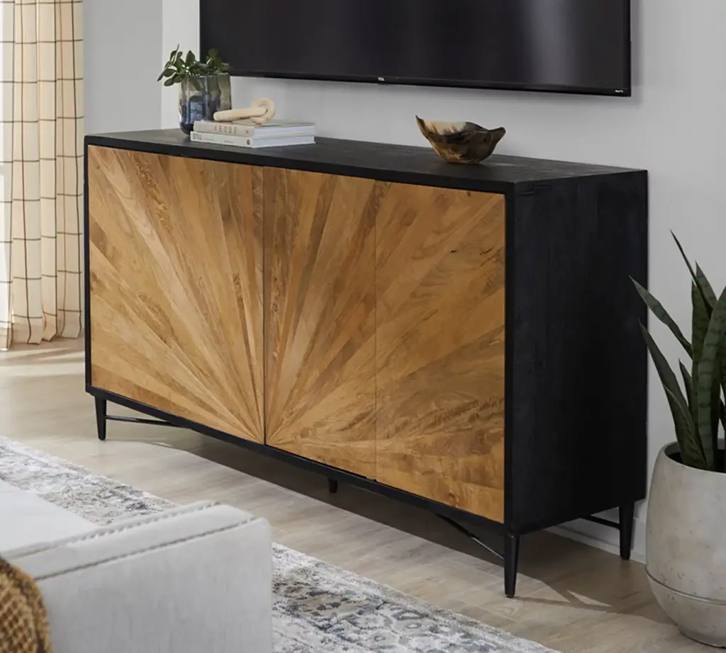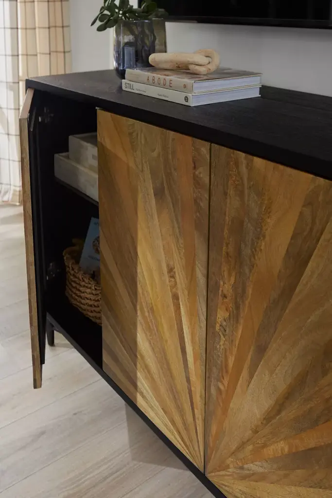 With a two-toned finish and eye-catching design, our Cyrus entertainment console is a true showpiece. This entertainment console features a natural mango wood finish on the four doors which are inlaid with mango wood pieces that create a bold starburst pattern. An adjustable shelf behind each set of doors offers storage space for your tech devices.