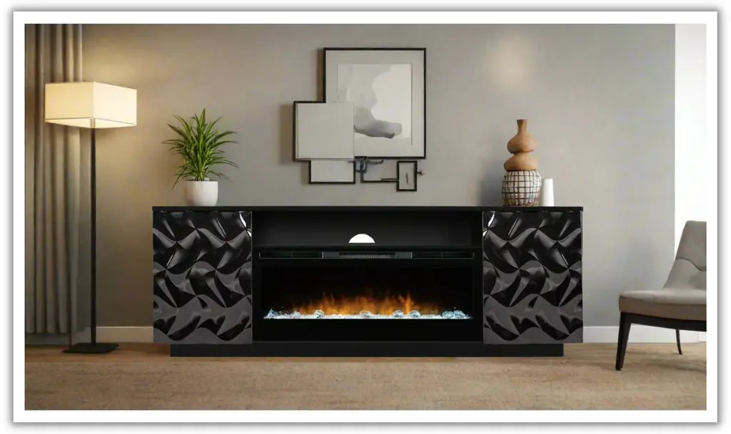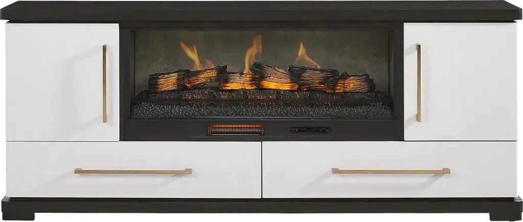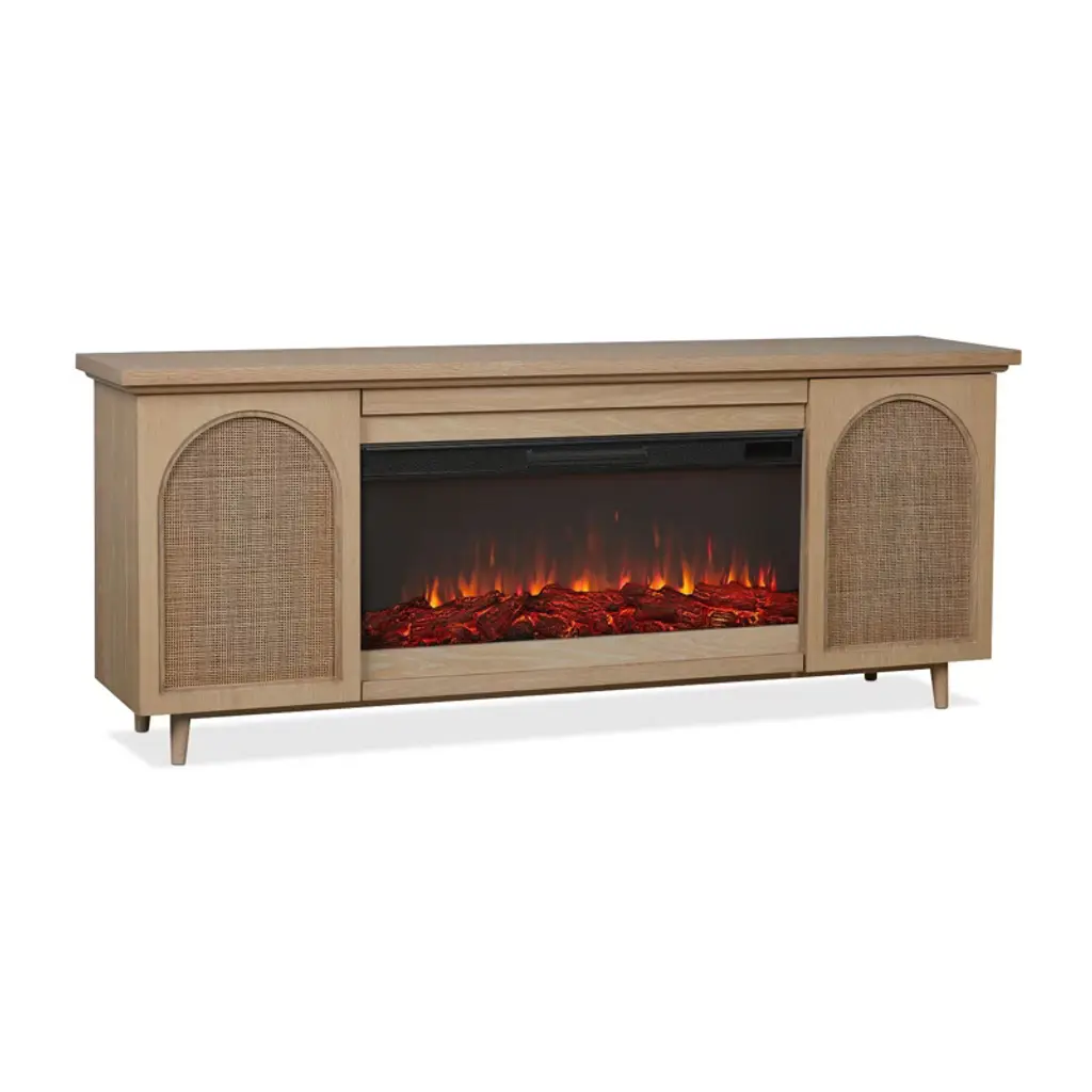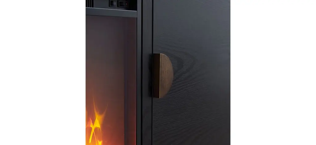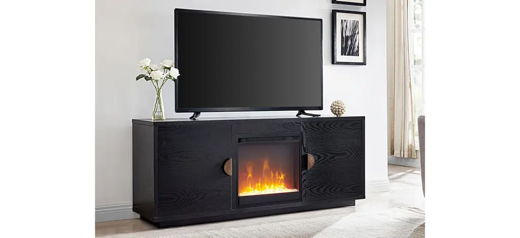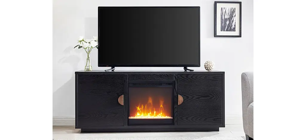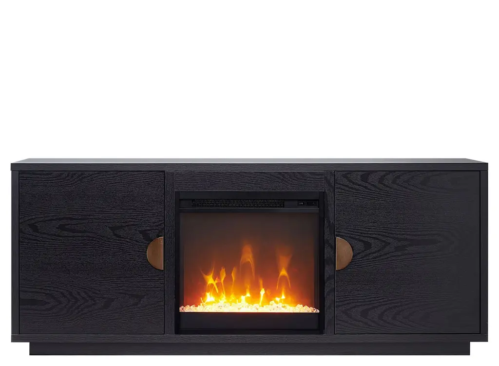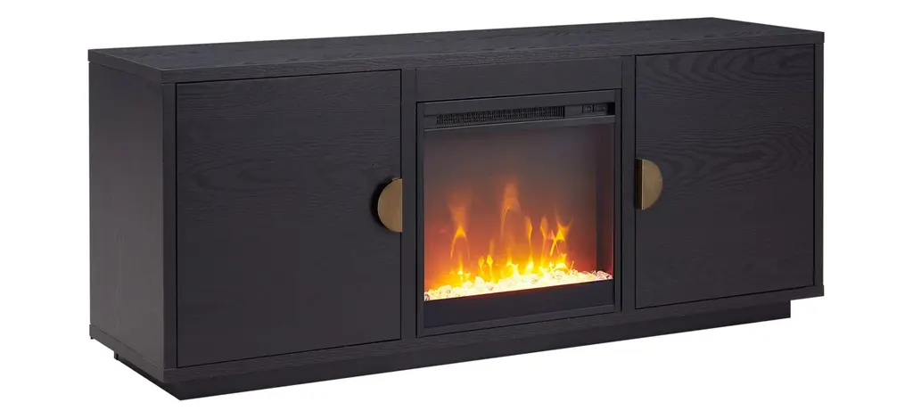 Combine functionality and on trend mid-century design with this modern Dakota TV Stand with Crystal Fireplace. Its rich wood tone creates a warm neutral palette that will blend seamlessly into any color scheme, while its subtle retro styling pairs perfectly with the existing design inspiration of your living room, den, or game room. This sturdy stand features two enclosed cabinets with sleek half-moon hardware. Cable management cut-outs and adjustable inner shelves keep your media storage and consoles organized while the LED flames and electric heater keep you cozy and warm for movie night, the big game, or binging your favorite shows.