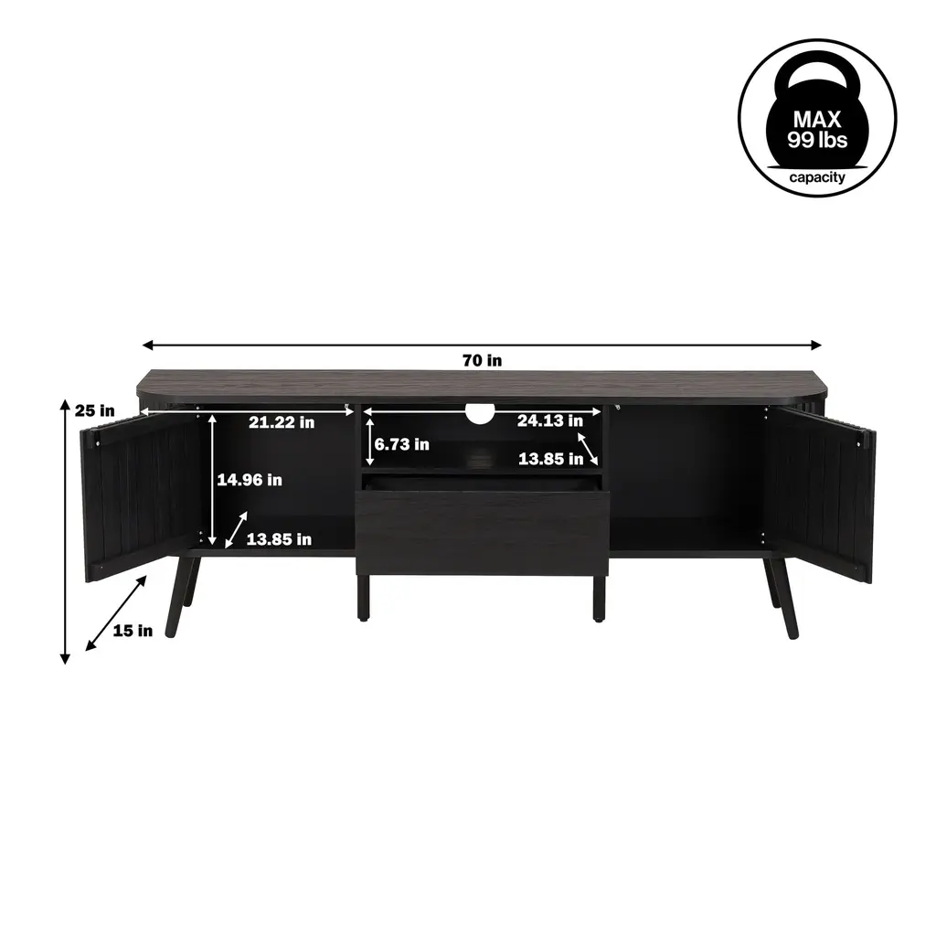 Bring an art deco flare to your TV room with this unique D-shaped curved console. At 70 inches wide, this is the perfect console to anchor a 75" TV in your living room or den. This console complements any bohemian or contemporary home.