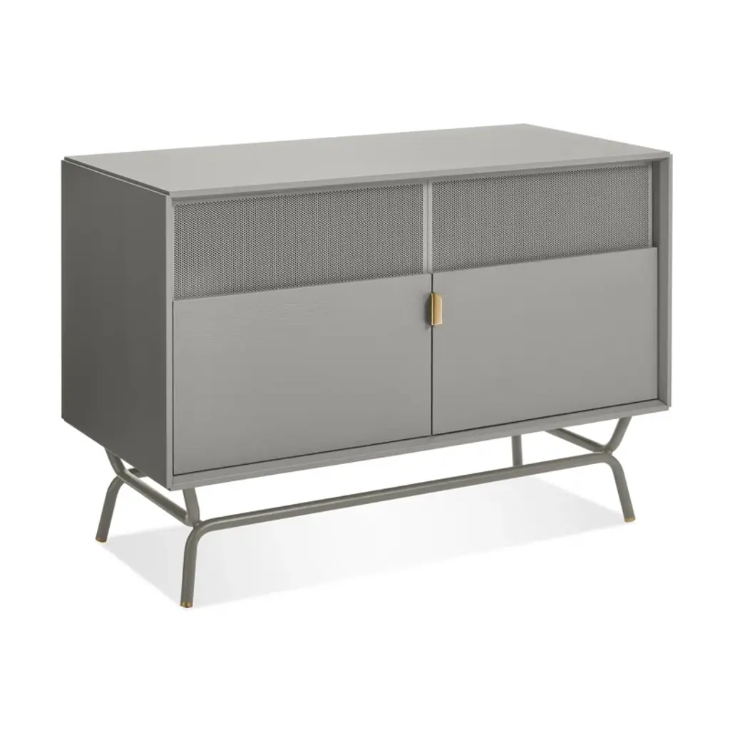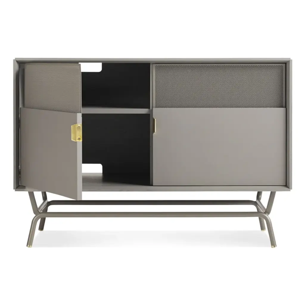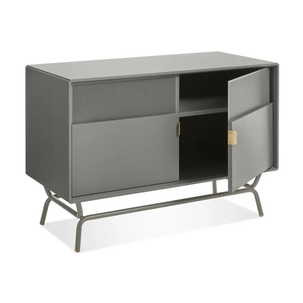 The Blu Dot Dang media stand is no cause for frustration - on the contrary, its perforated doors allow the use of remotes without having to keep the doors open, avoiding annoying visual obstructions. Bright brass handles bring a bit of bling to the powder-coated steel doors and wood cabinet and add a pop of mid-century modern personality.