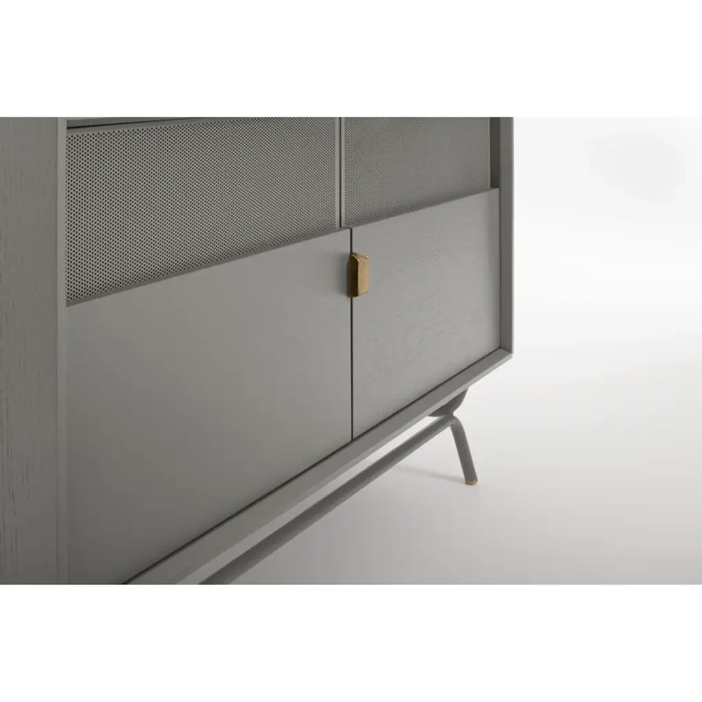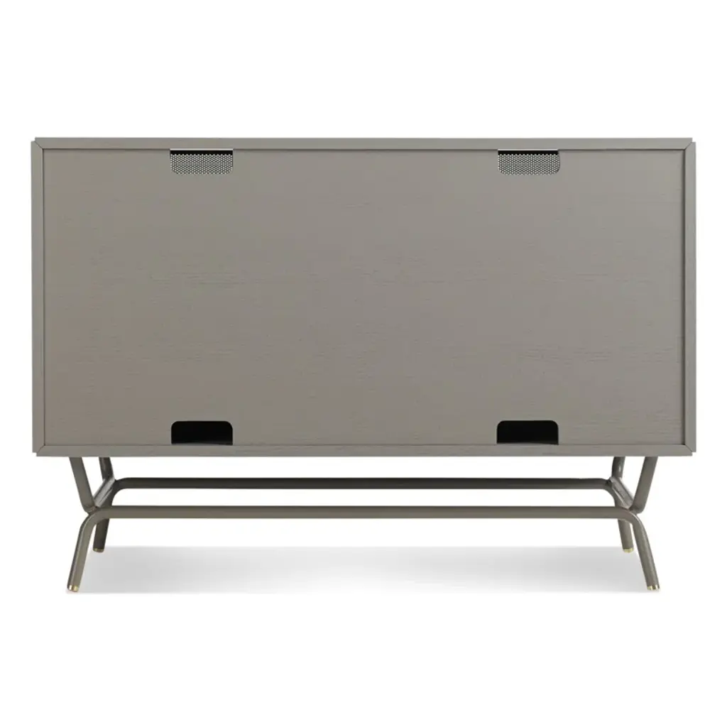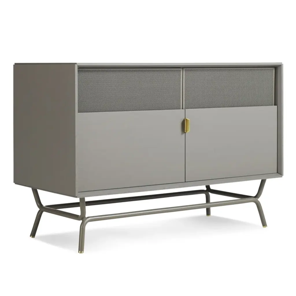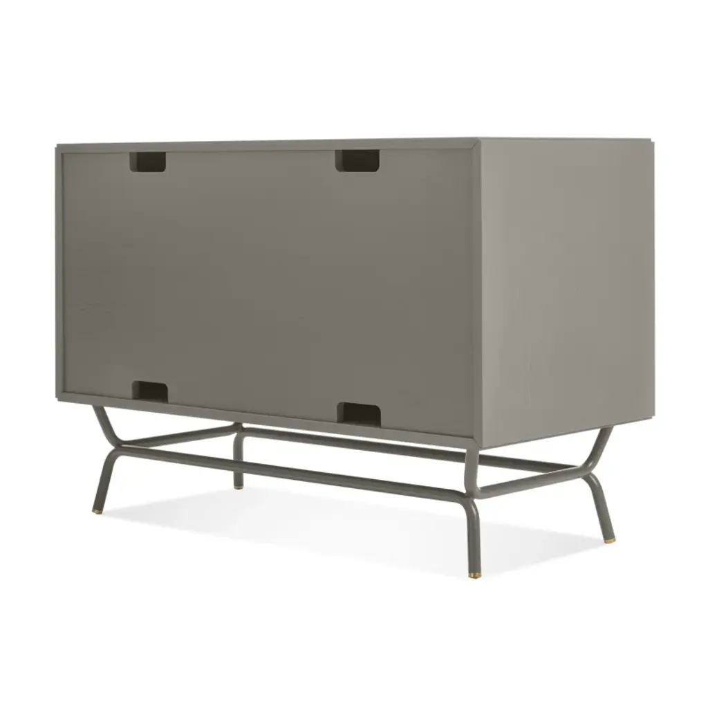 The Blu Dot Dang media stand is no cause for frustration - on the contrary, its perforated doors allow the use of remotes without having to keep the doors open, avoiding annoying visual obstructions. Bright brass handles bring a bit of bling to the powder-coated steel doors and wood cabinet and add a pop of mid-century modern personality.